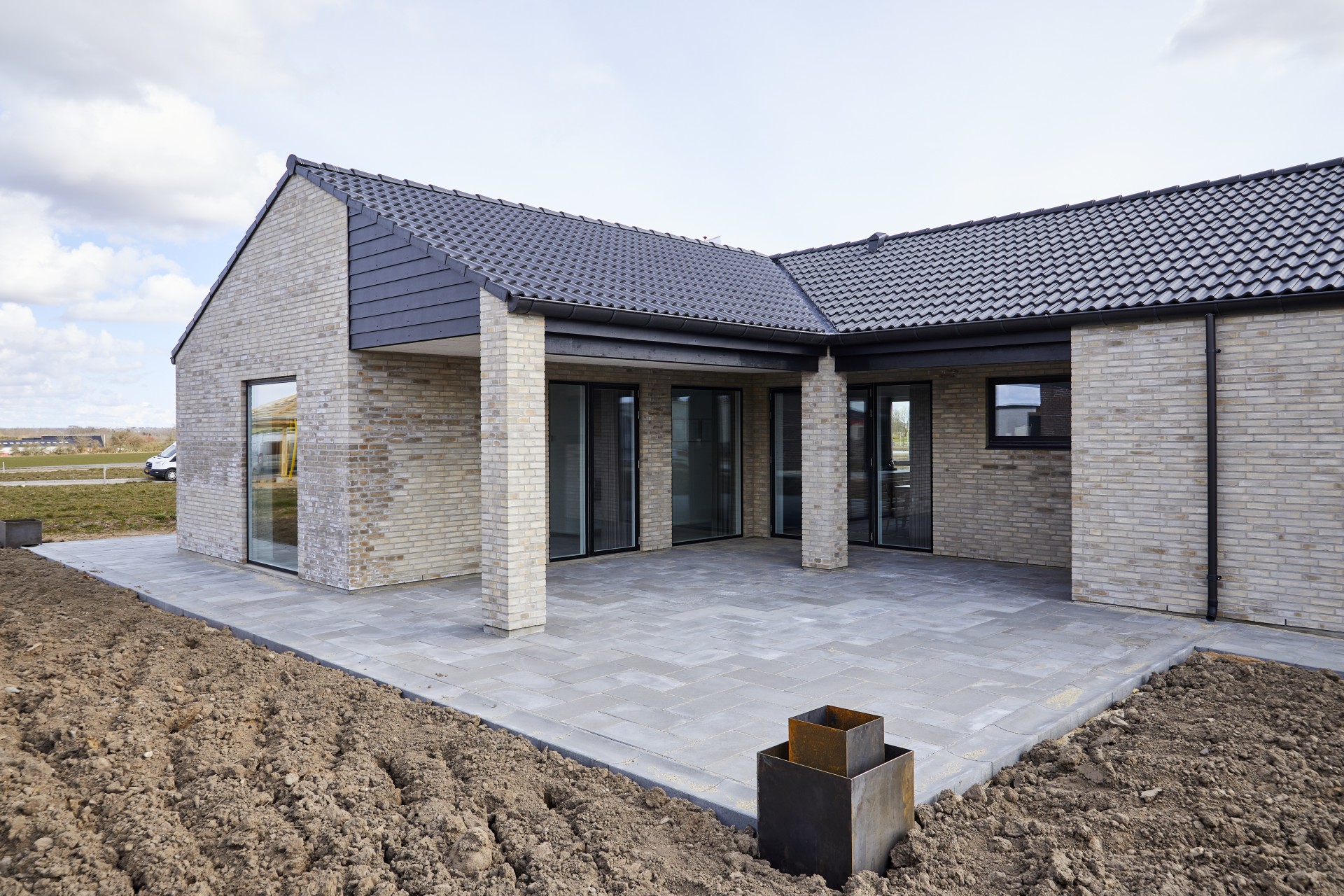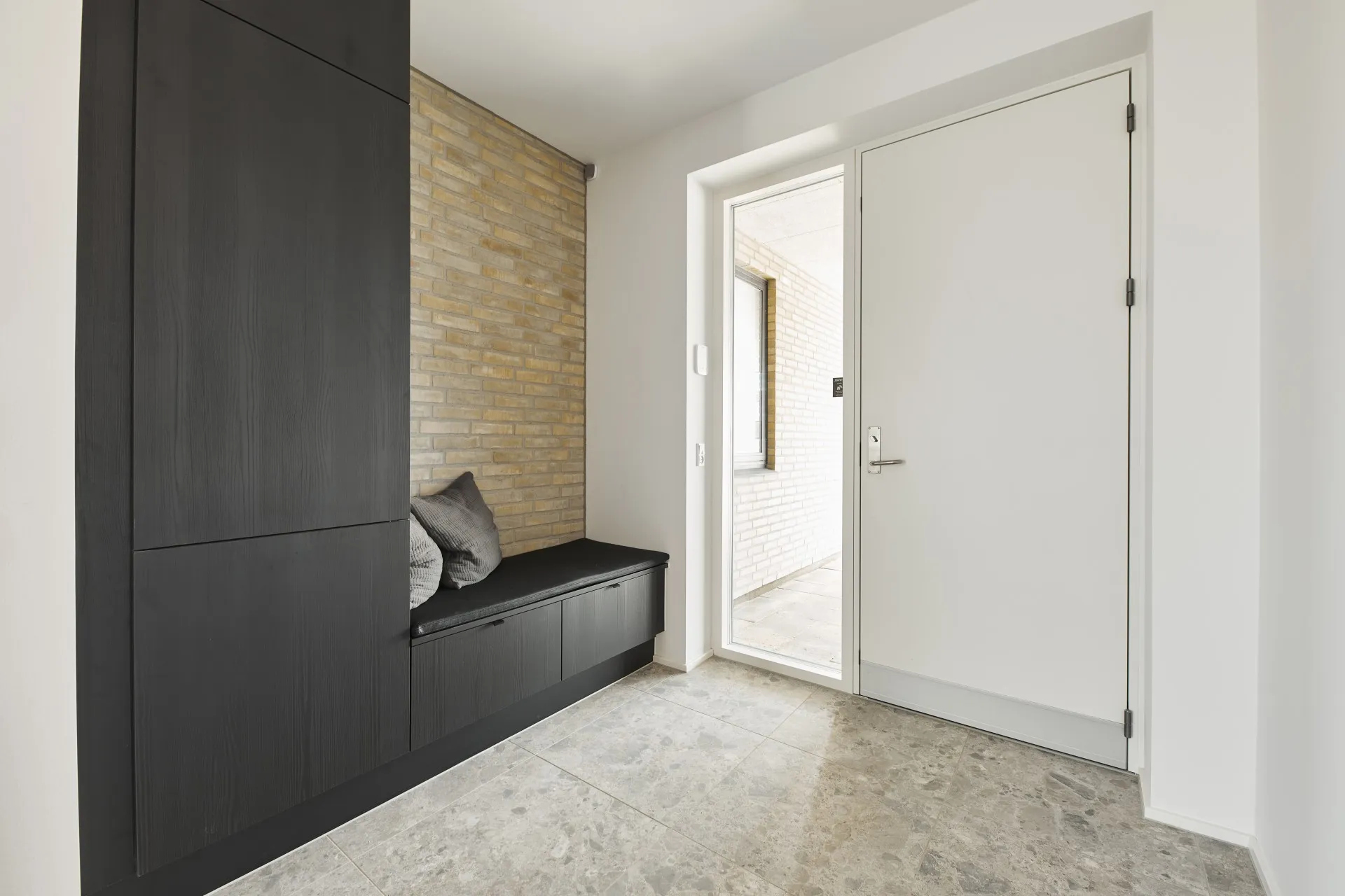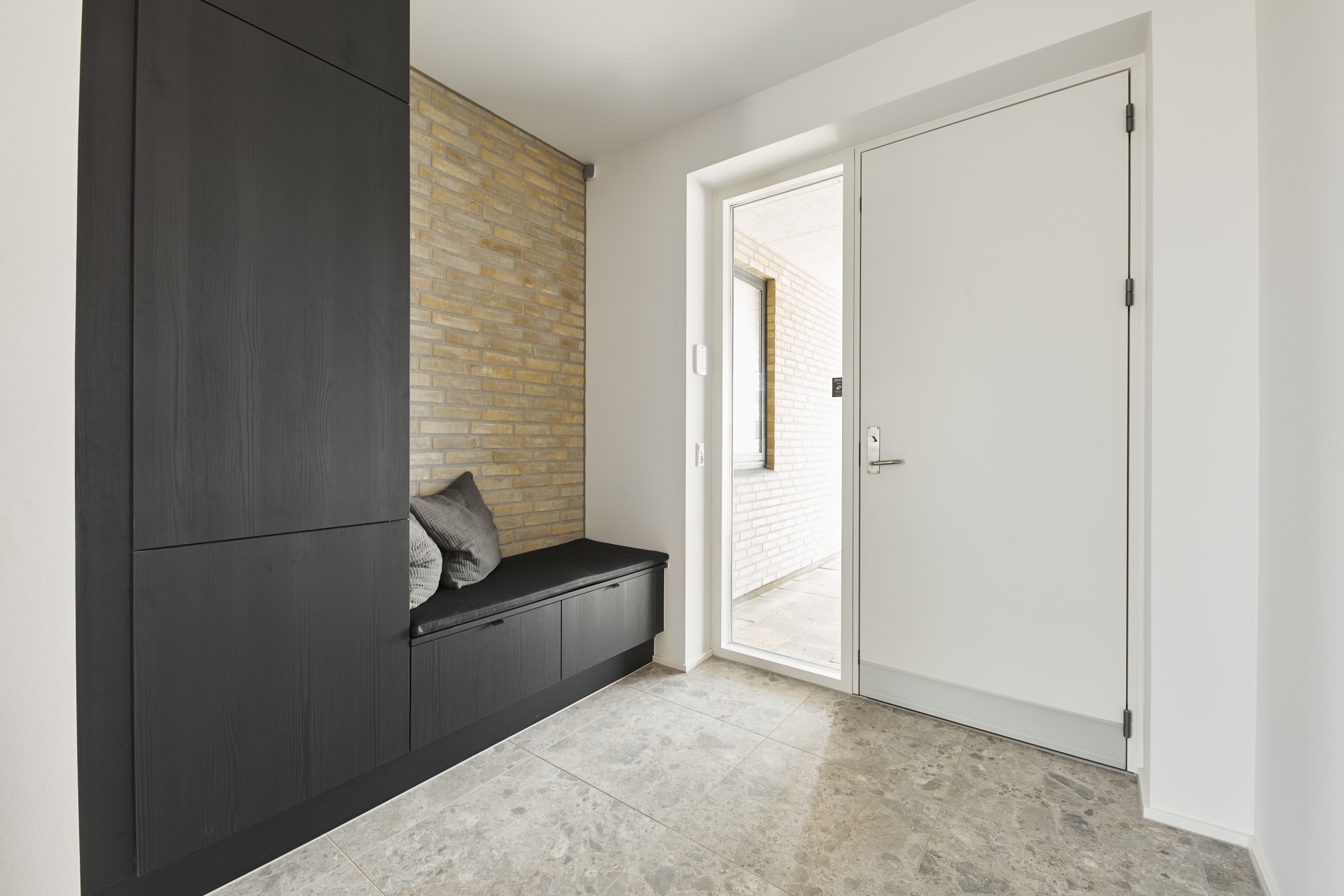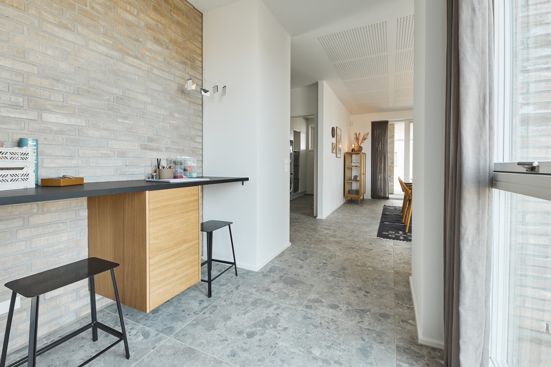 Mursten: Cold Hawaii. Klinker: Ragno Eterna Gråmix. Gulv: Midi-Plank natureg