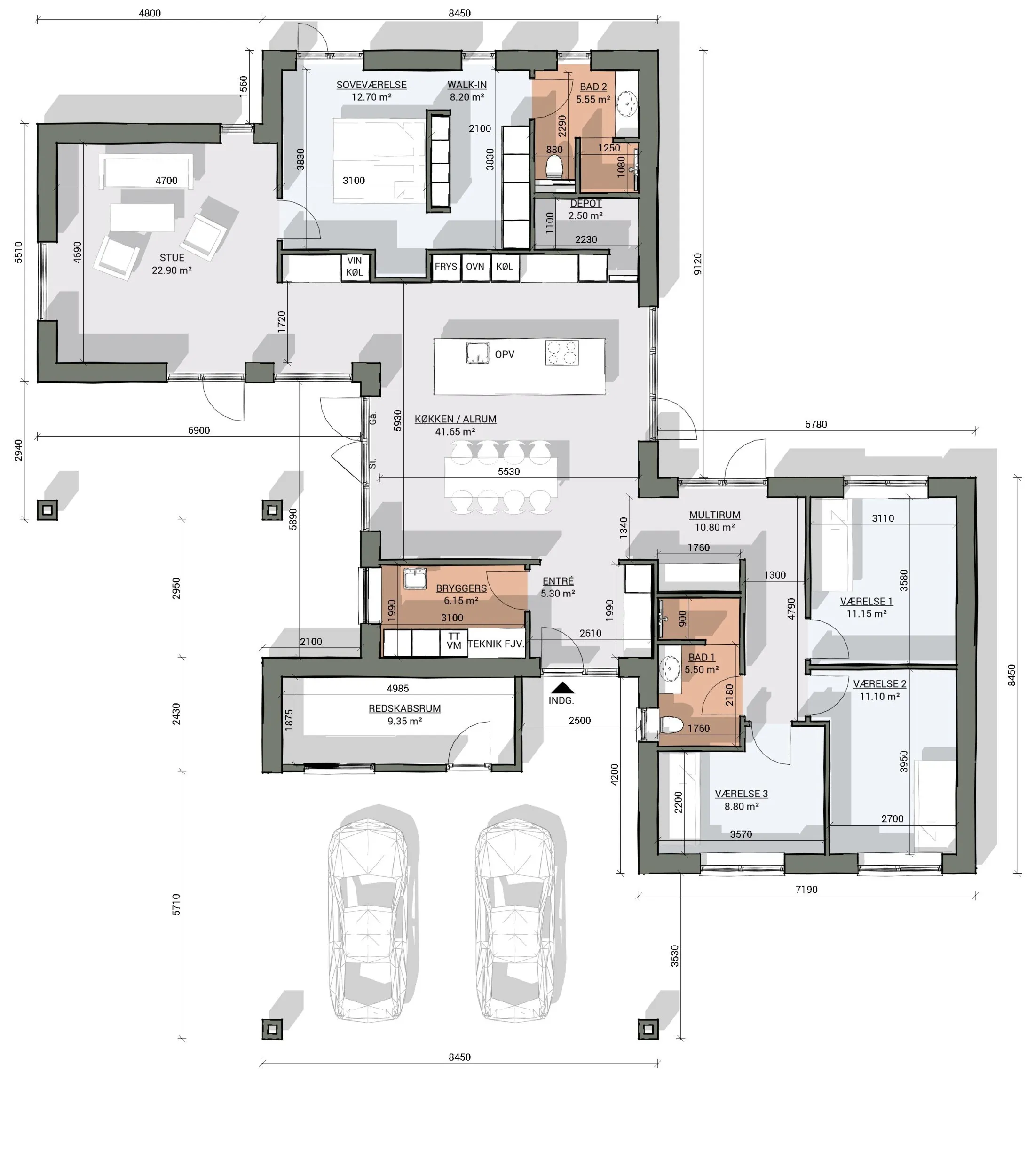 Bolig: 185 m2. Carport: 55 m2.