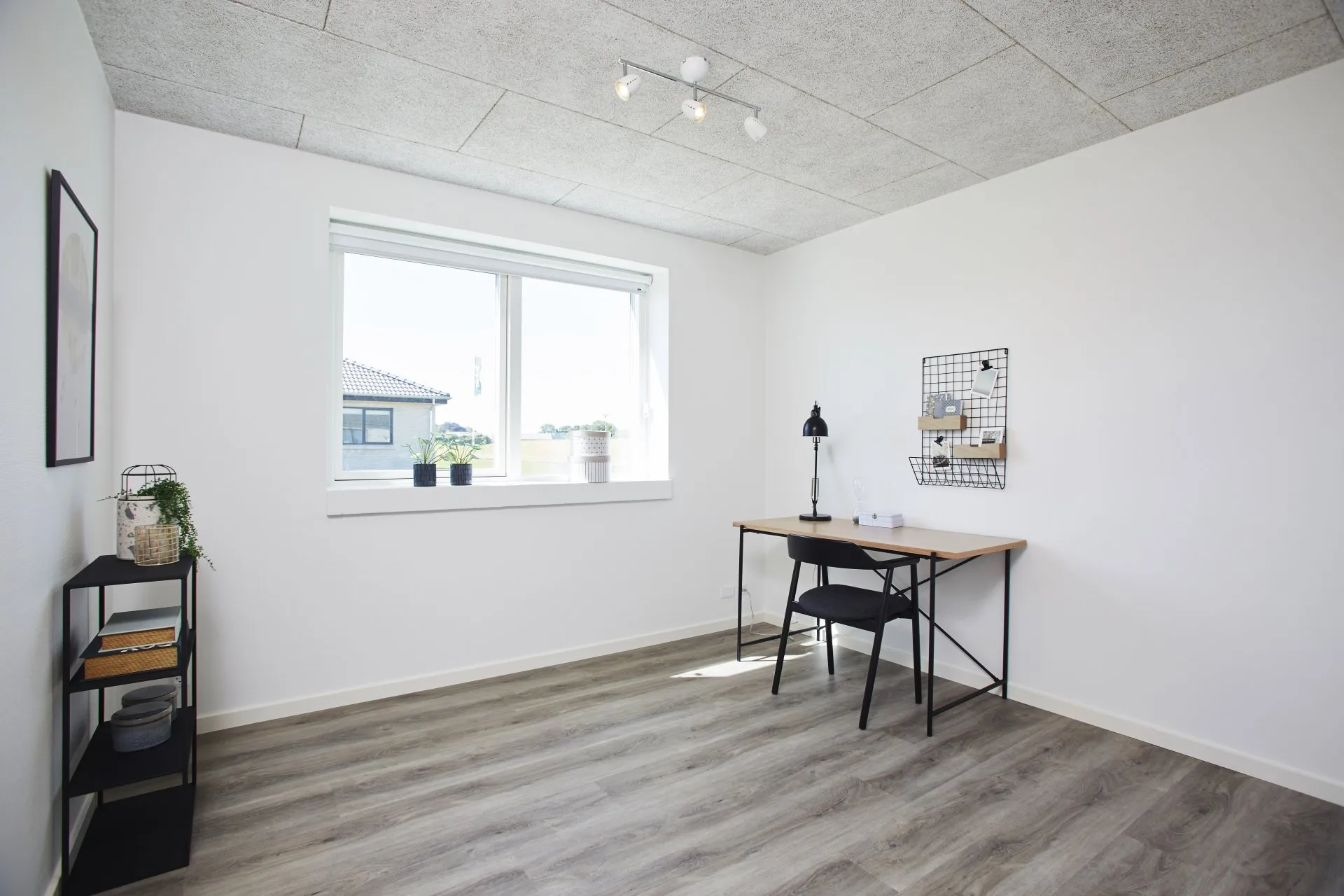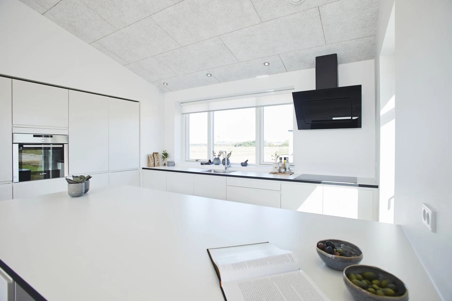 Troldtekt lofter, skråloft og vindueskarme med murede rulleskifte.
