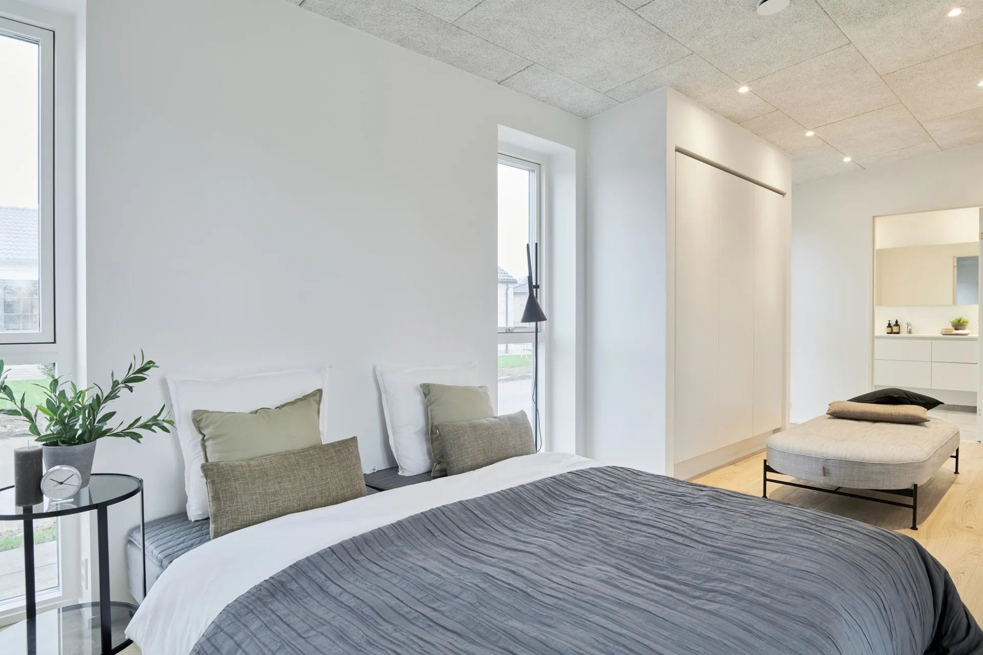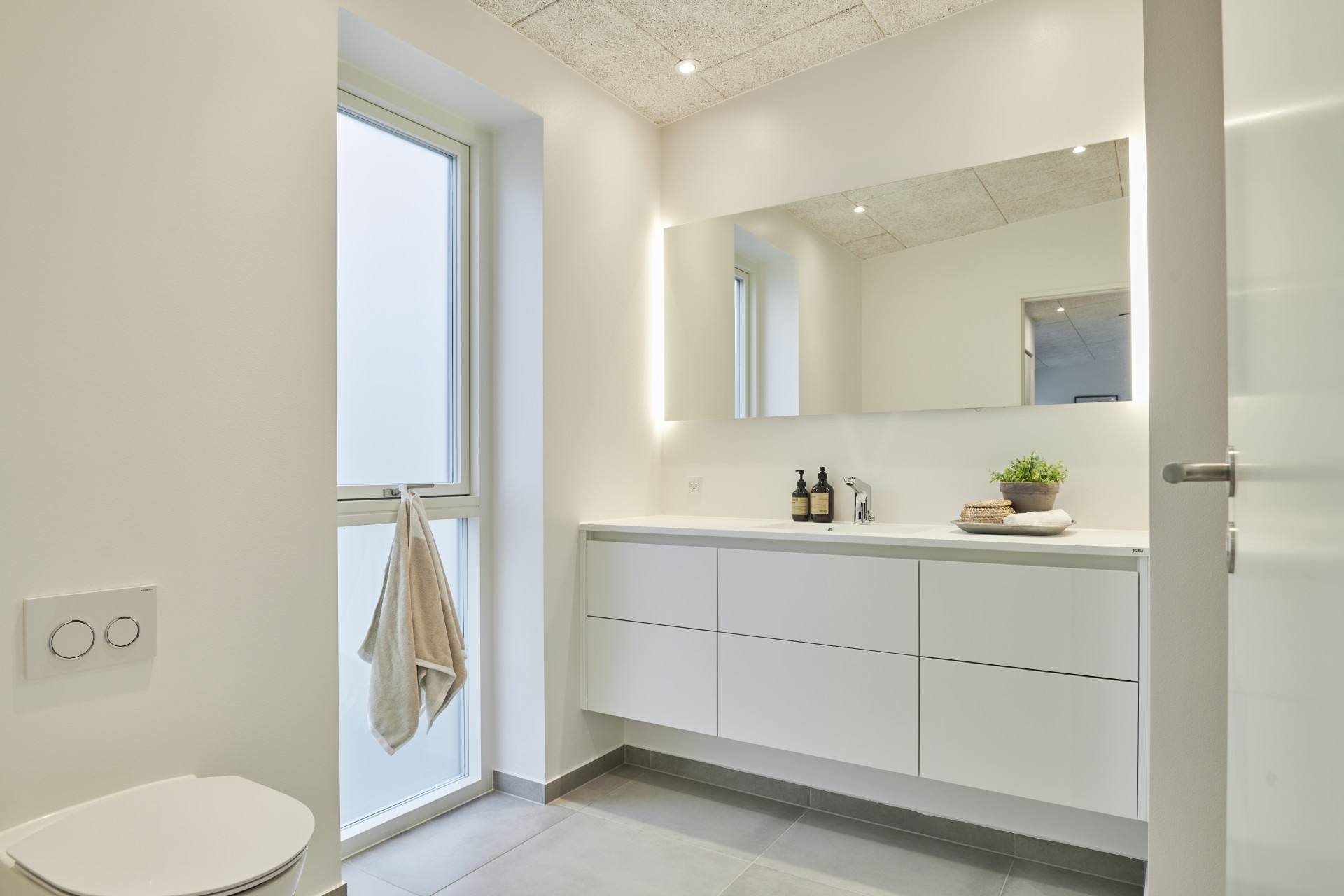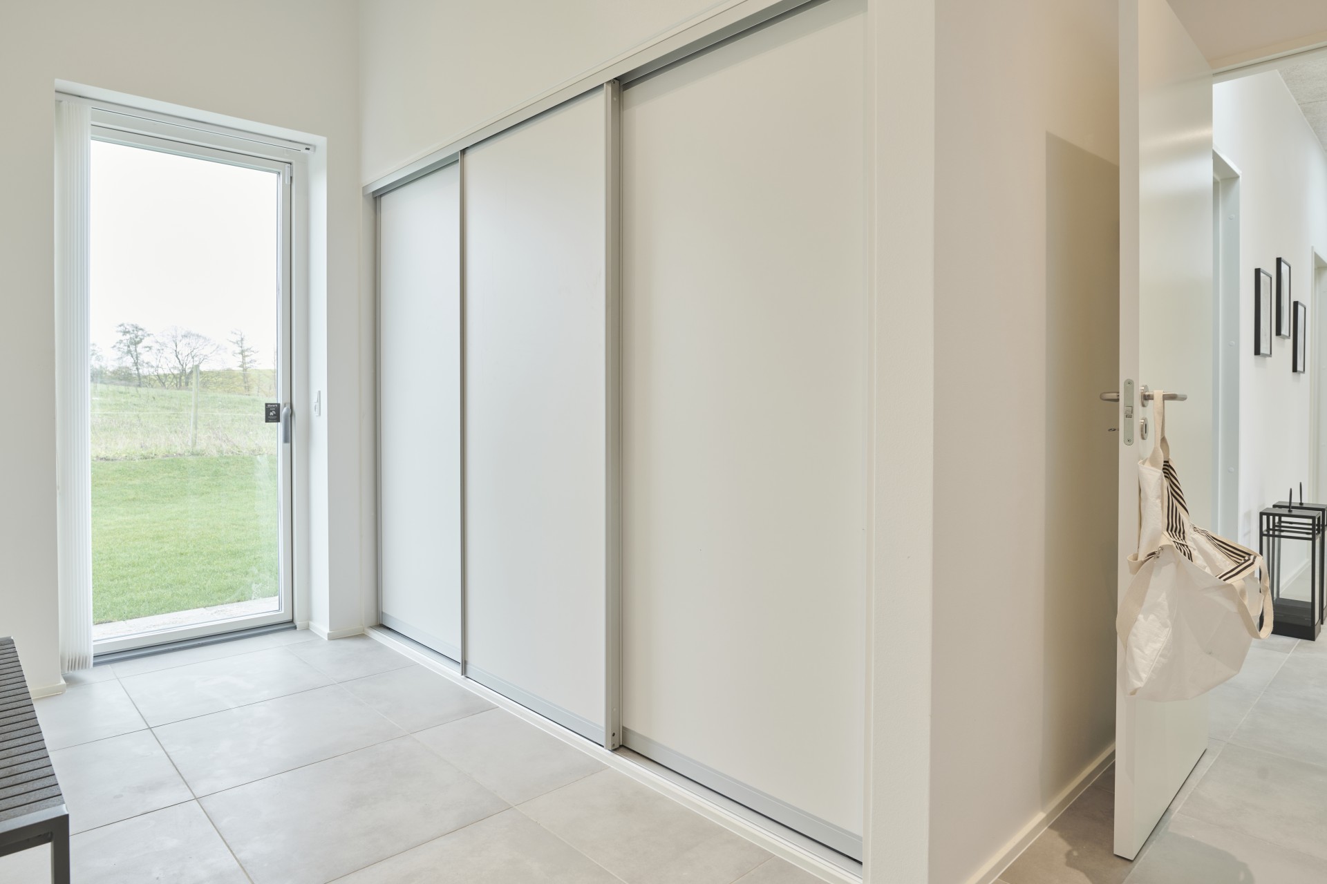 Siddebænk i entréen, walk-through og overdækket terrasse.