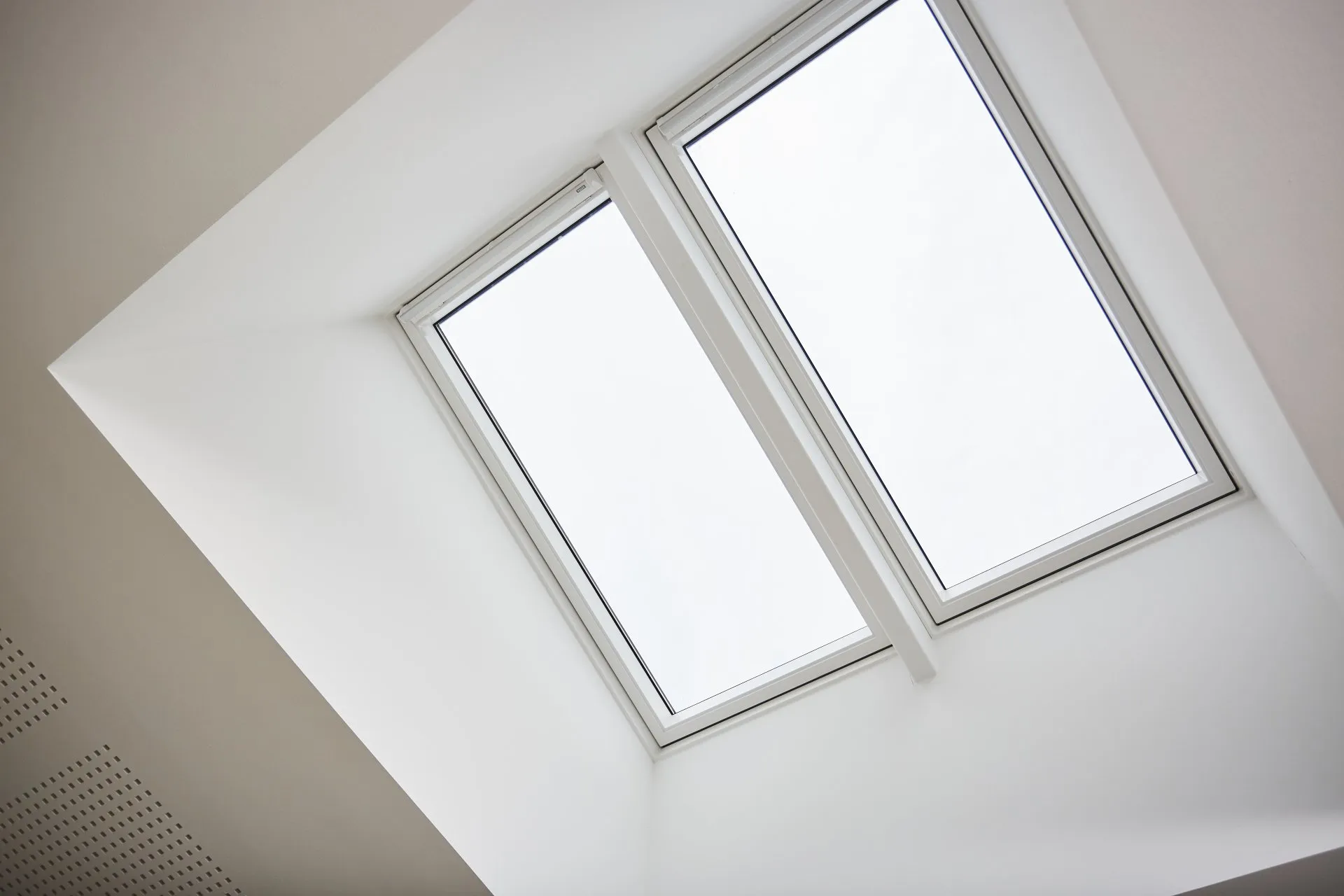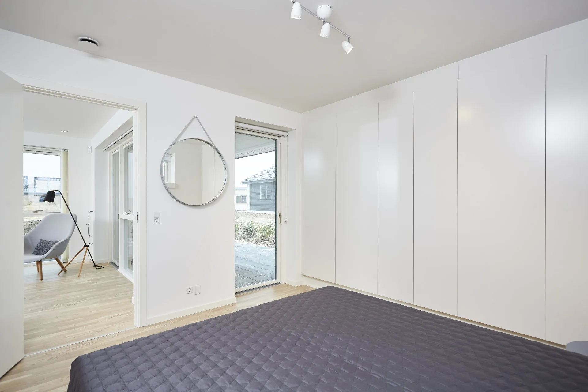 Dobbelte franske døre, skabsvæg og ovenlysvinduer.