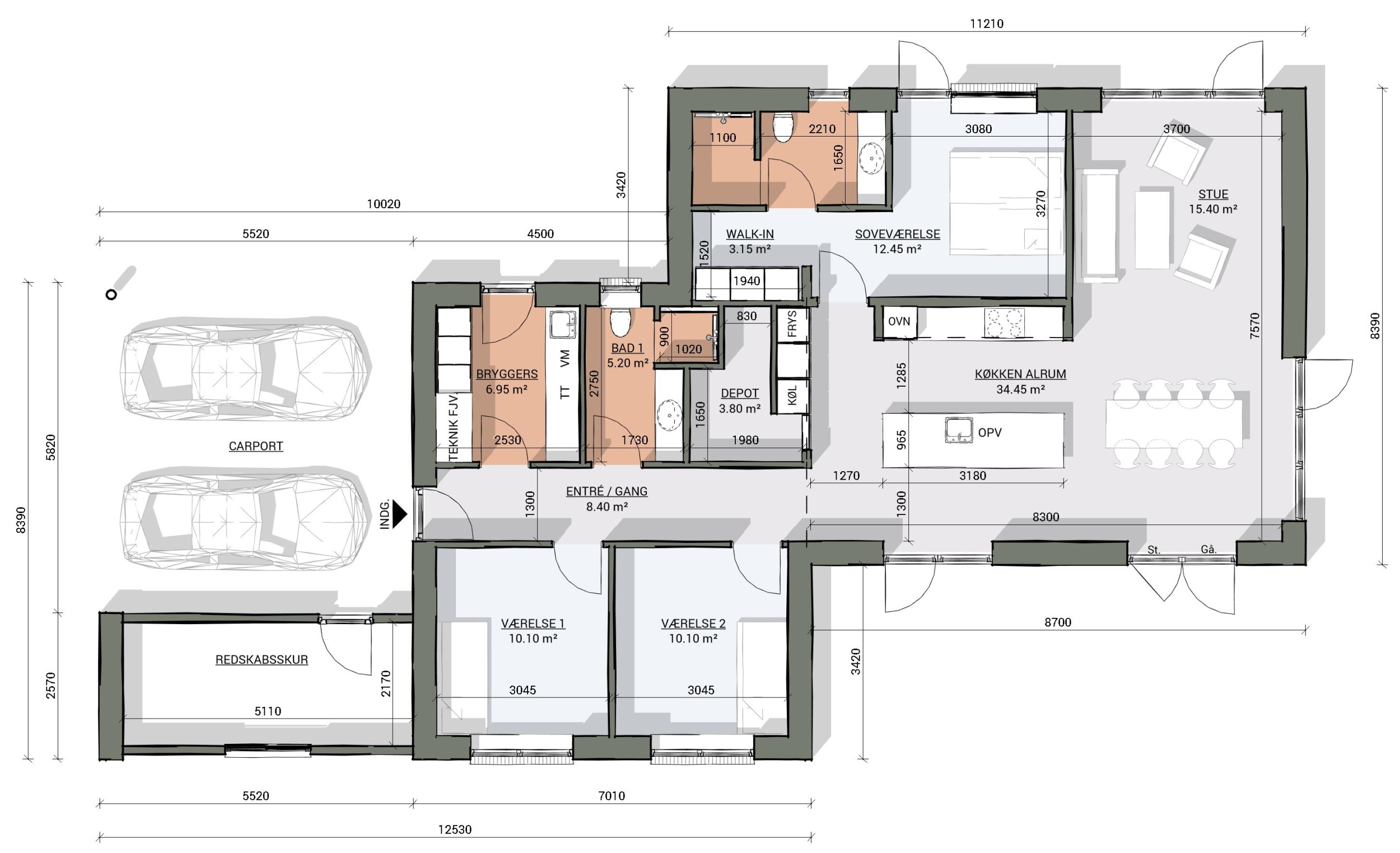 Skjult depotrum, skråloft i køkken/alrum og stue og walk-in.