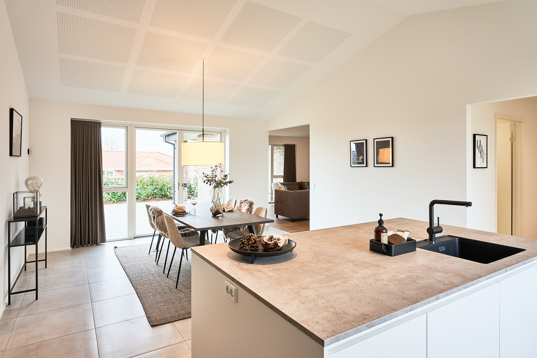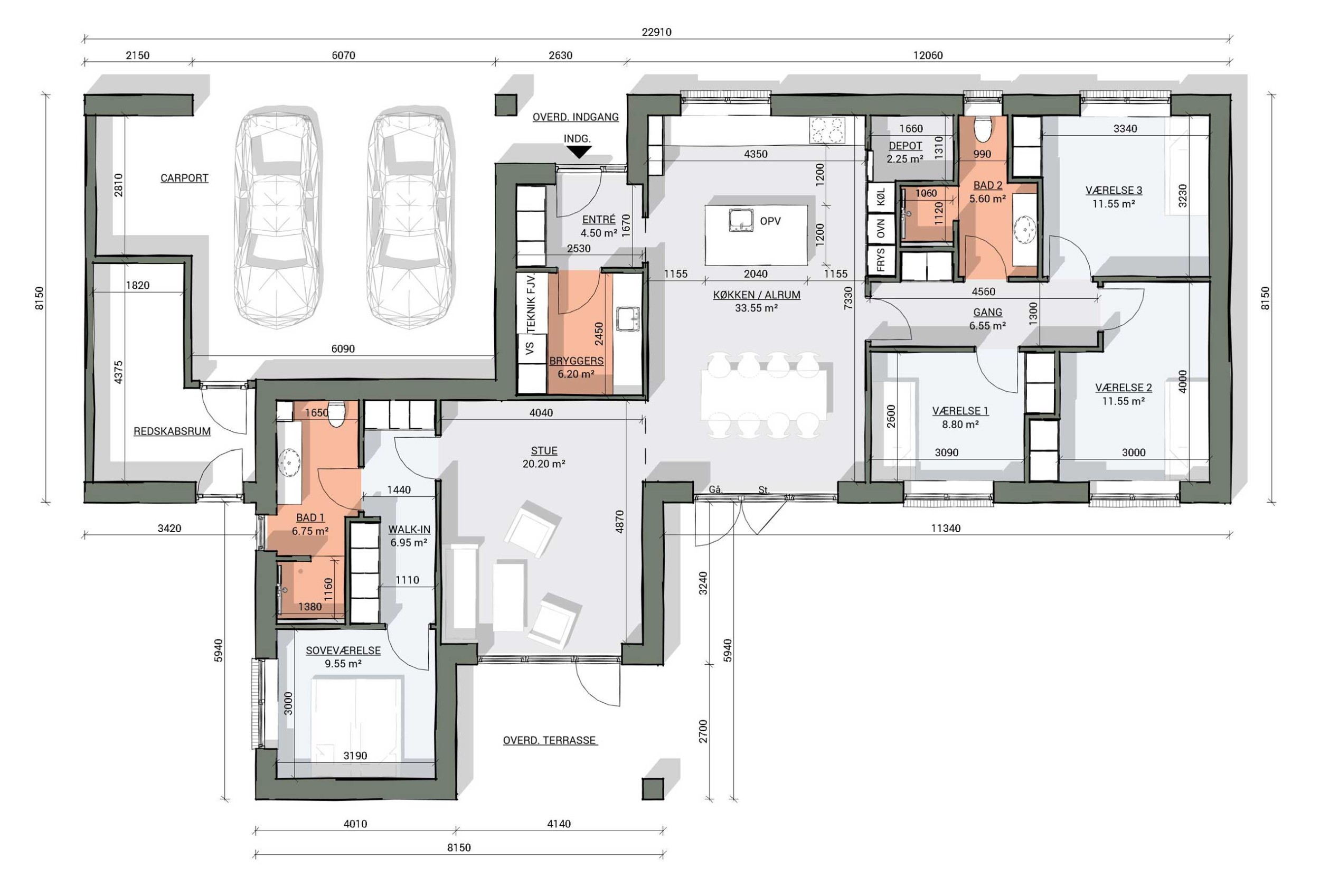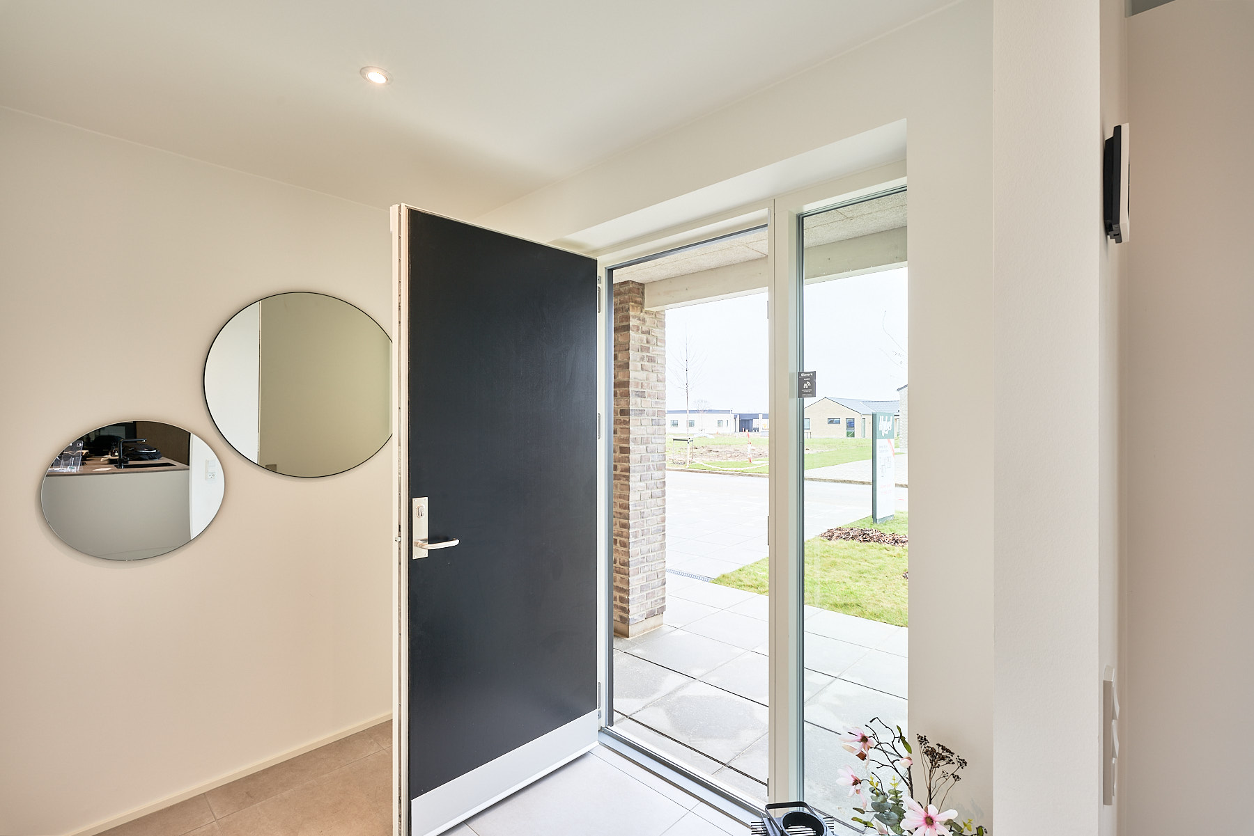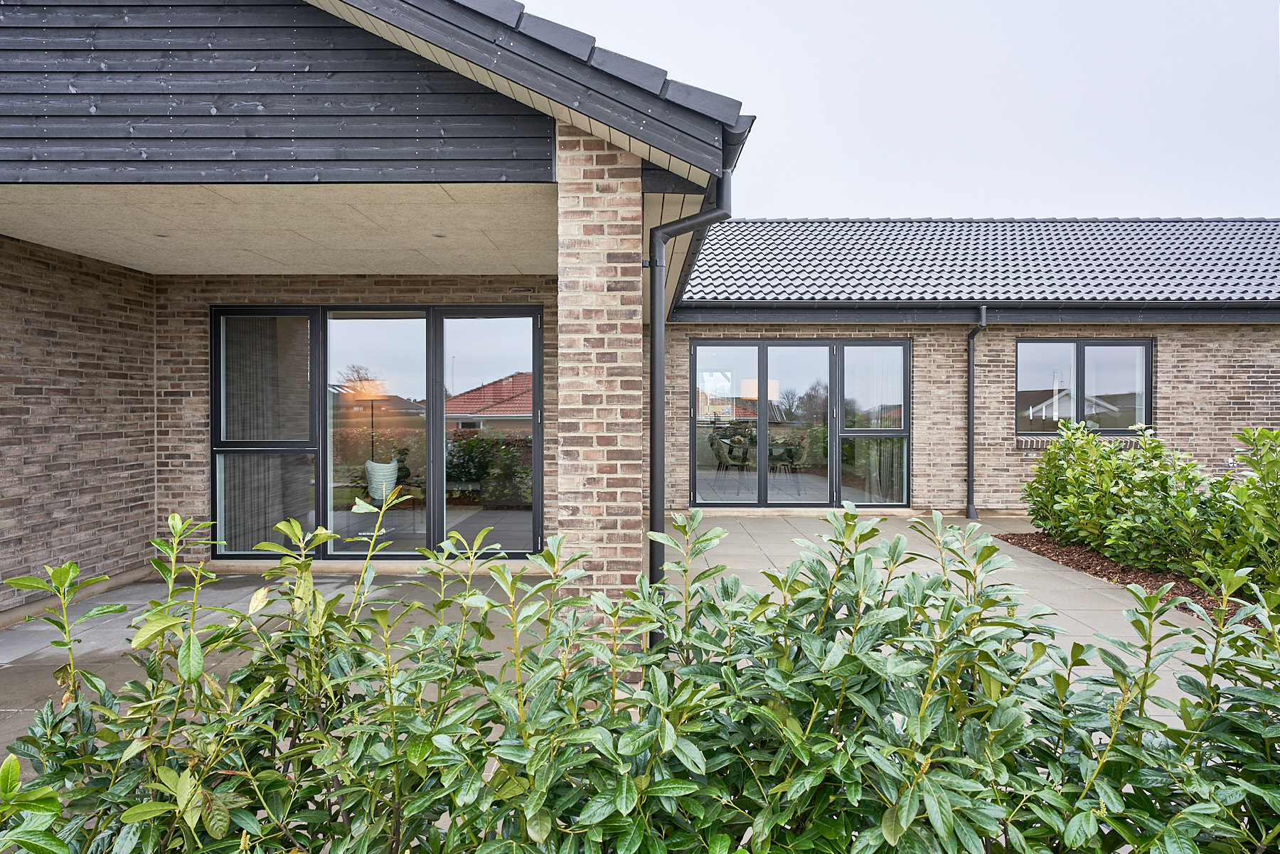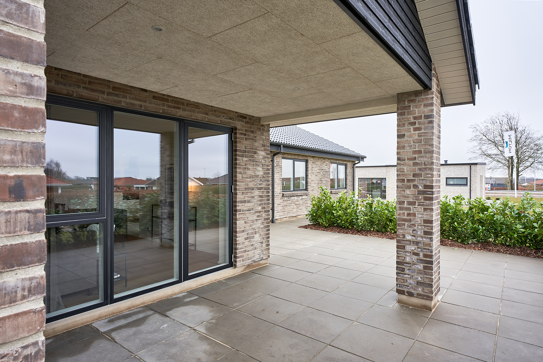 Overdækket indgang, overdækket terrasse og gennemgående køkken/alrum.