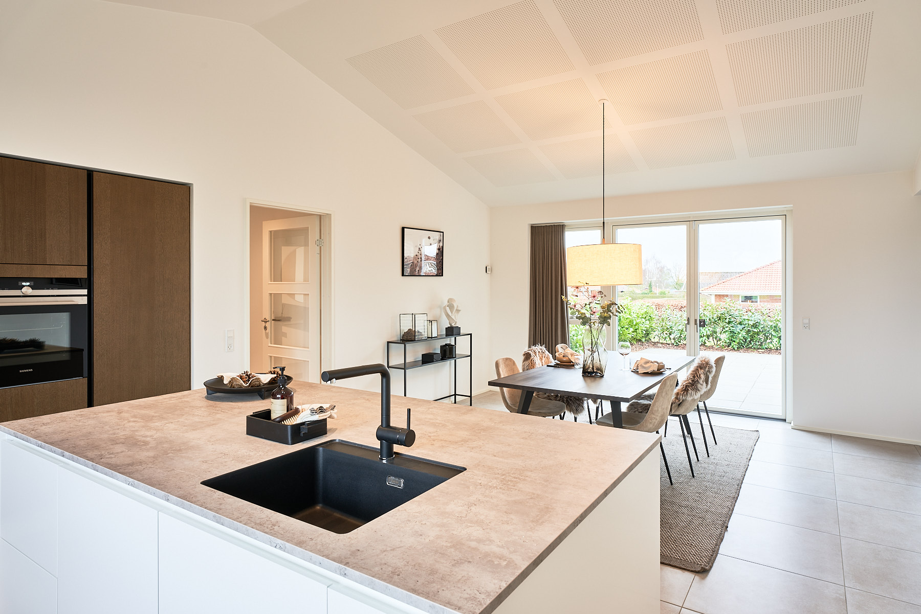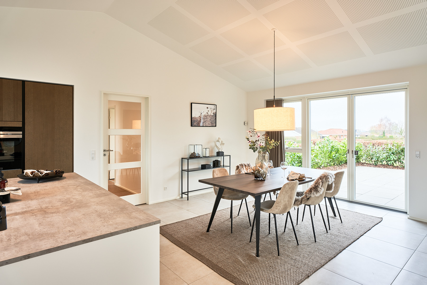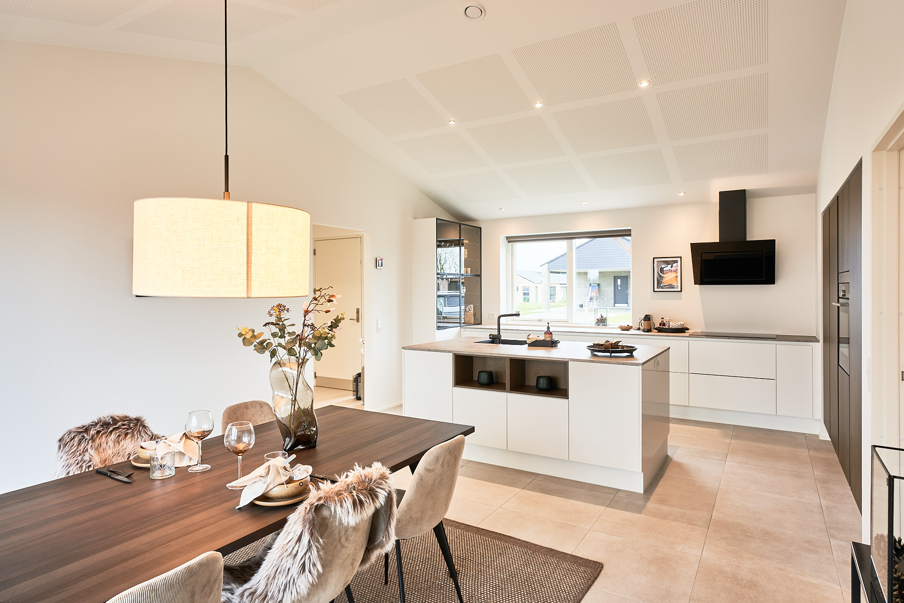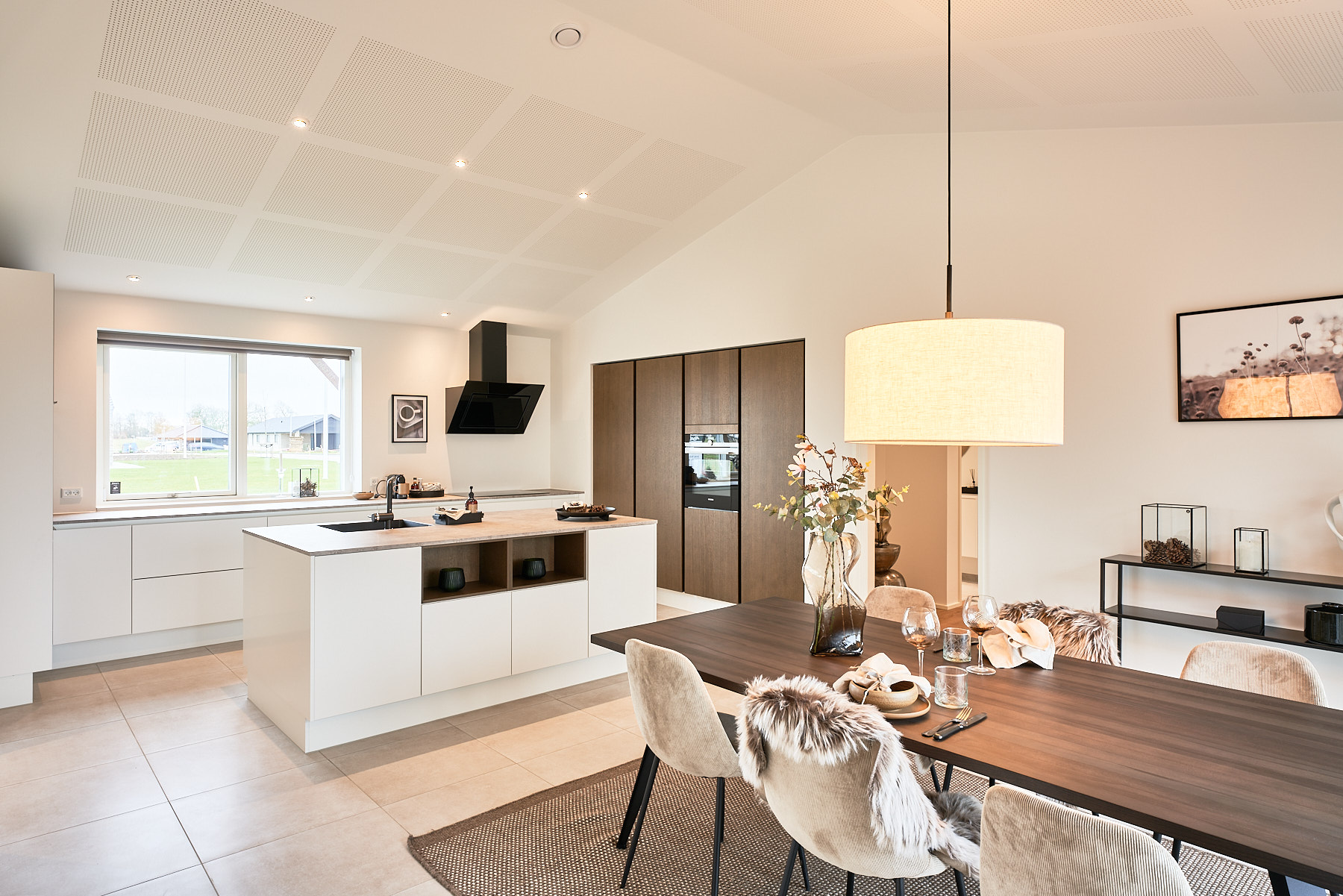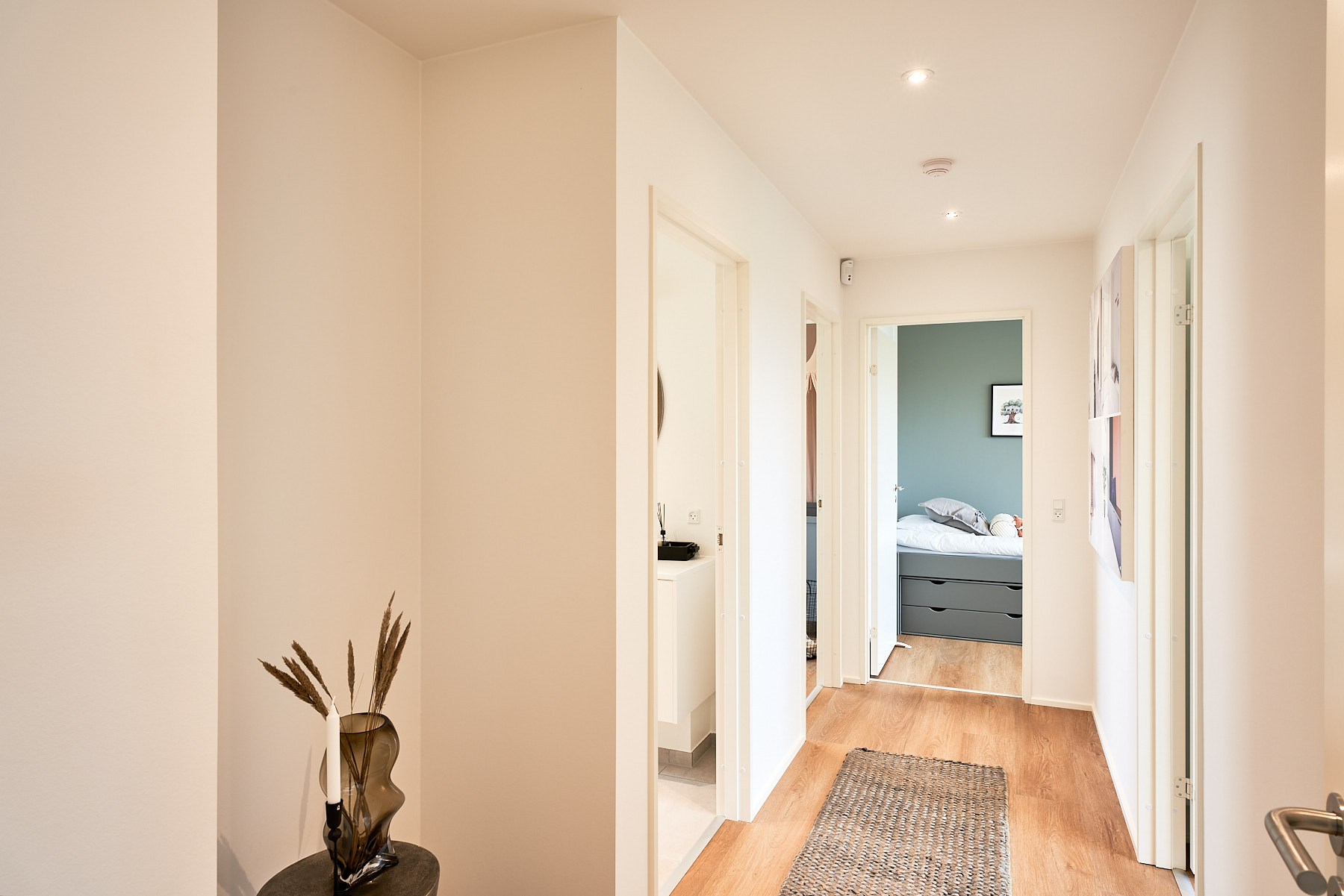 Overdækket indgang, overdækket terrasse og gennemgående køkken/alrum.