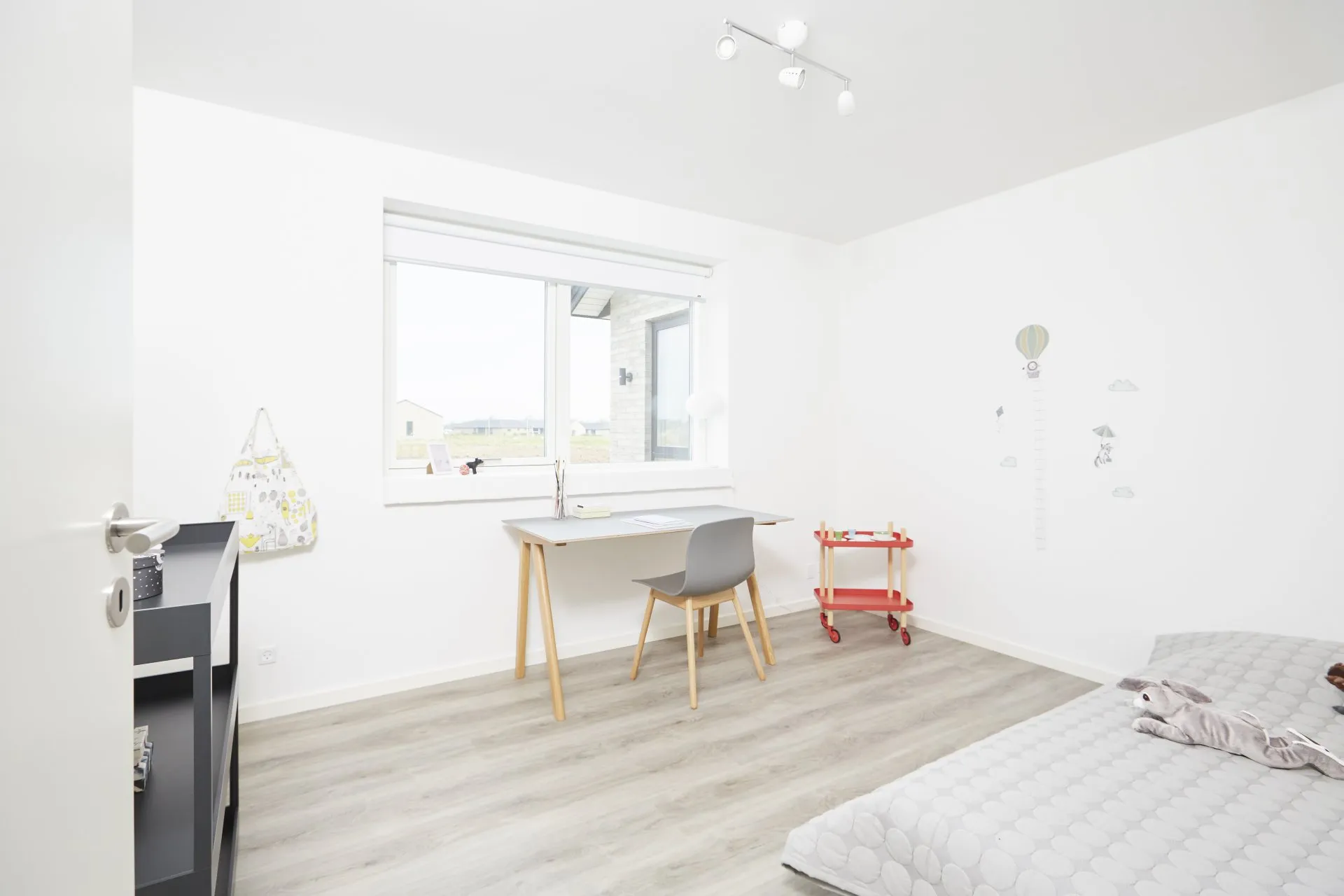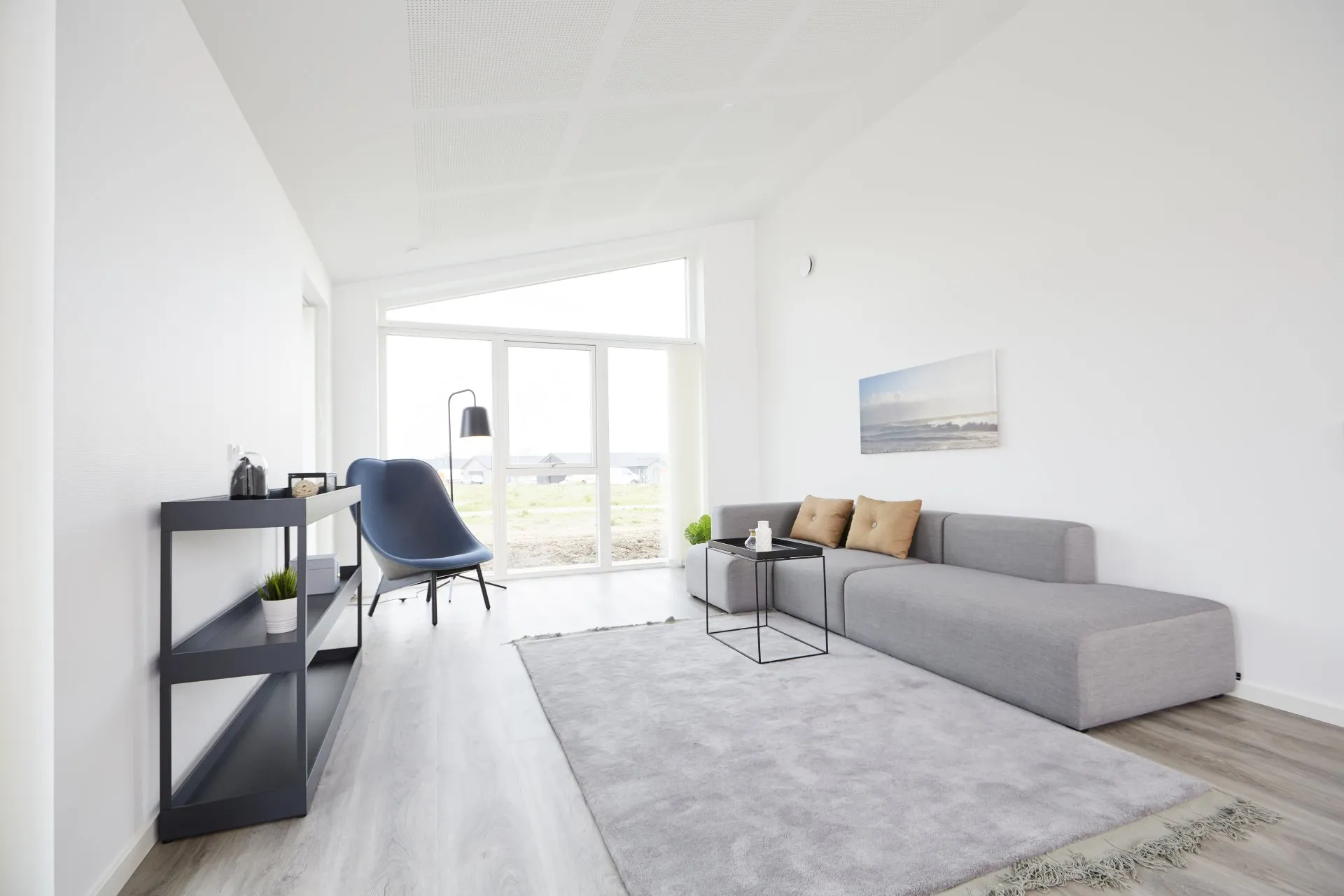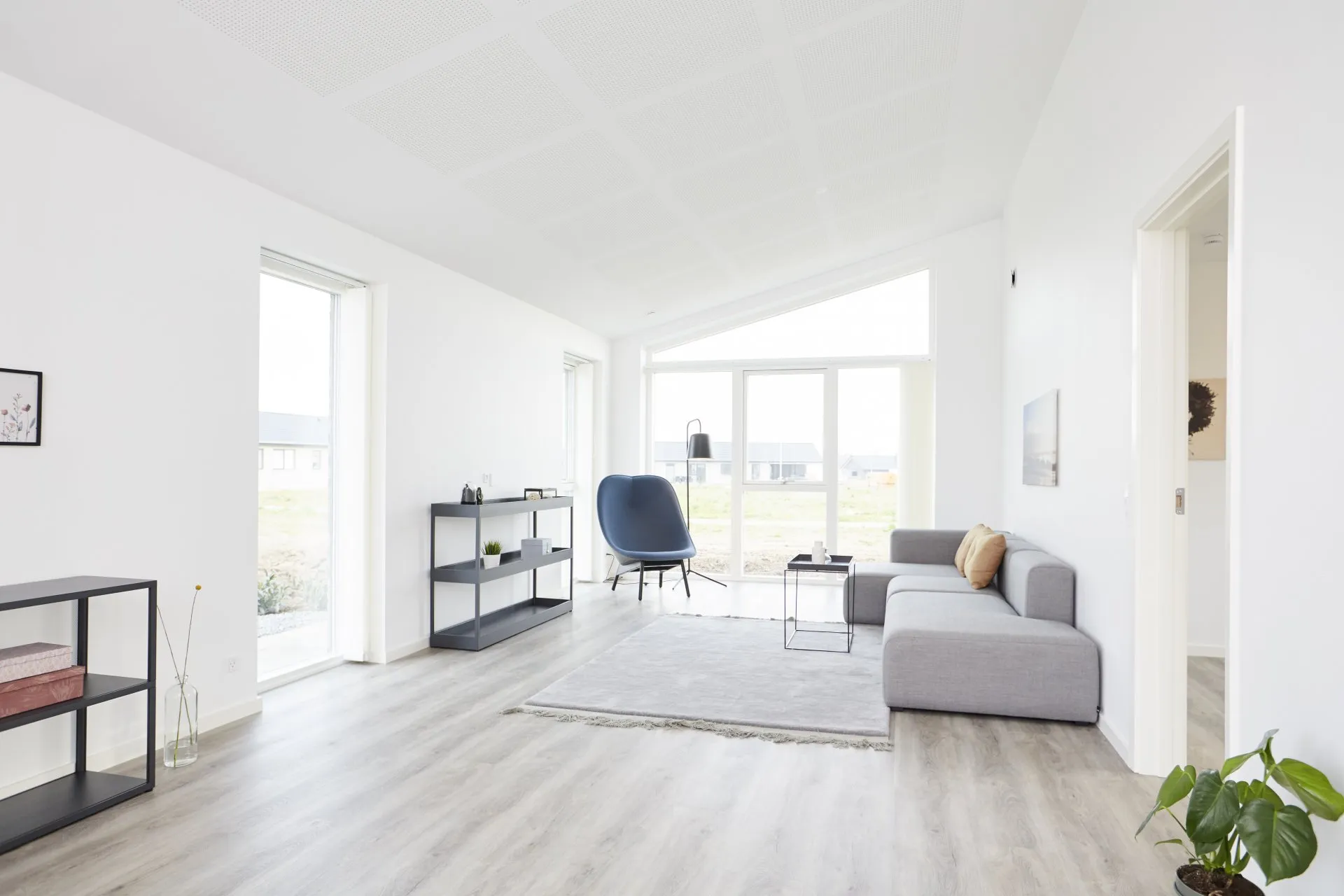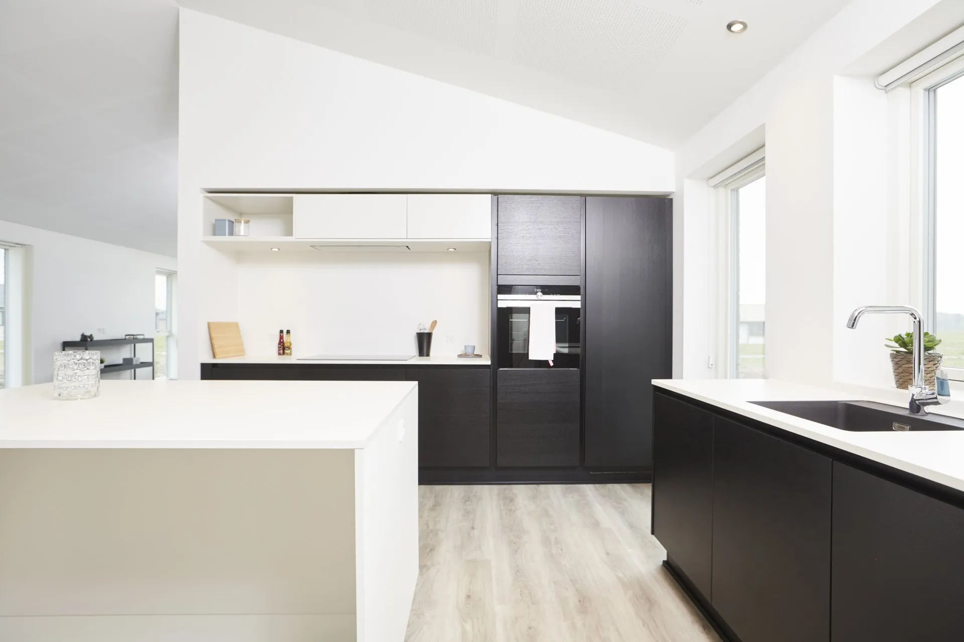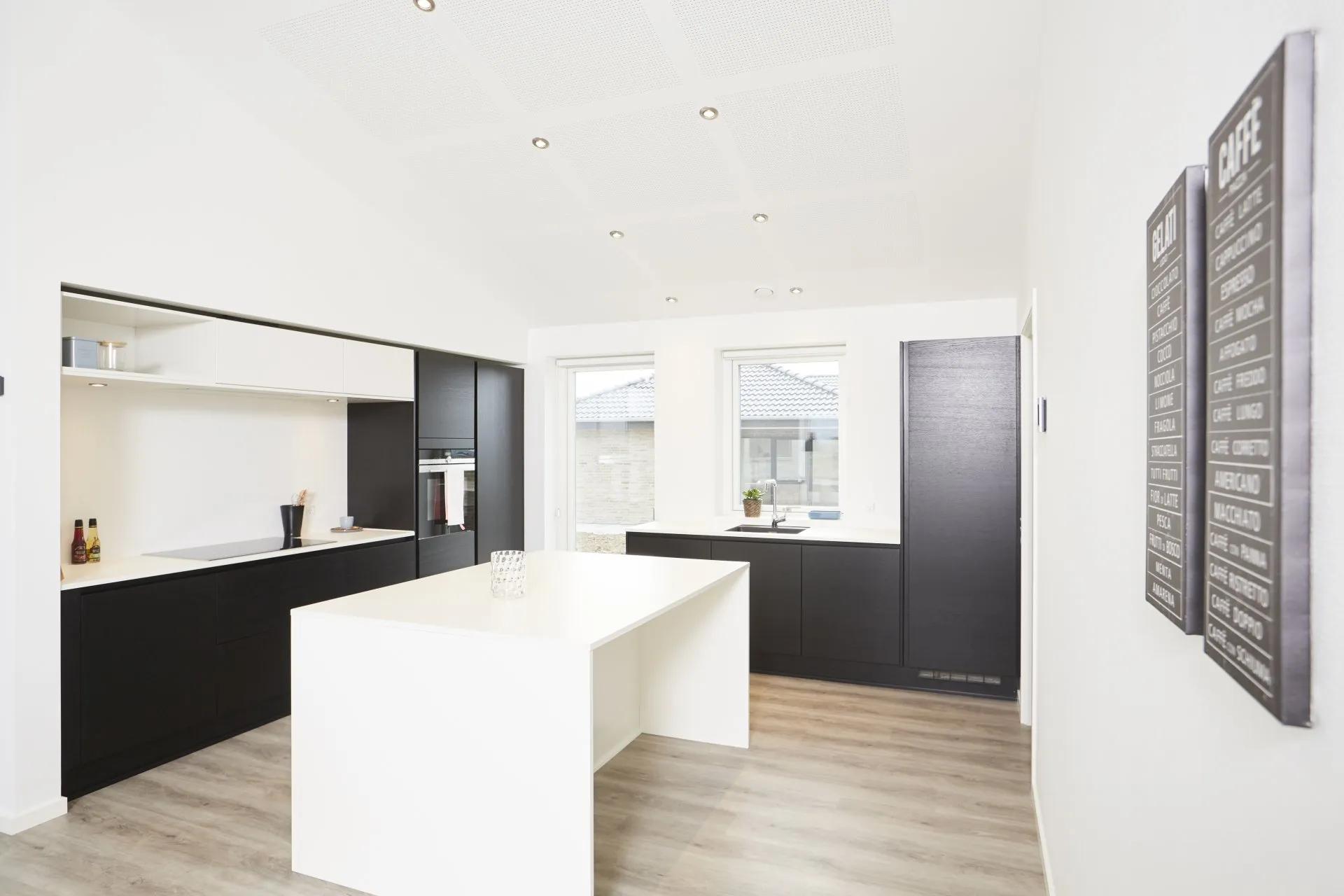 Skabsvæg, indbygget kogeø samt skråloft i alrum og stue.