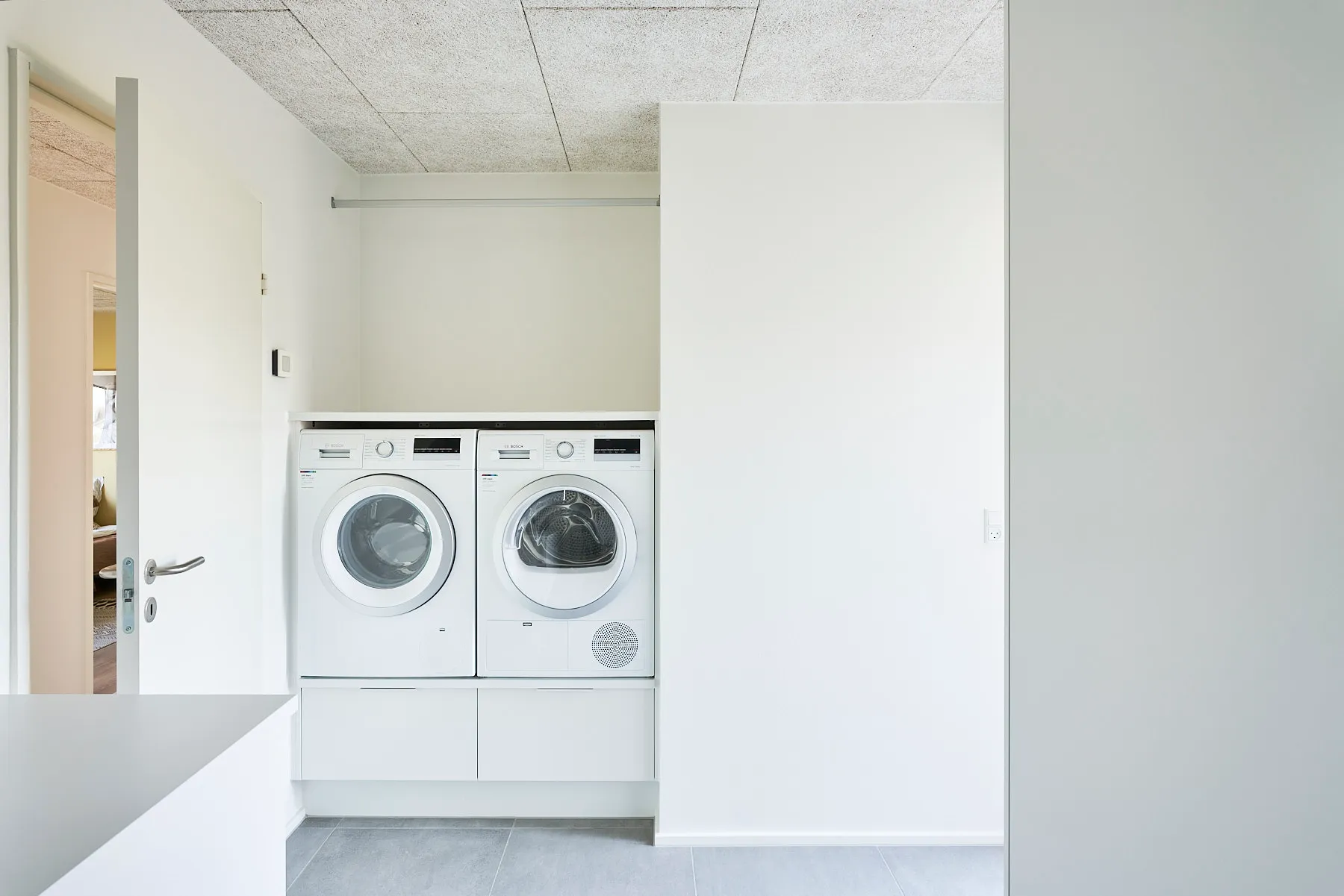 Siddebænk, garderobe og kaffeniche.