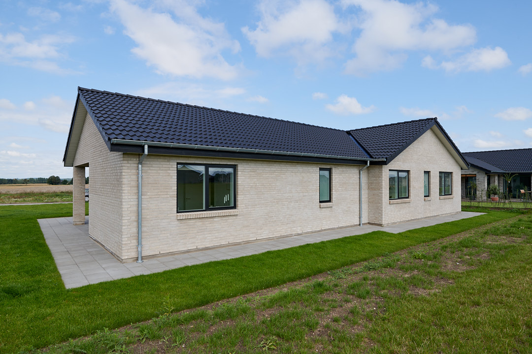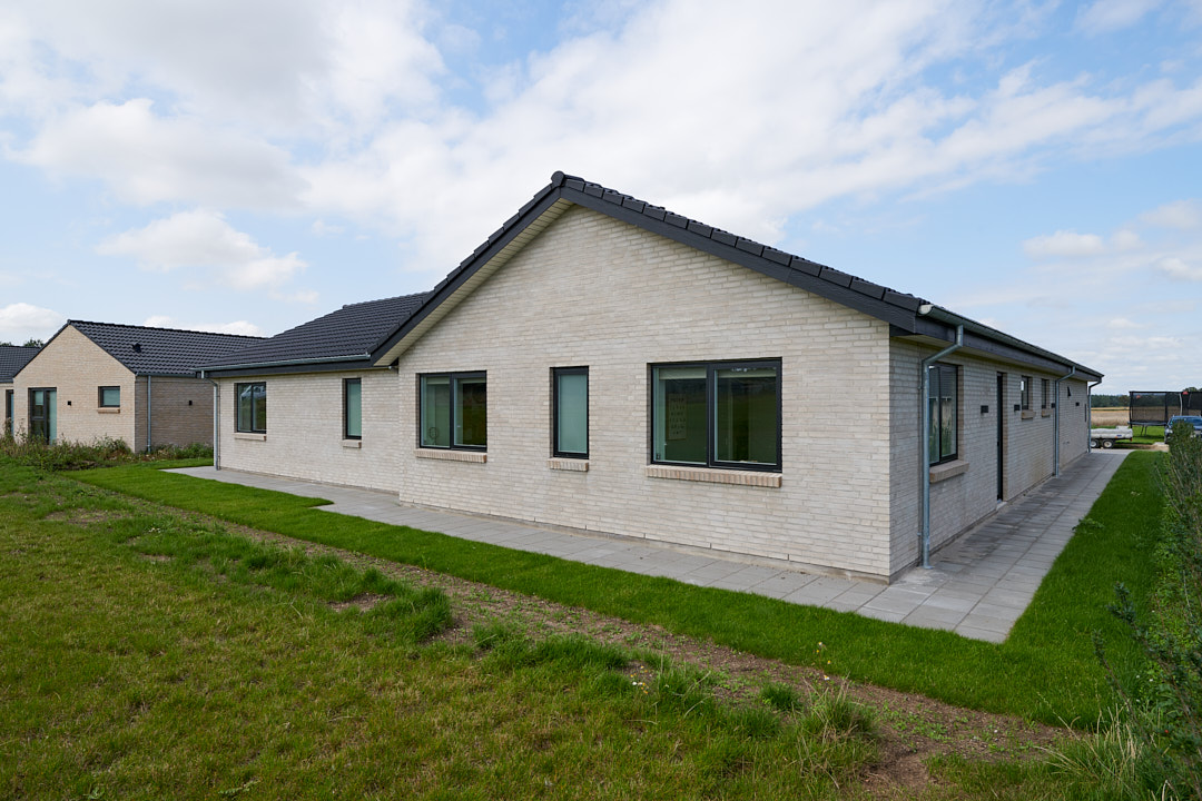 Velindrettet forskudt vinkelhus med saddeltag med udhæng.
