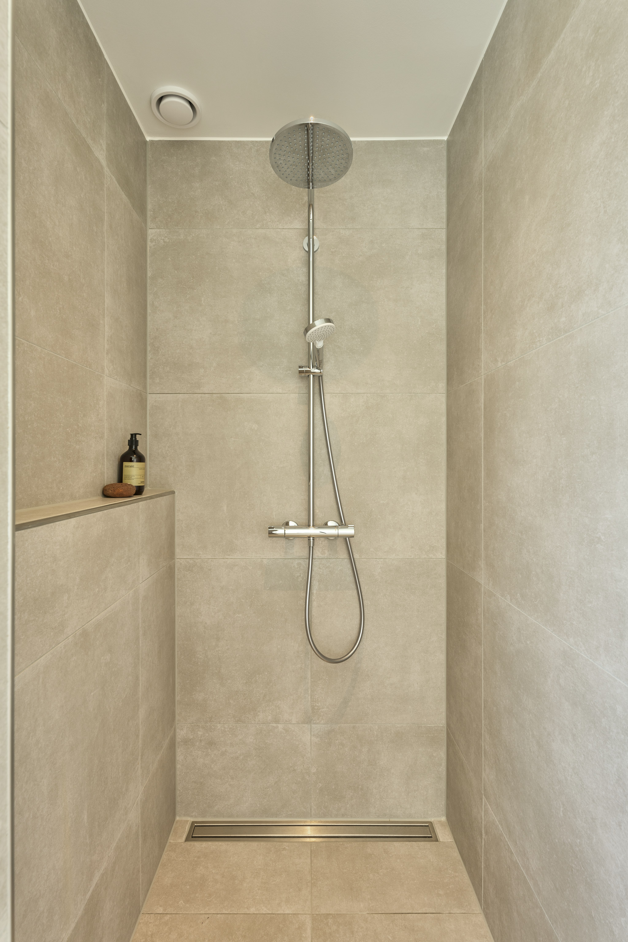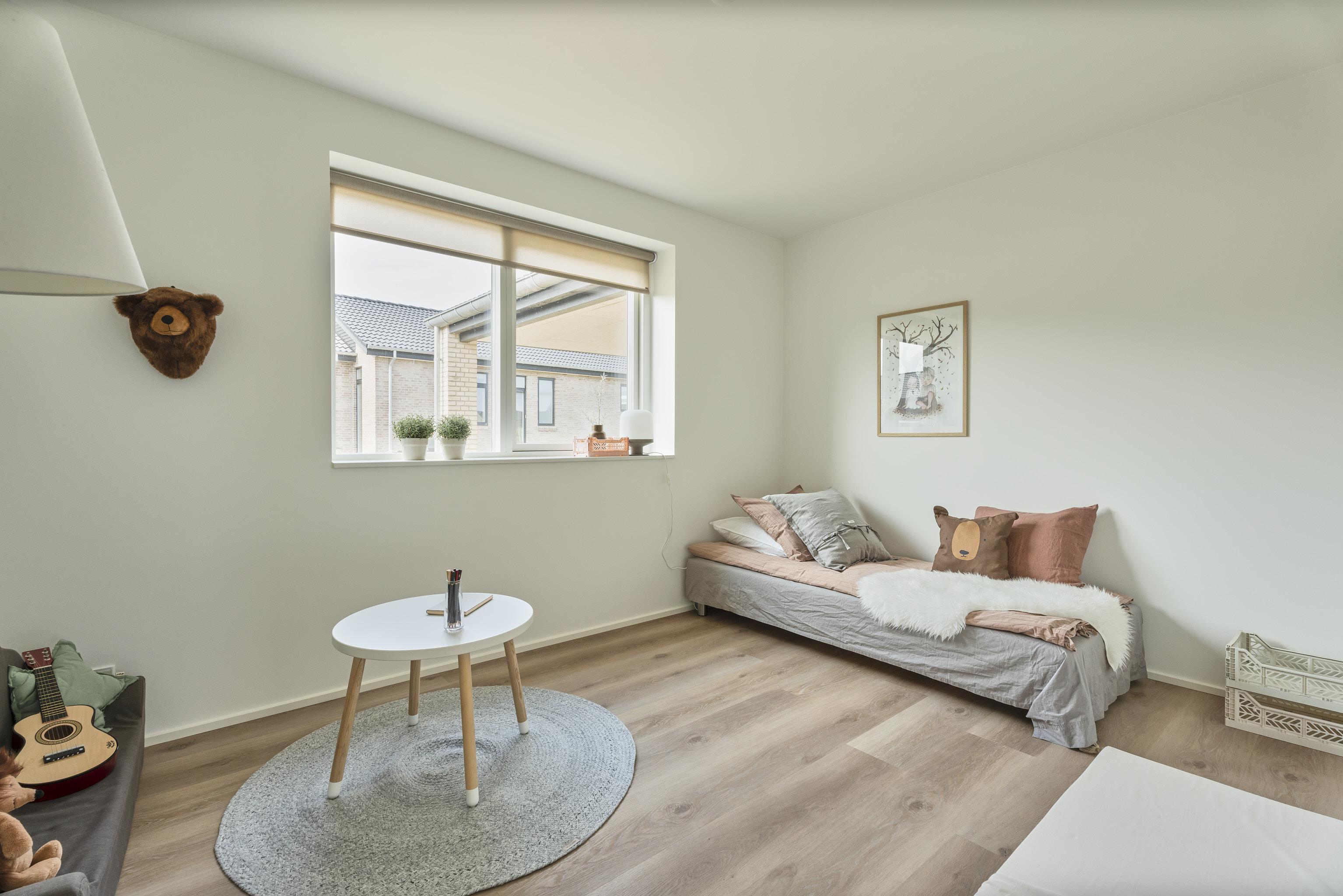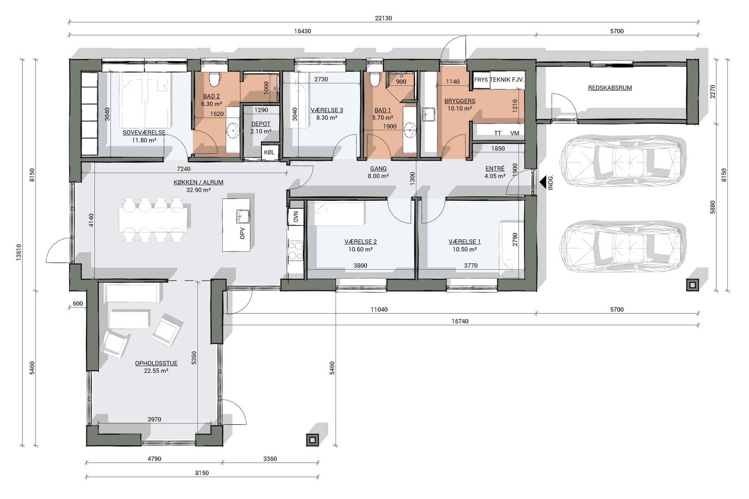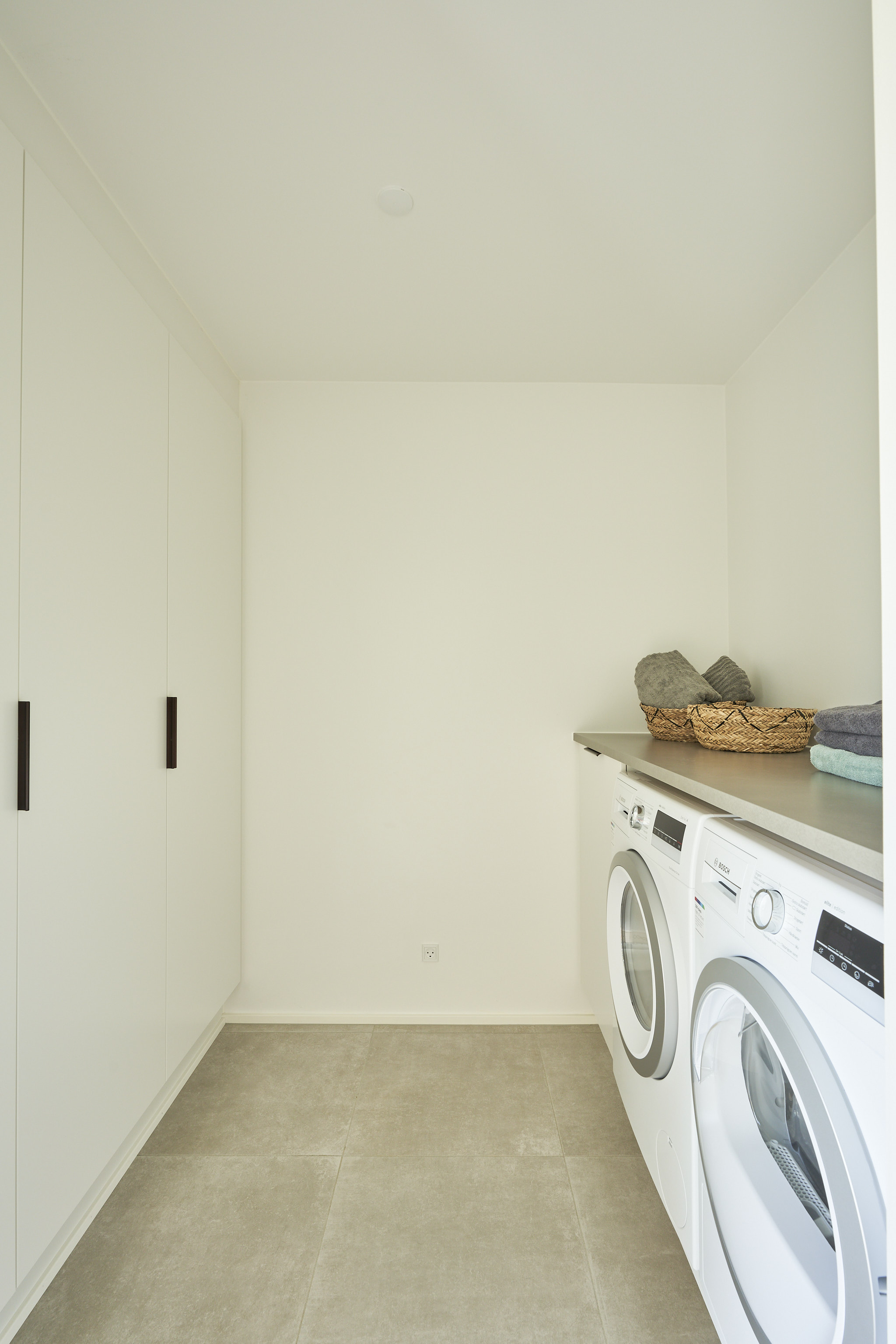 Overdækket terrasse, skjult depotrum og velindrettet bryggers.