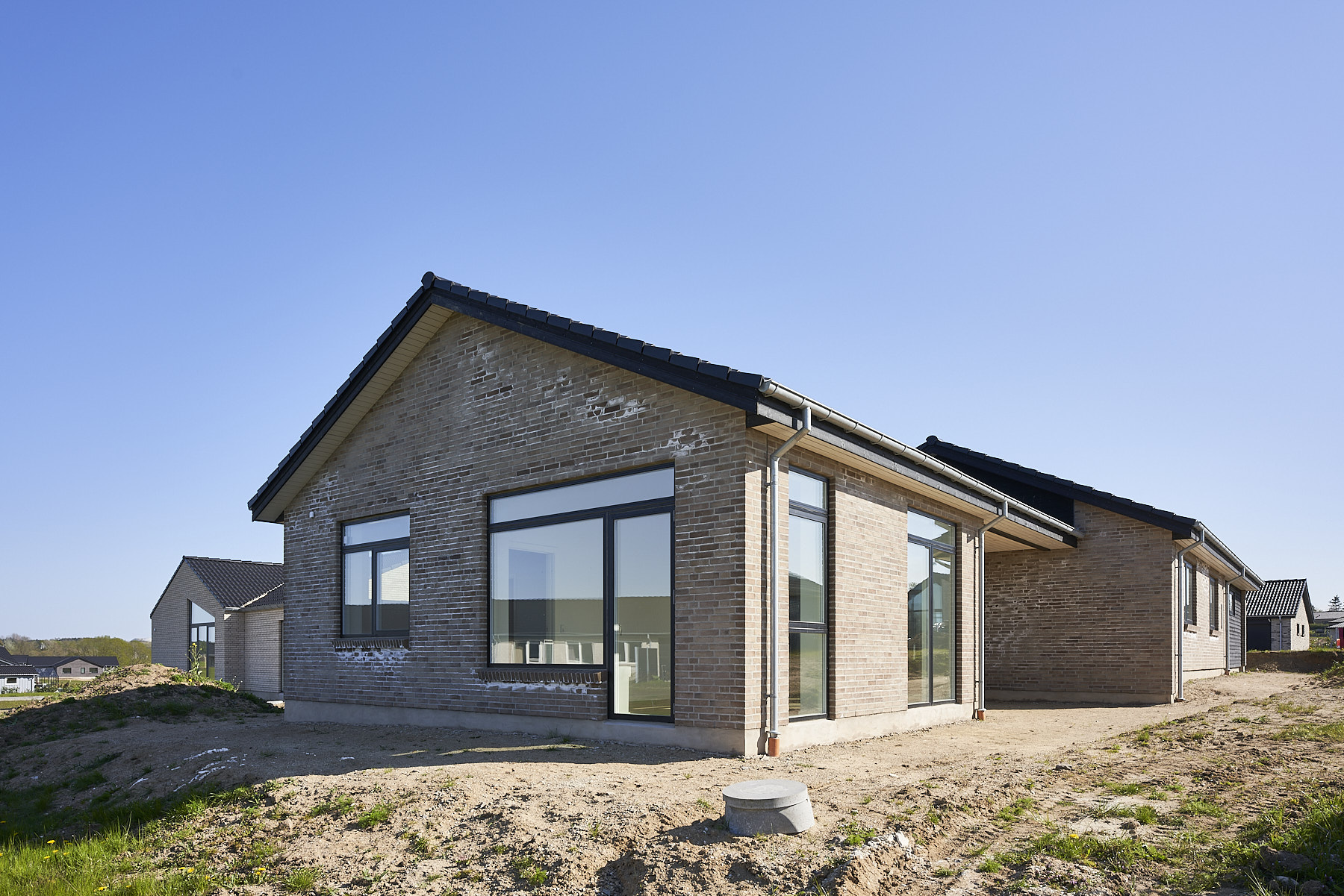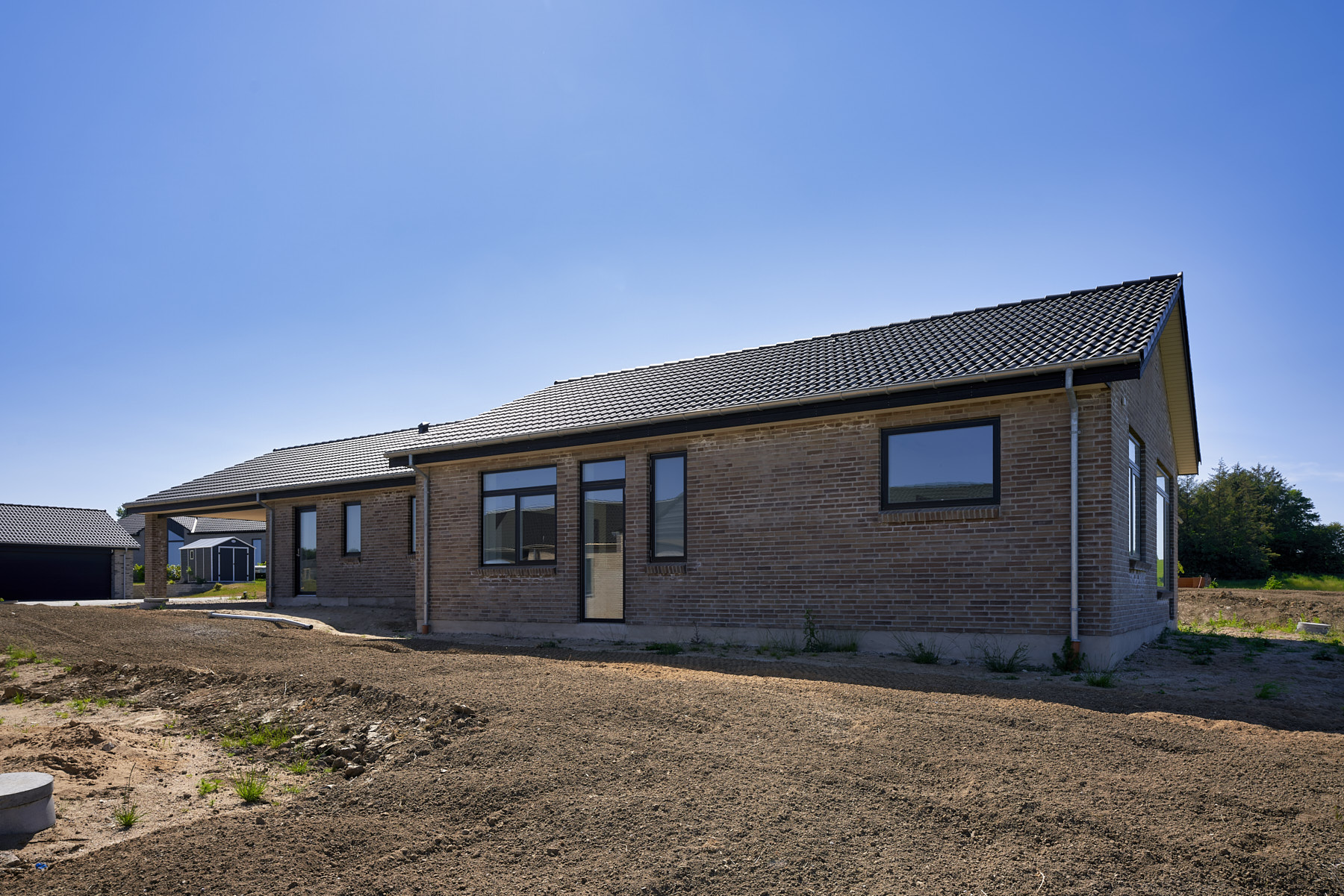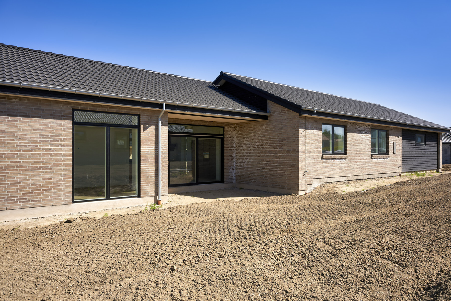 Velindrettet forskudt vinkelhus med saddeltag med udhæng.