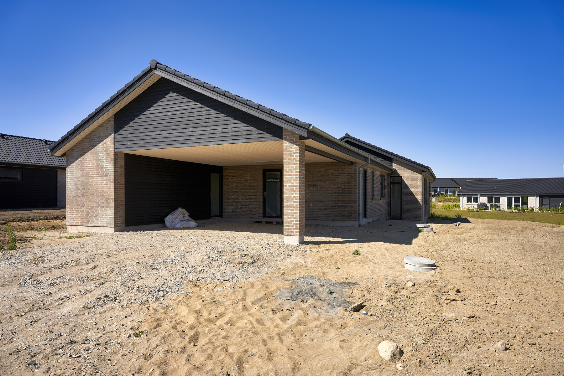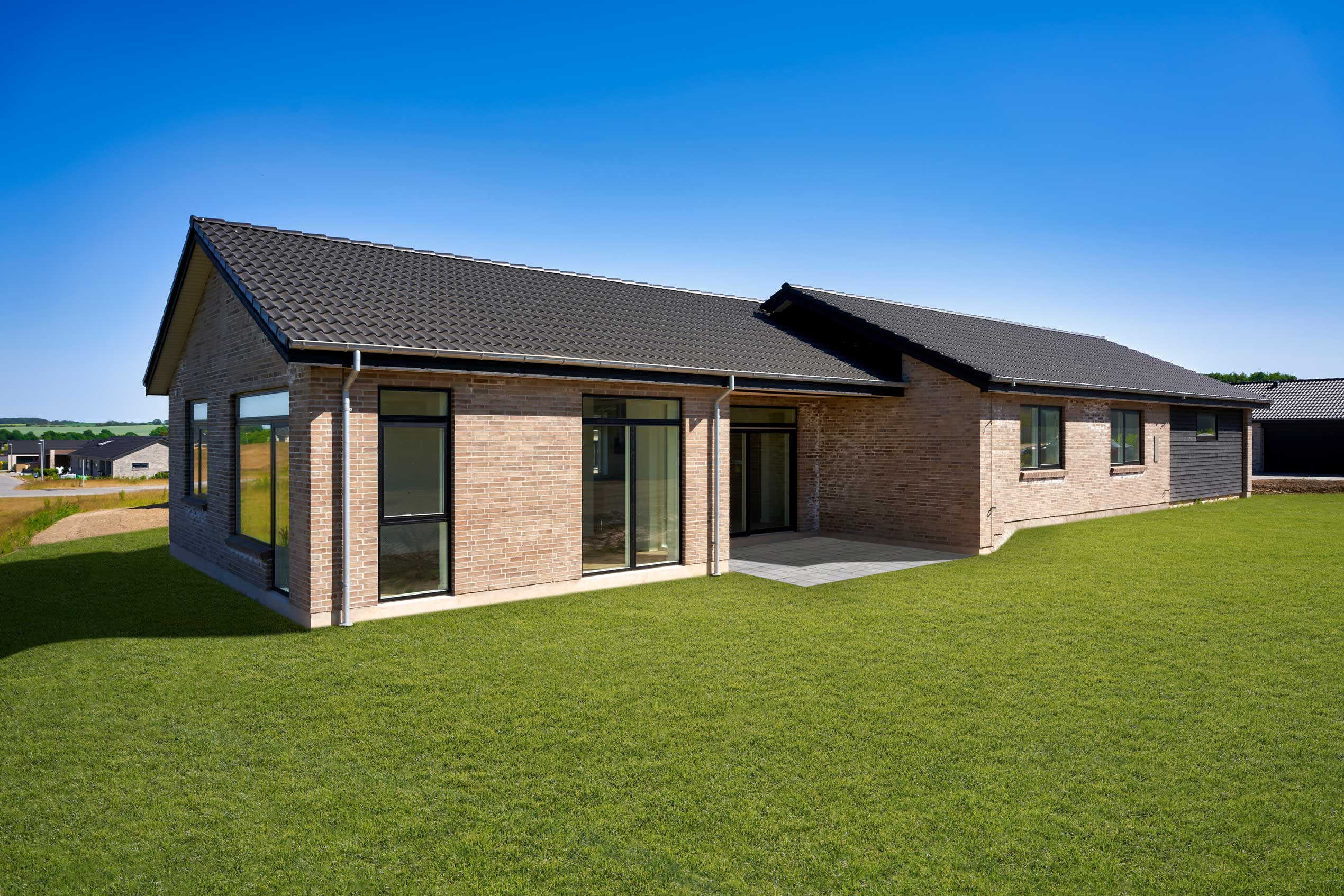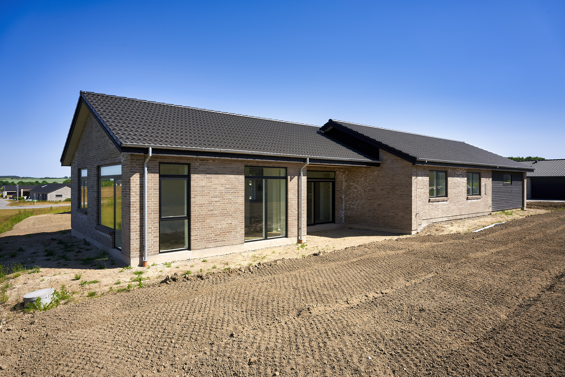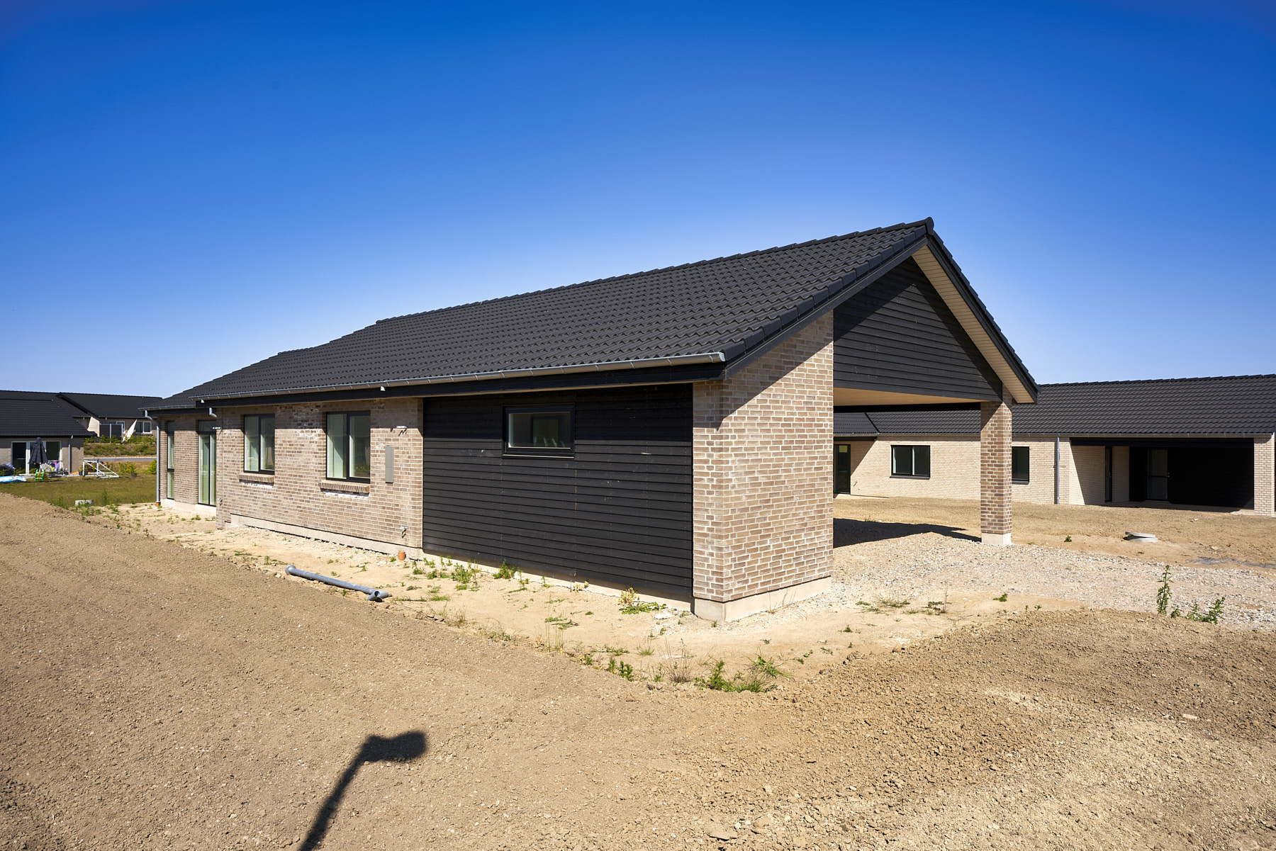 Velindrettet forskudt vinkelhus med saddeltag med udhæng.