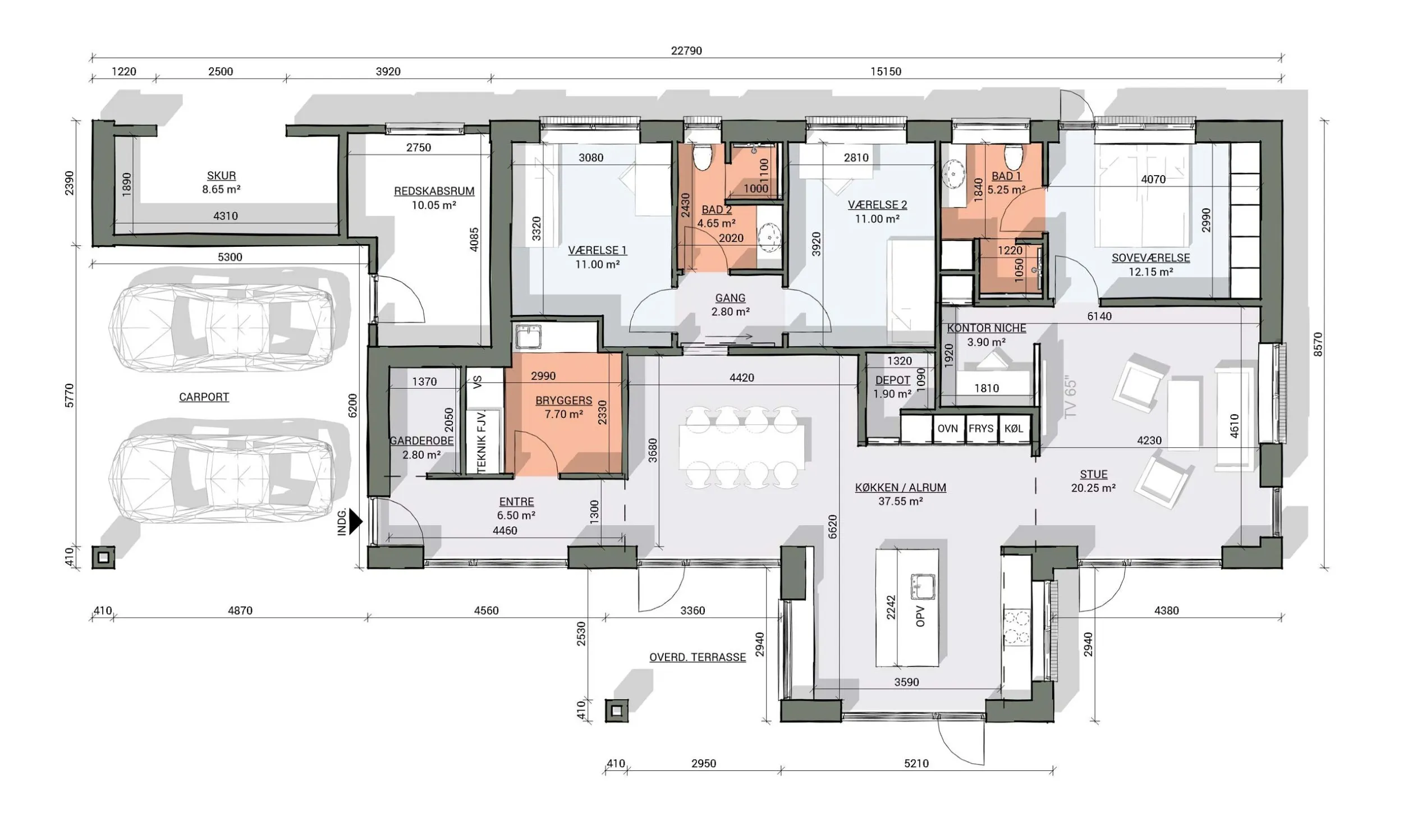 Rummeligt forskudt vinkelhus med overdækket terrasse