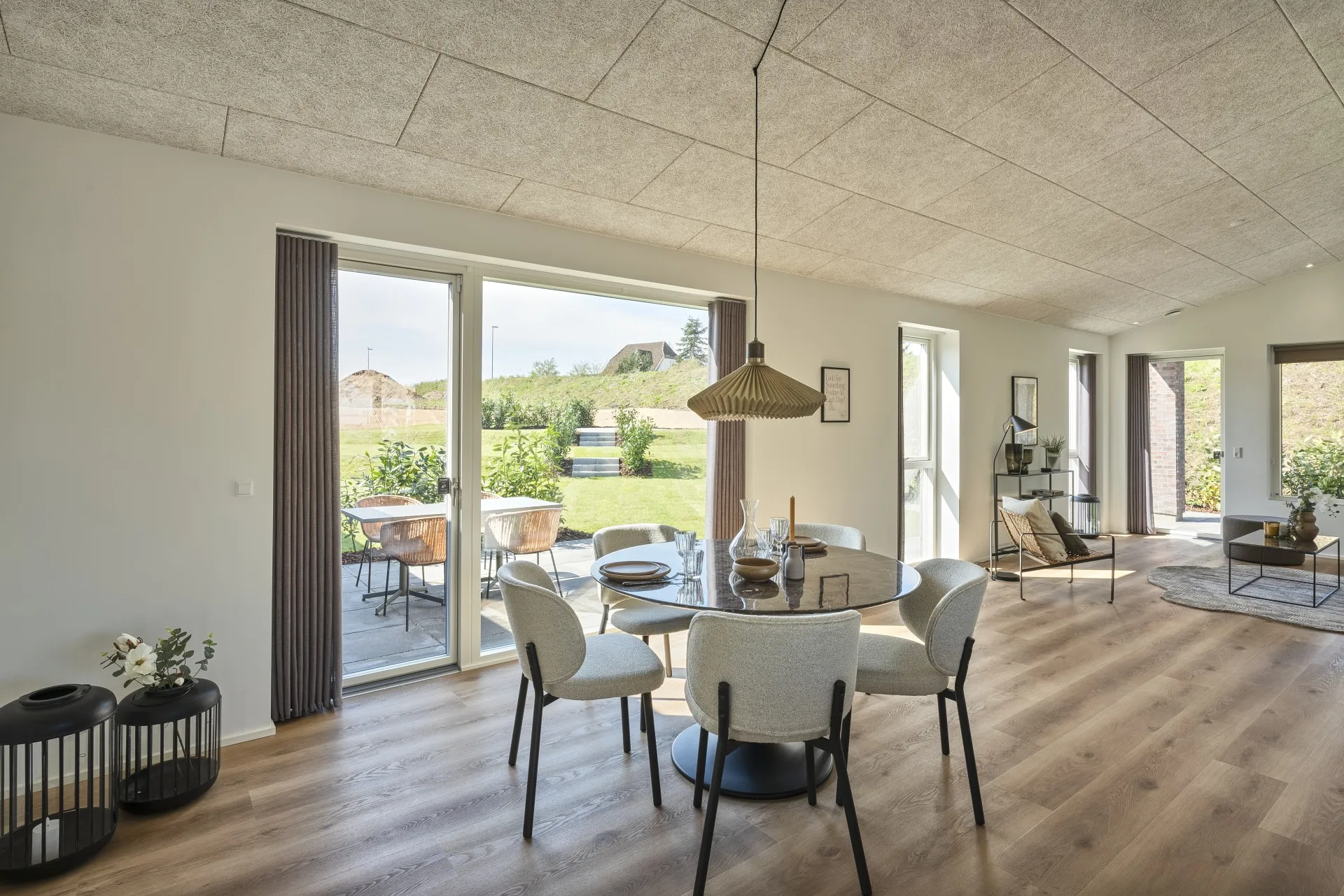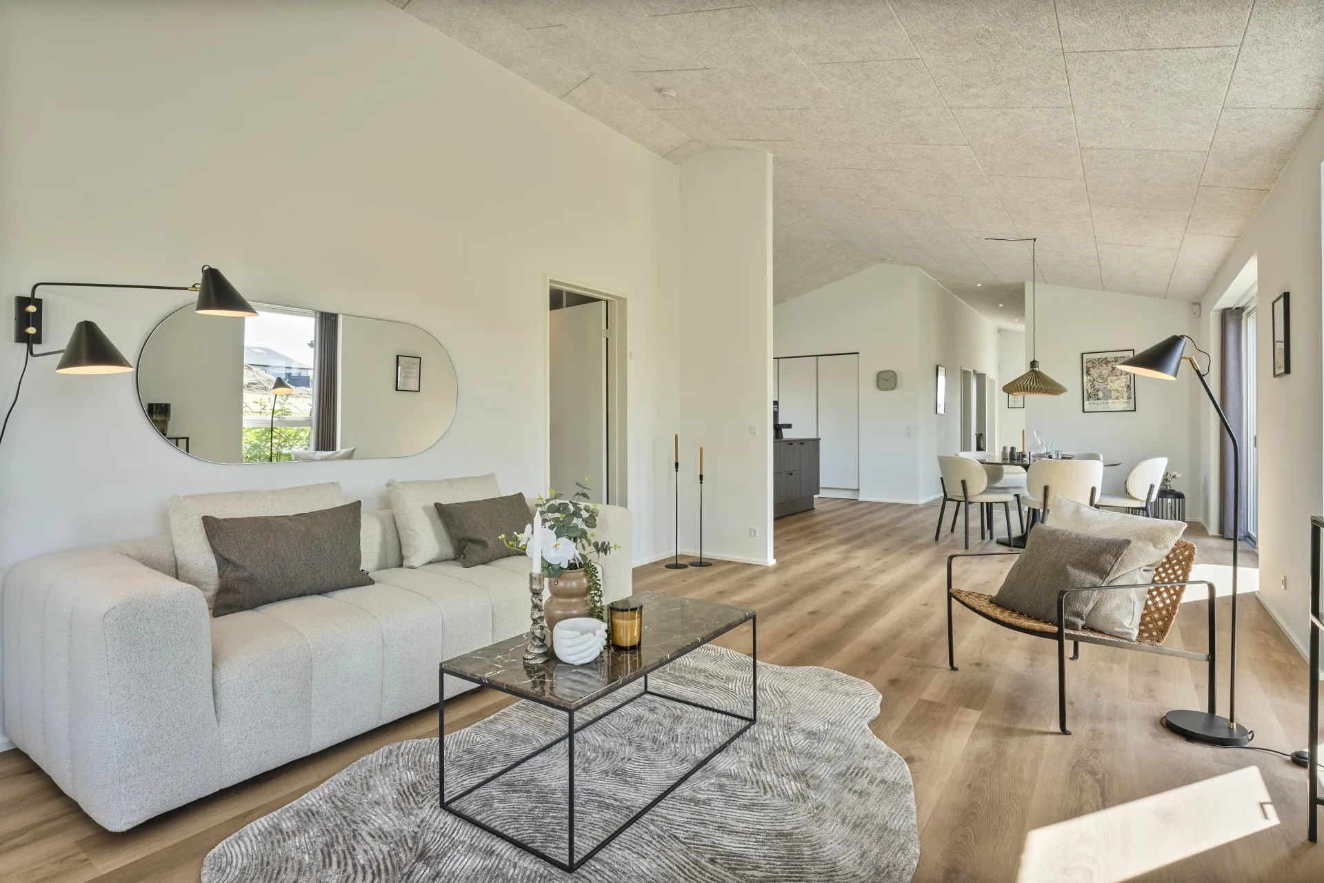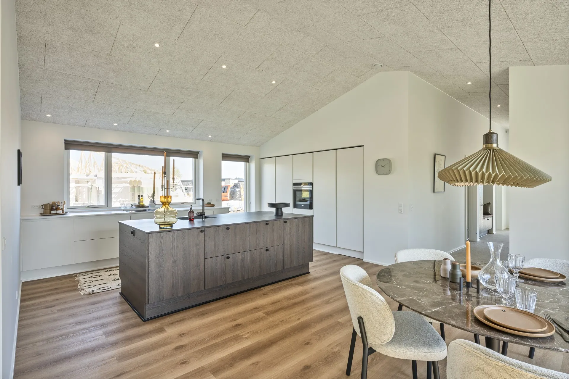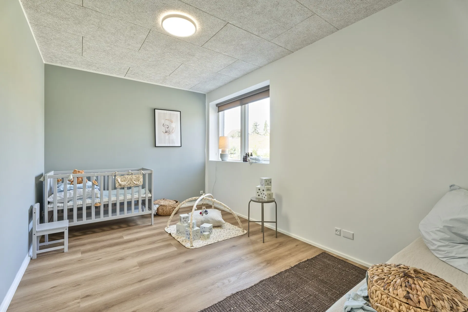 Opdelt forældre- og børneafdeling, stue og køkken-alrum i ét og praktisk bryggers.
