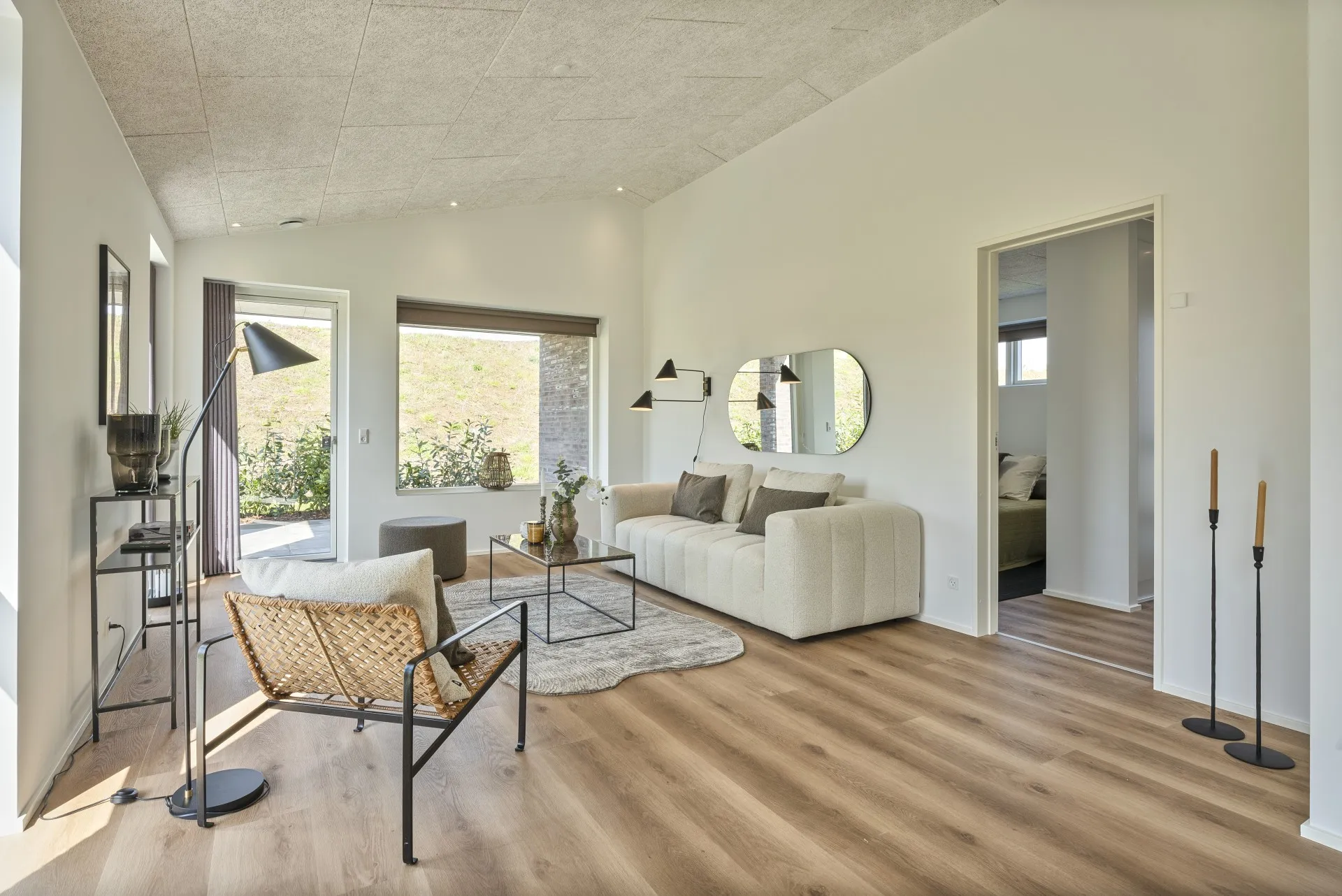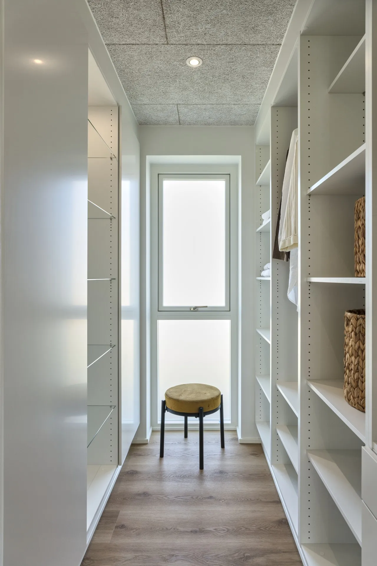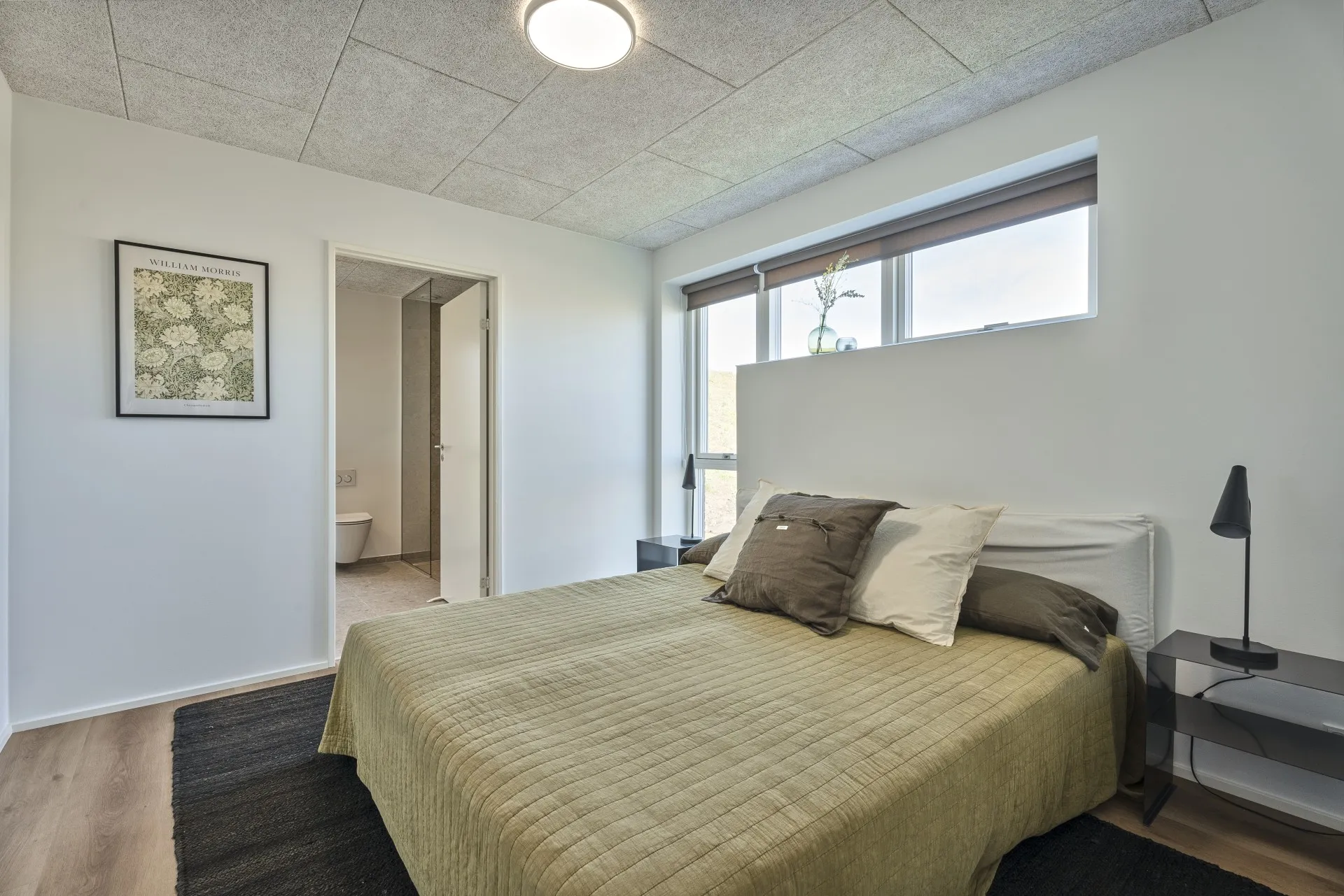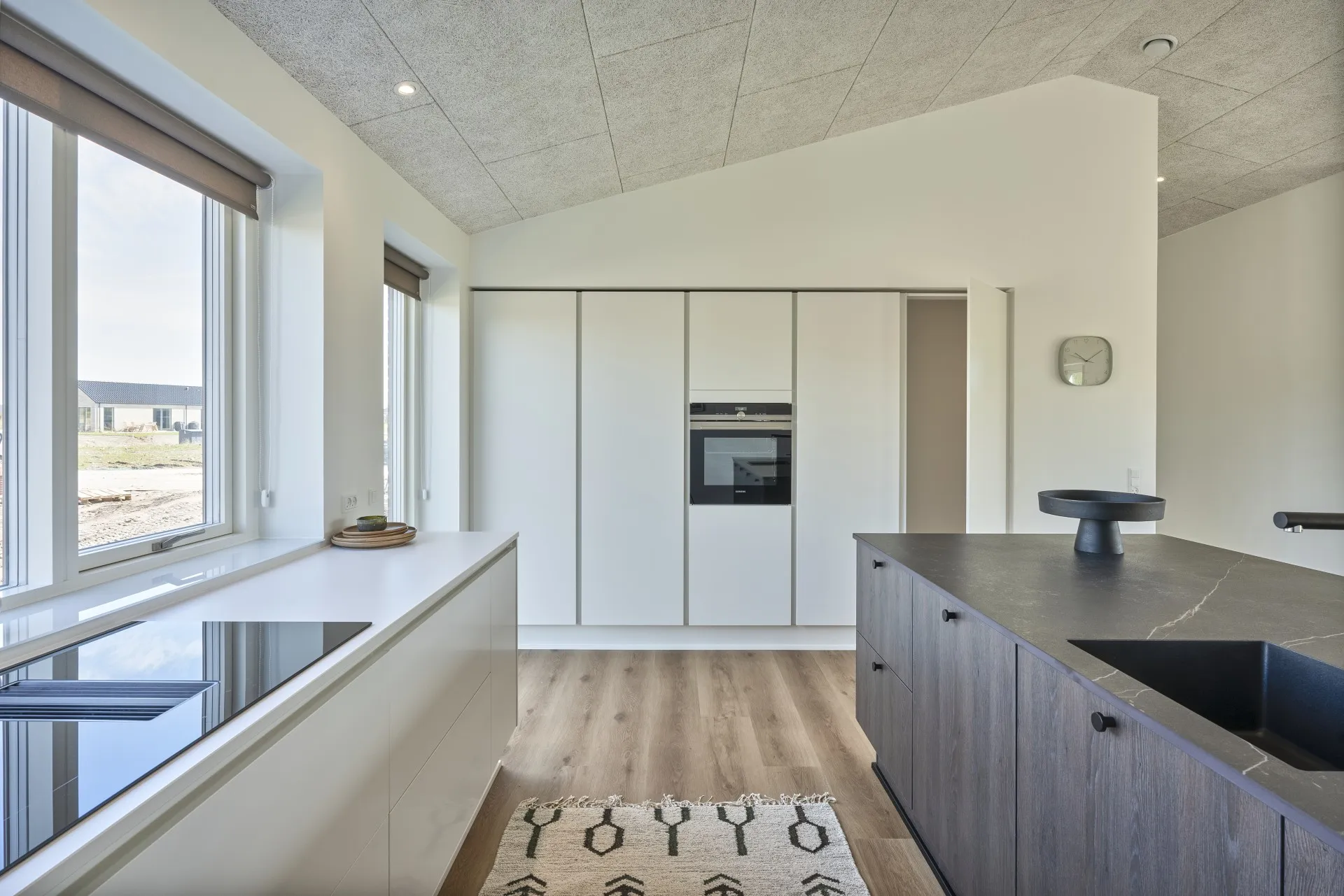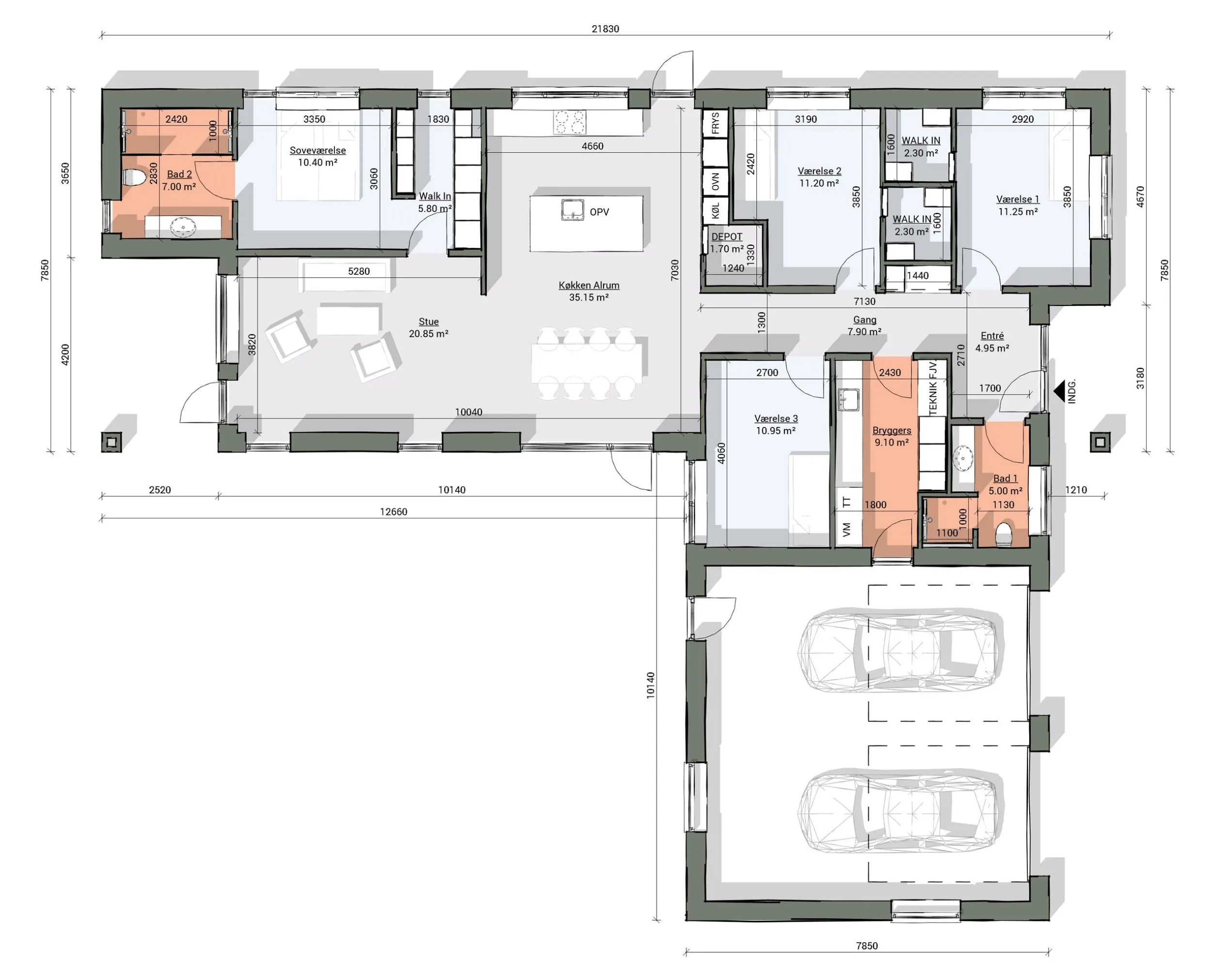 Opdelt forældre- og børneafdeling, stue og køkken-alrum i ét og praktisk bryggers.