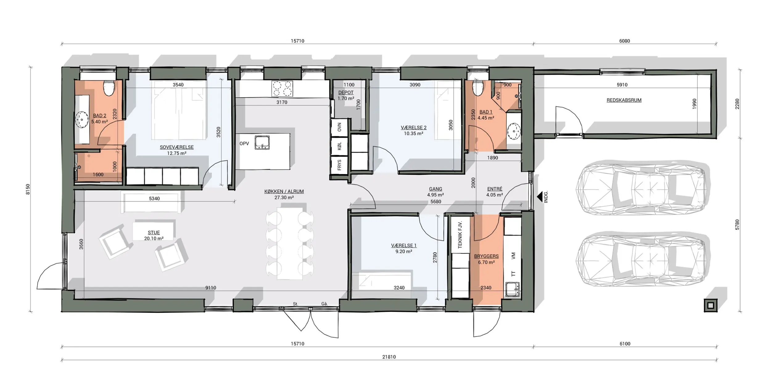 Tre gode værelser, køkken-alrum og stue i ét og praktisk bryggers.