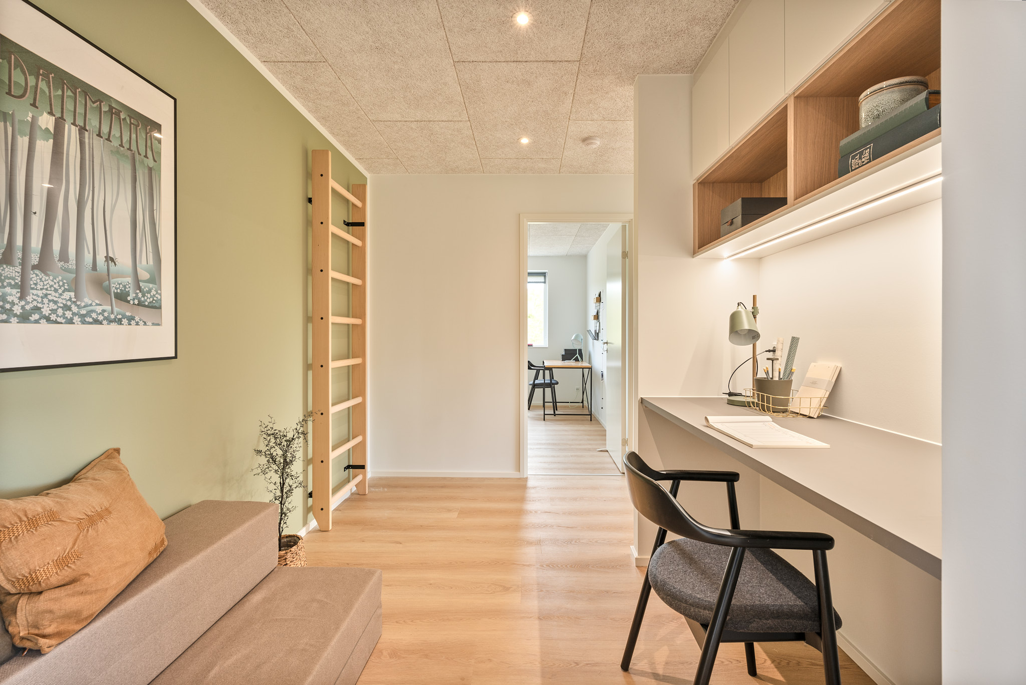 Forældre- og børneafdeling, stort hjerterum og terrasse med hyggekroge.