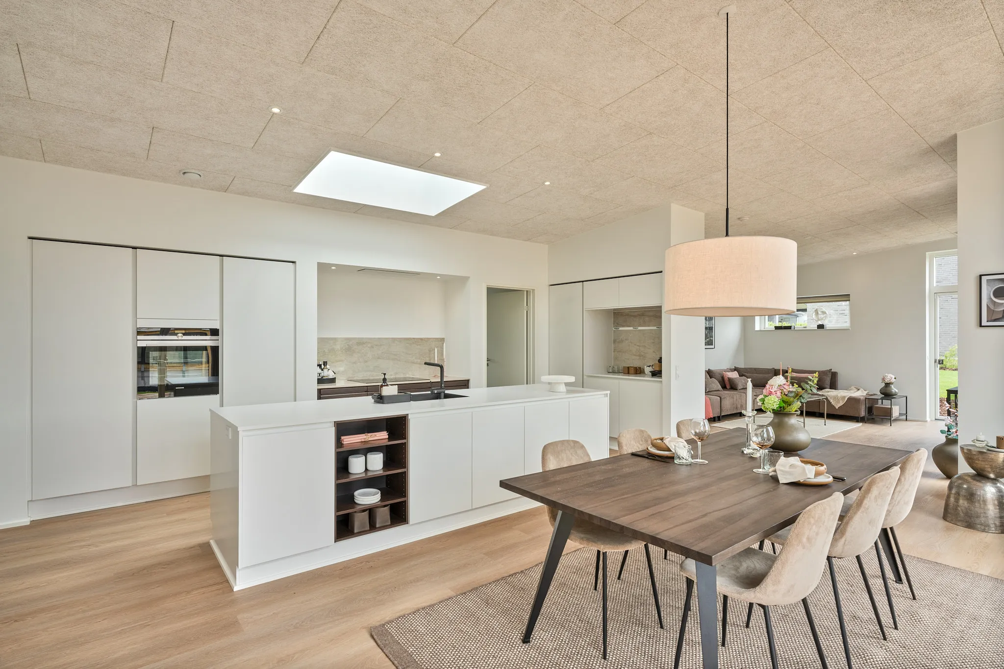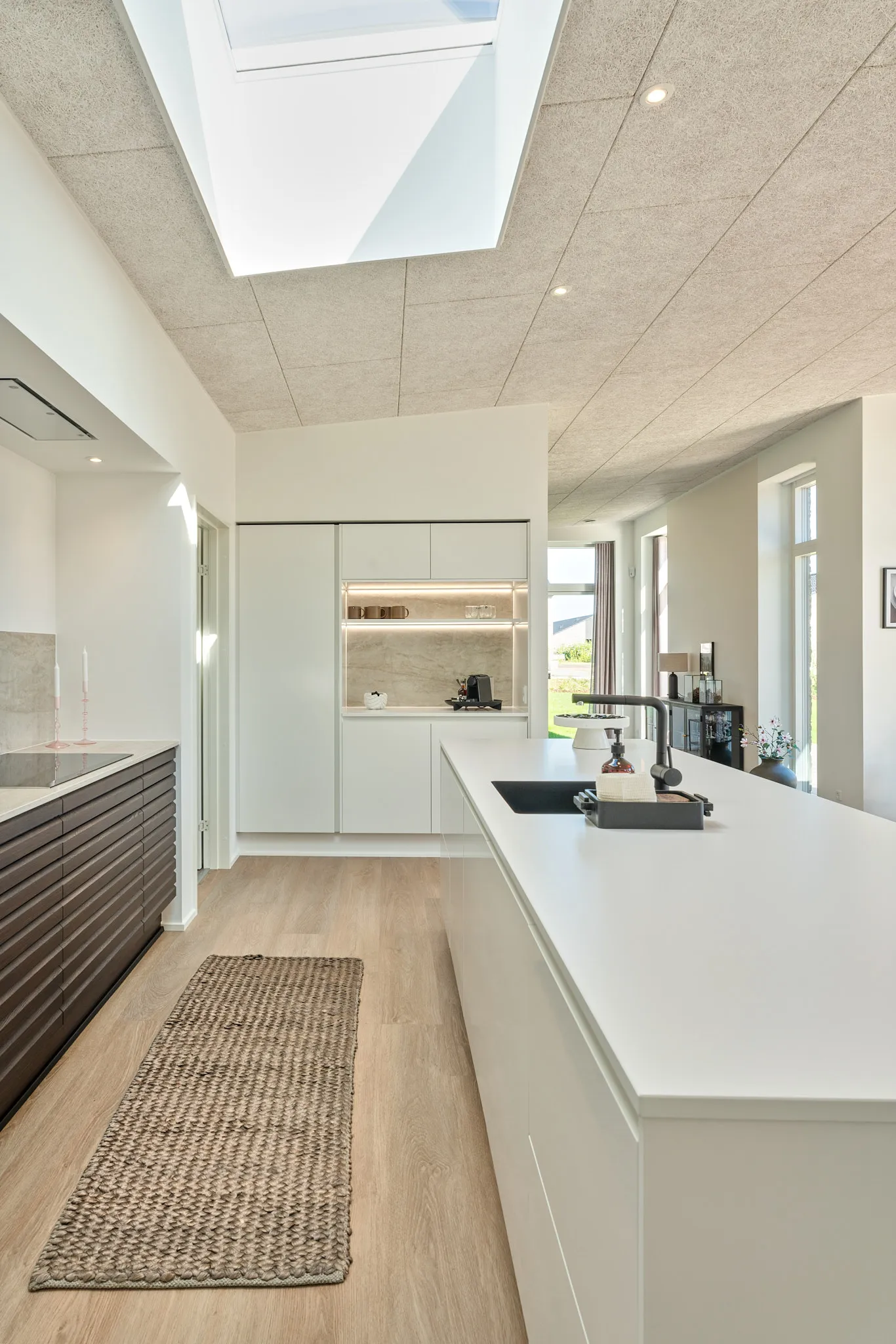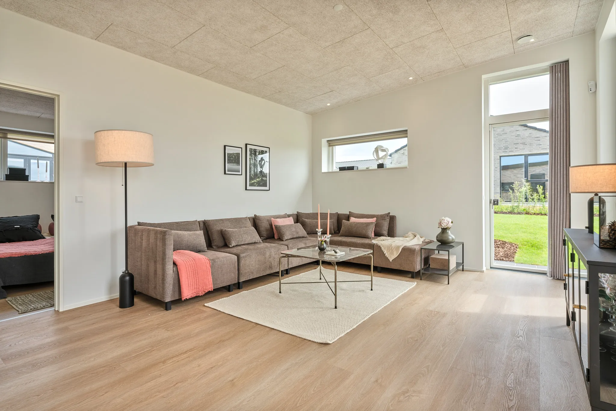 Gennemgående køkken-alrum med kaffestation, en opdelt forældre- og børneafdeling og terrasse rundt om huset.