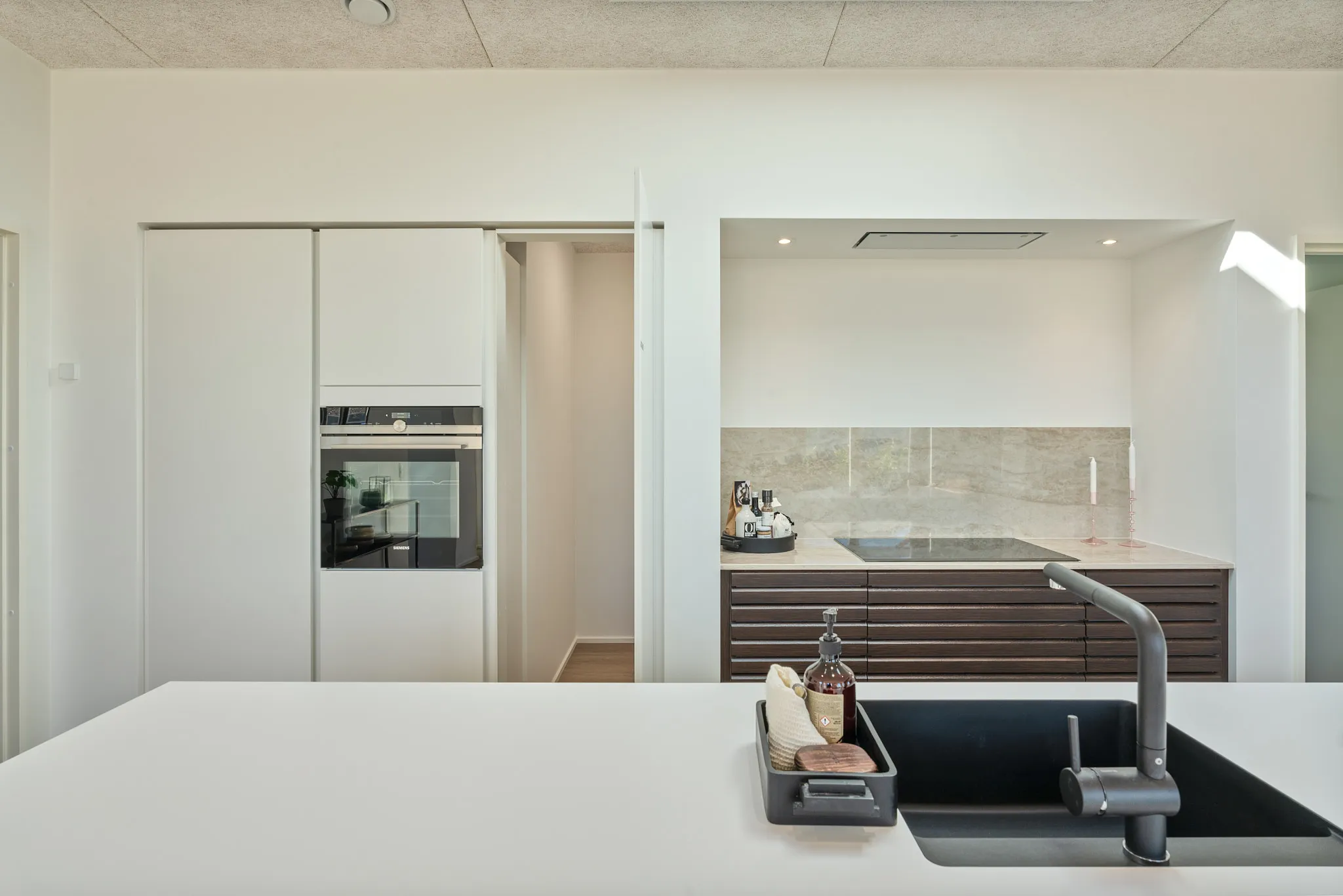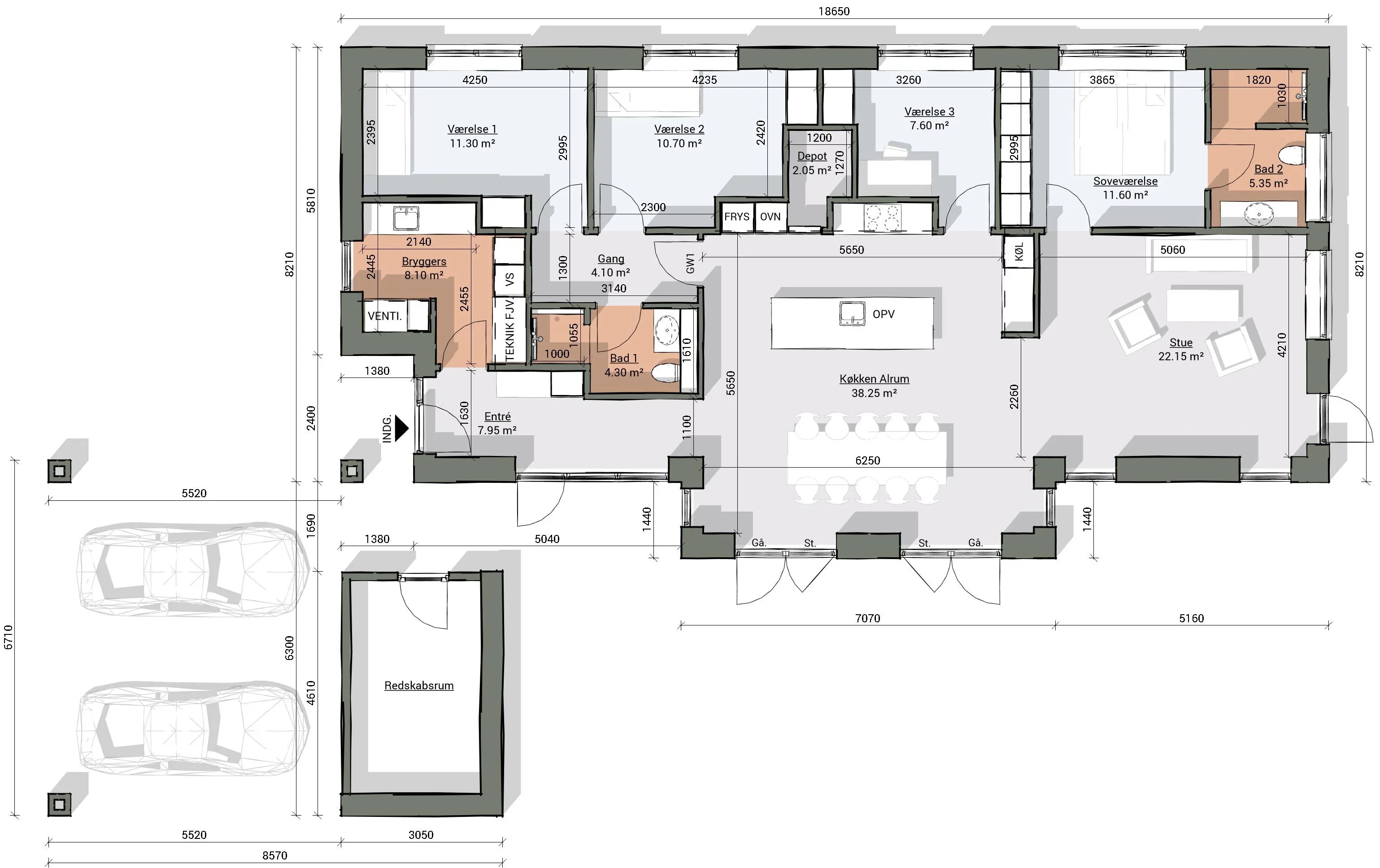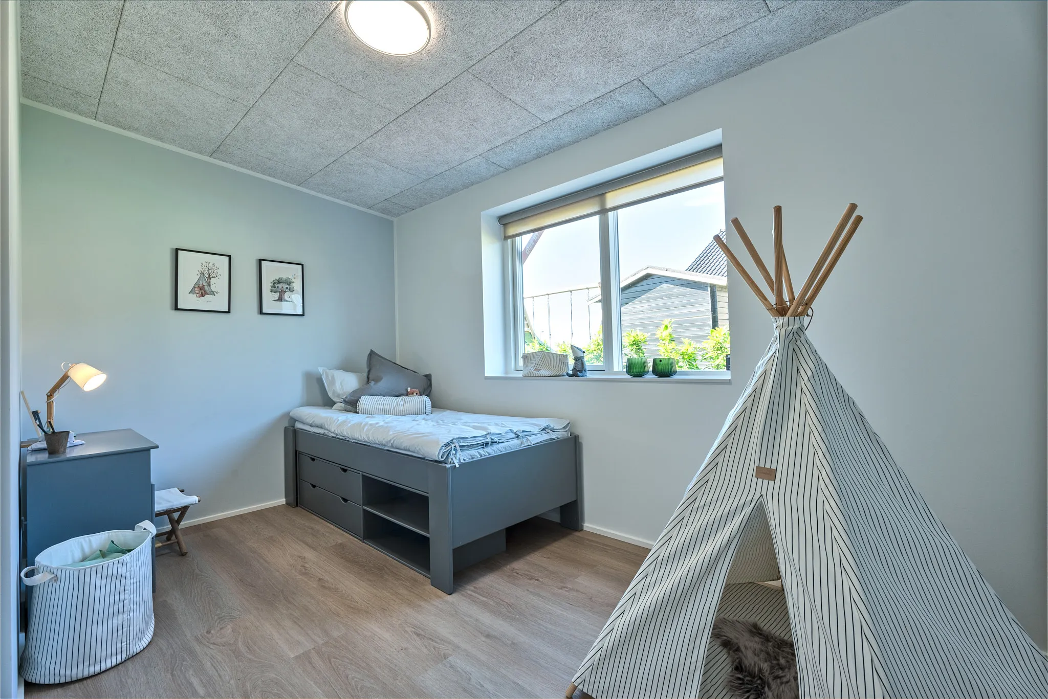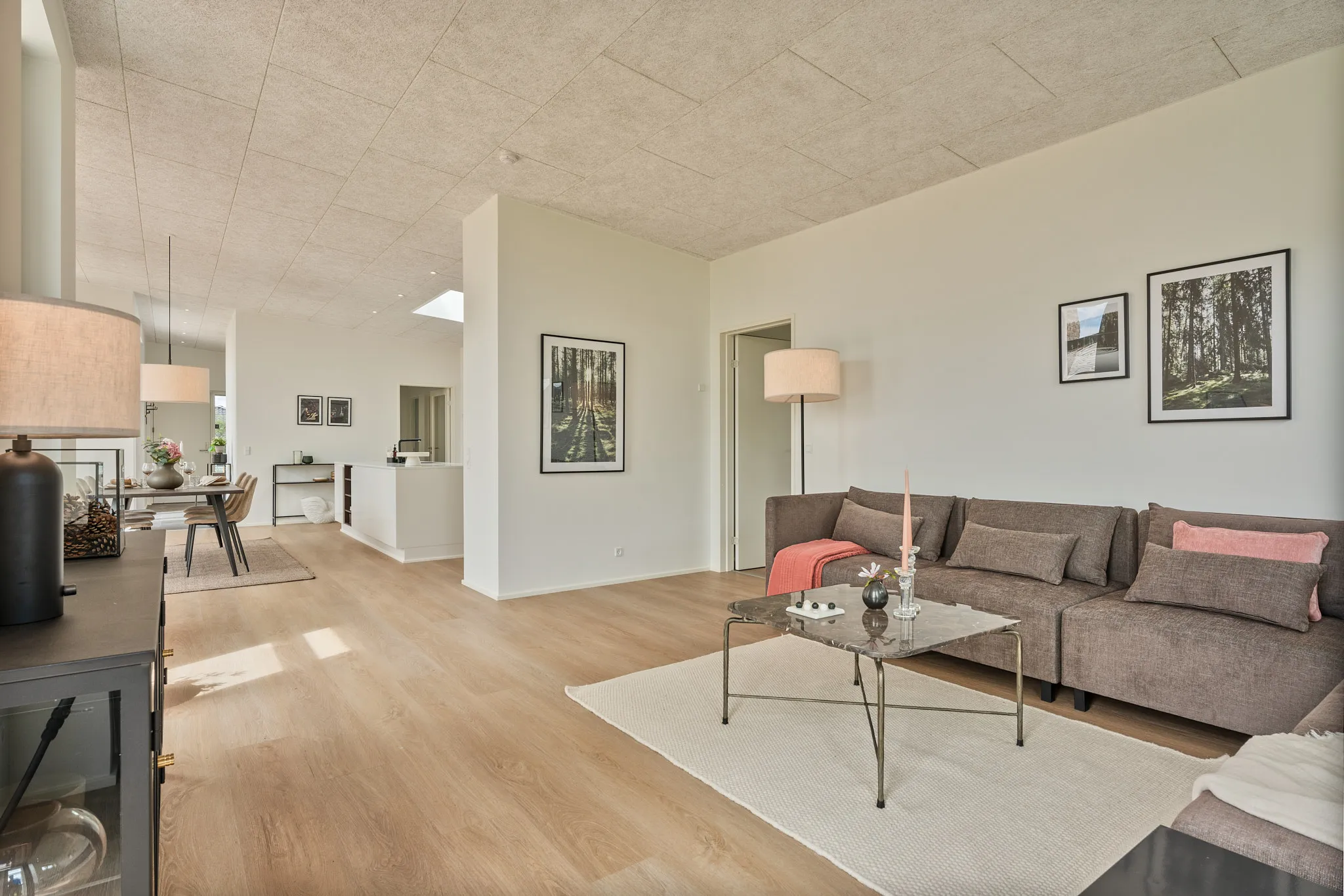 Gennemgående køkken-alrum med kaffestation, en opdelt forældre- og børneafdeling og terrasse rundt om huset.