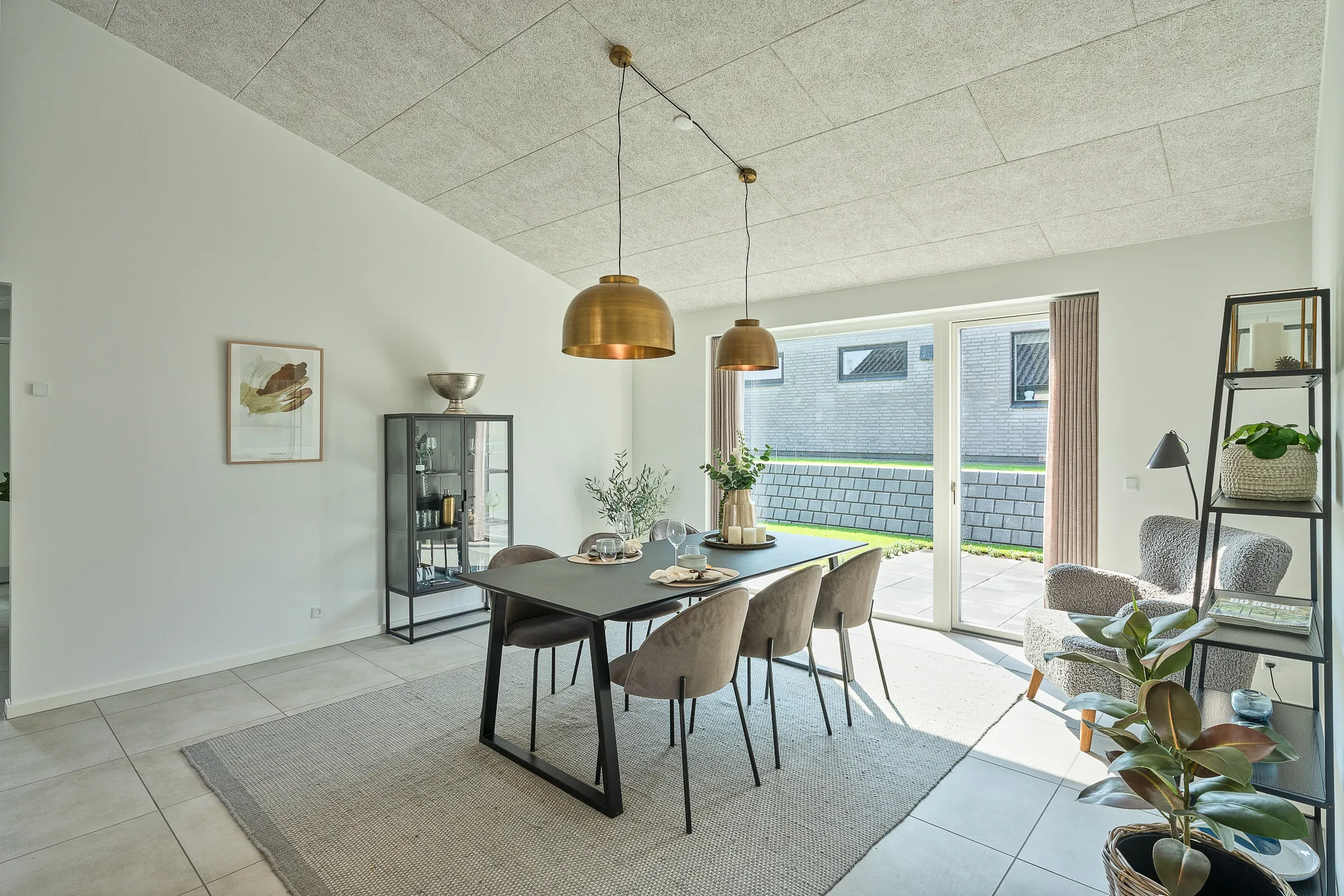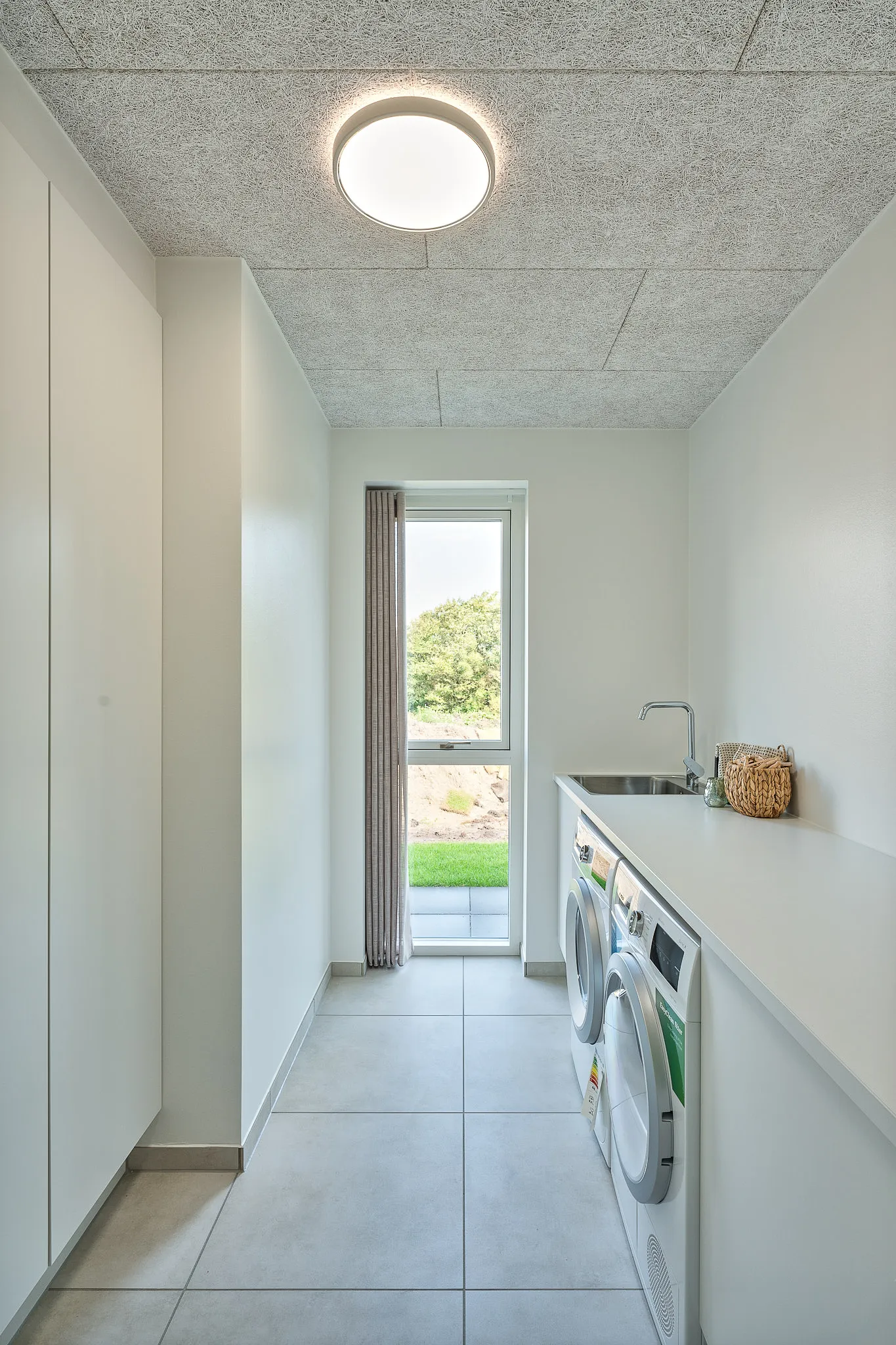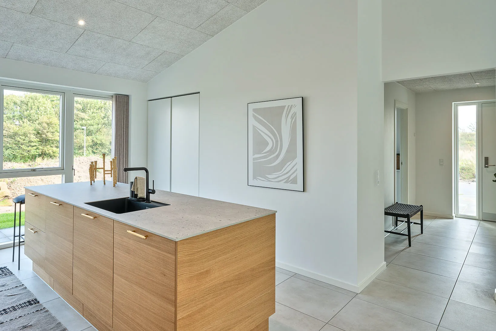 Køkken-alrum med store glaspartier, særsklit stue og walk-in.