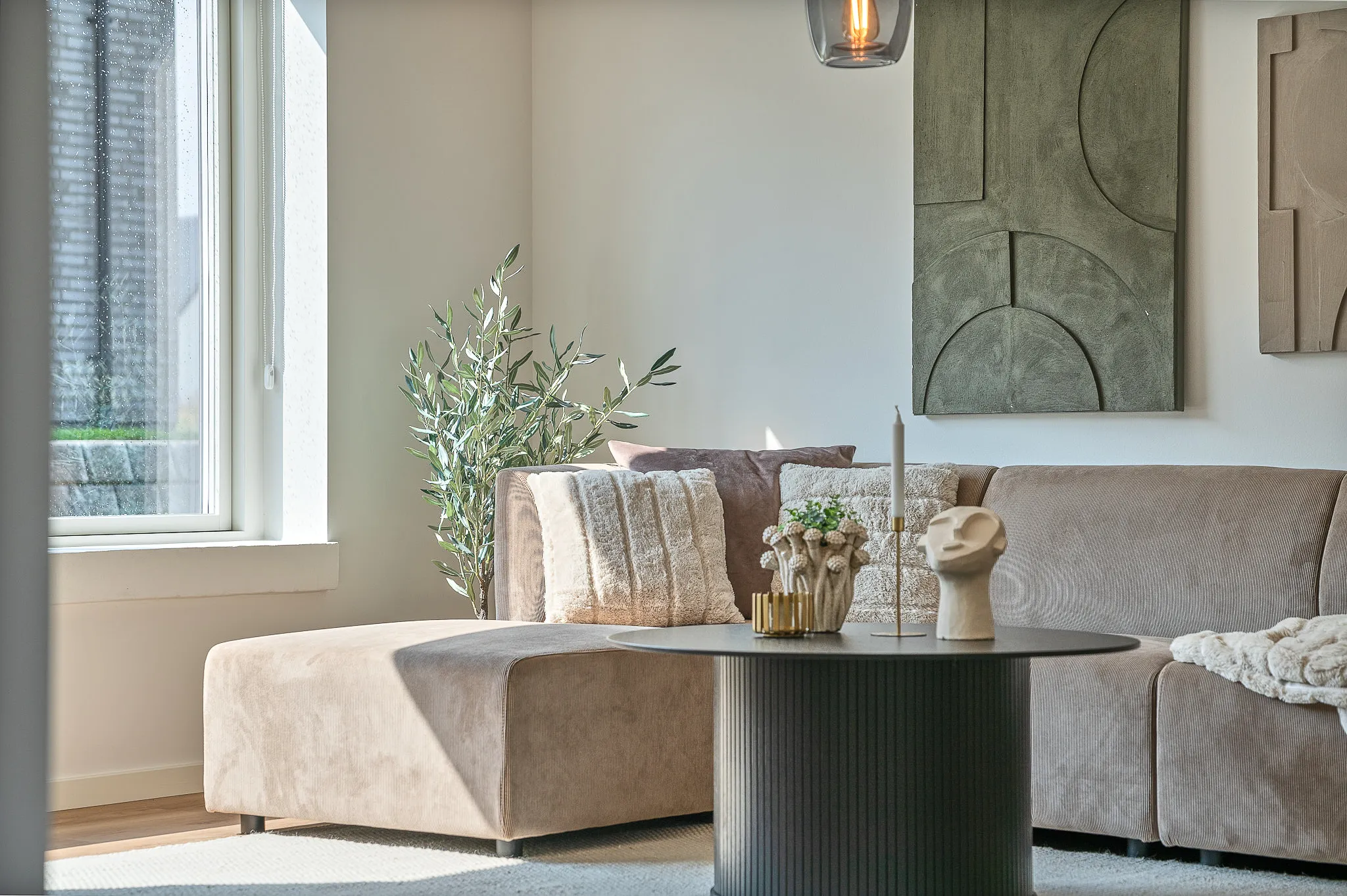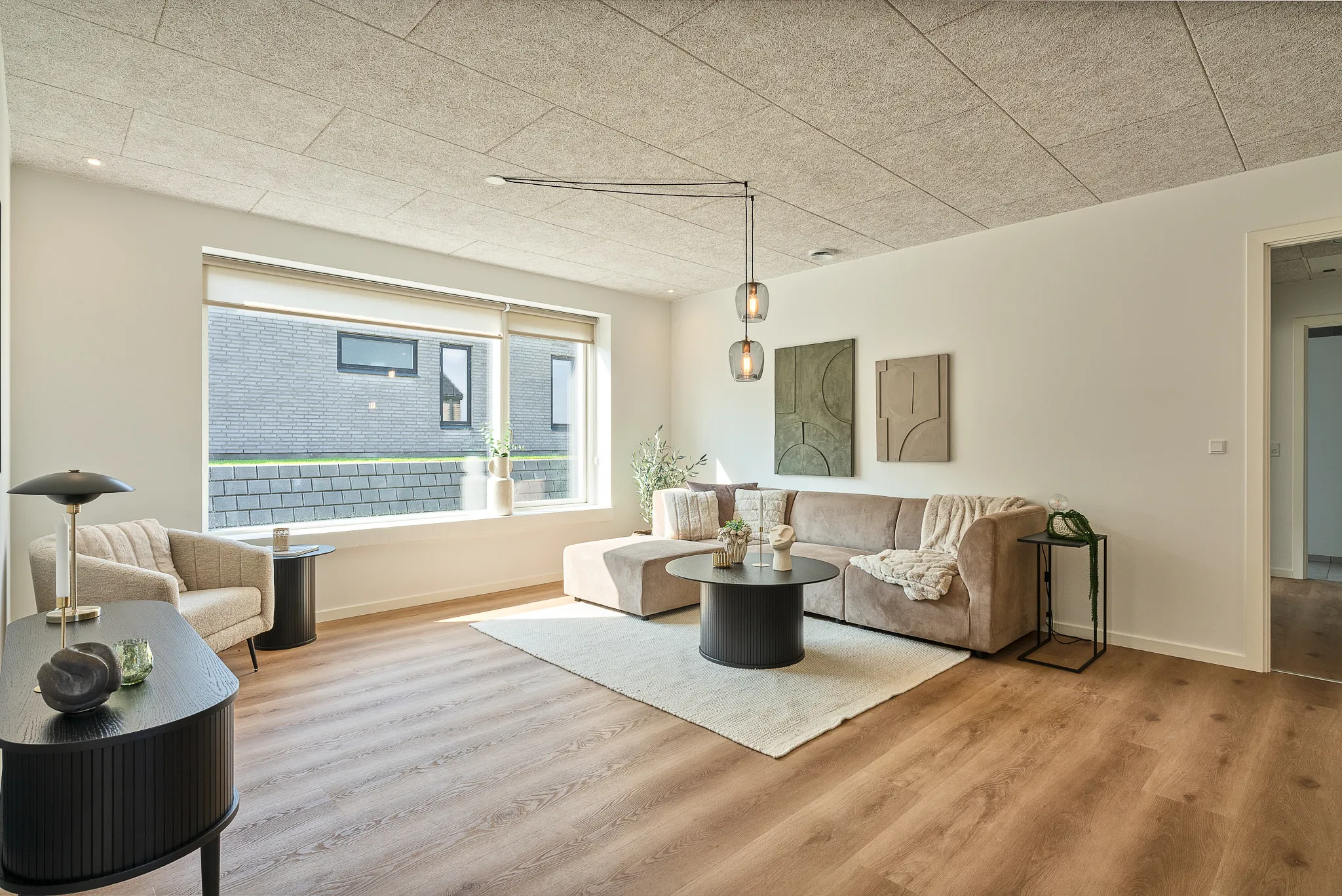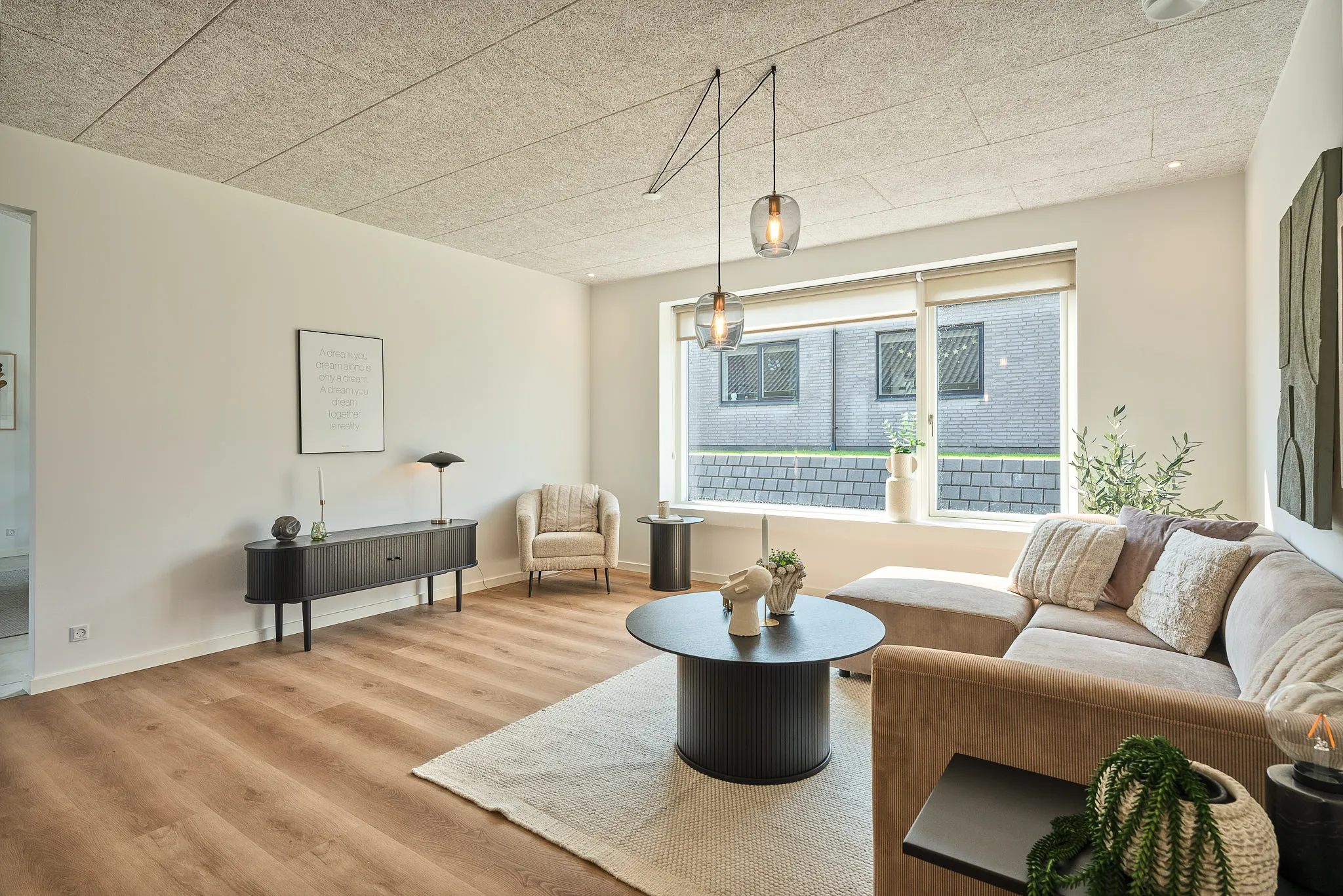 Køkken-alrum med store glaspartier, særsklit stue og walk-in.