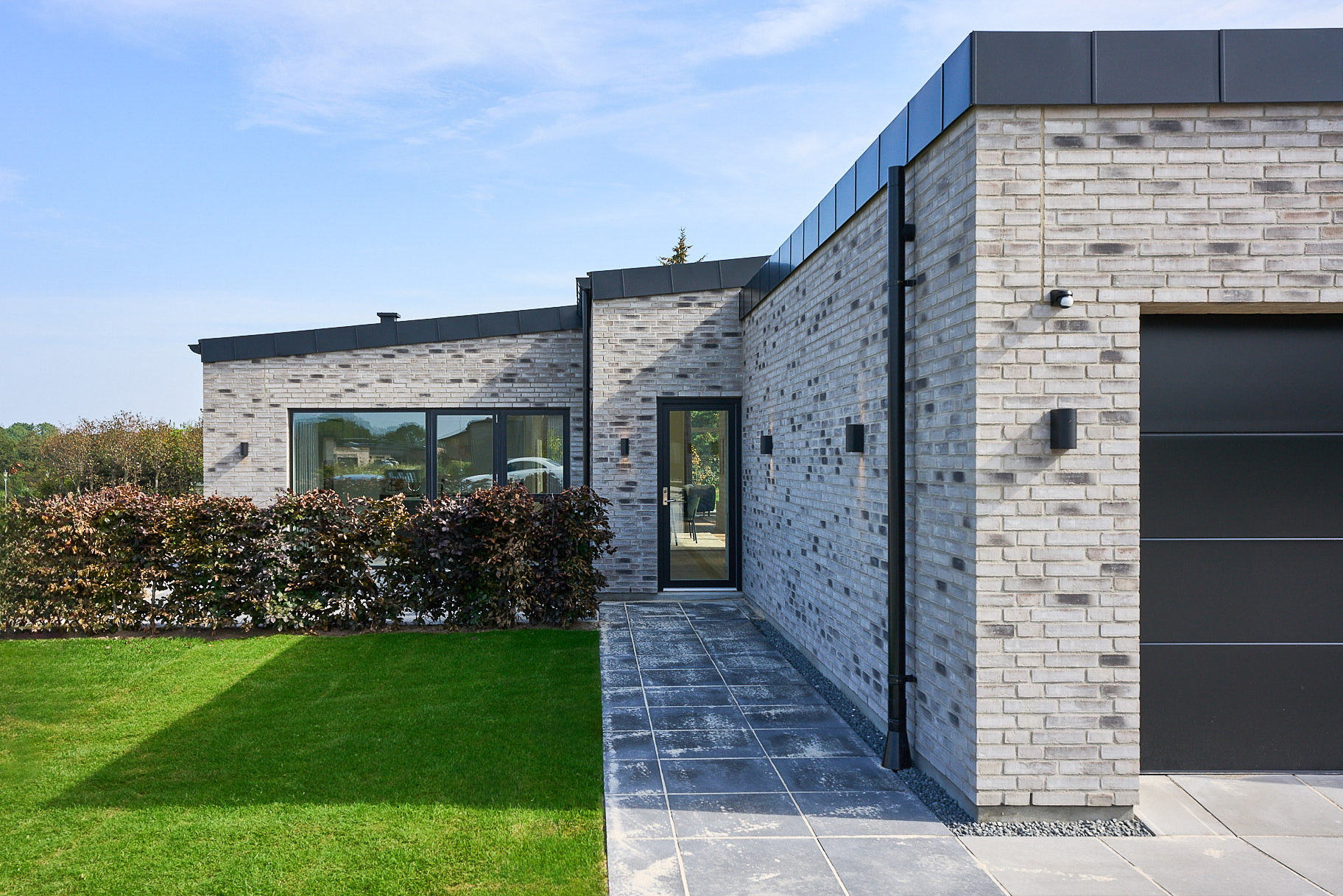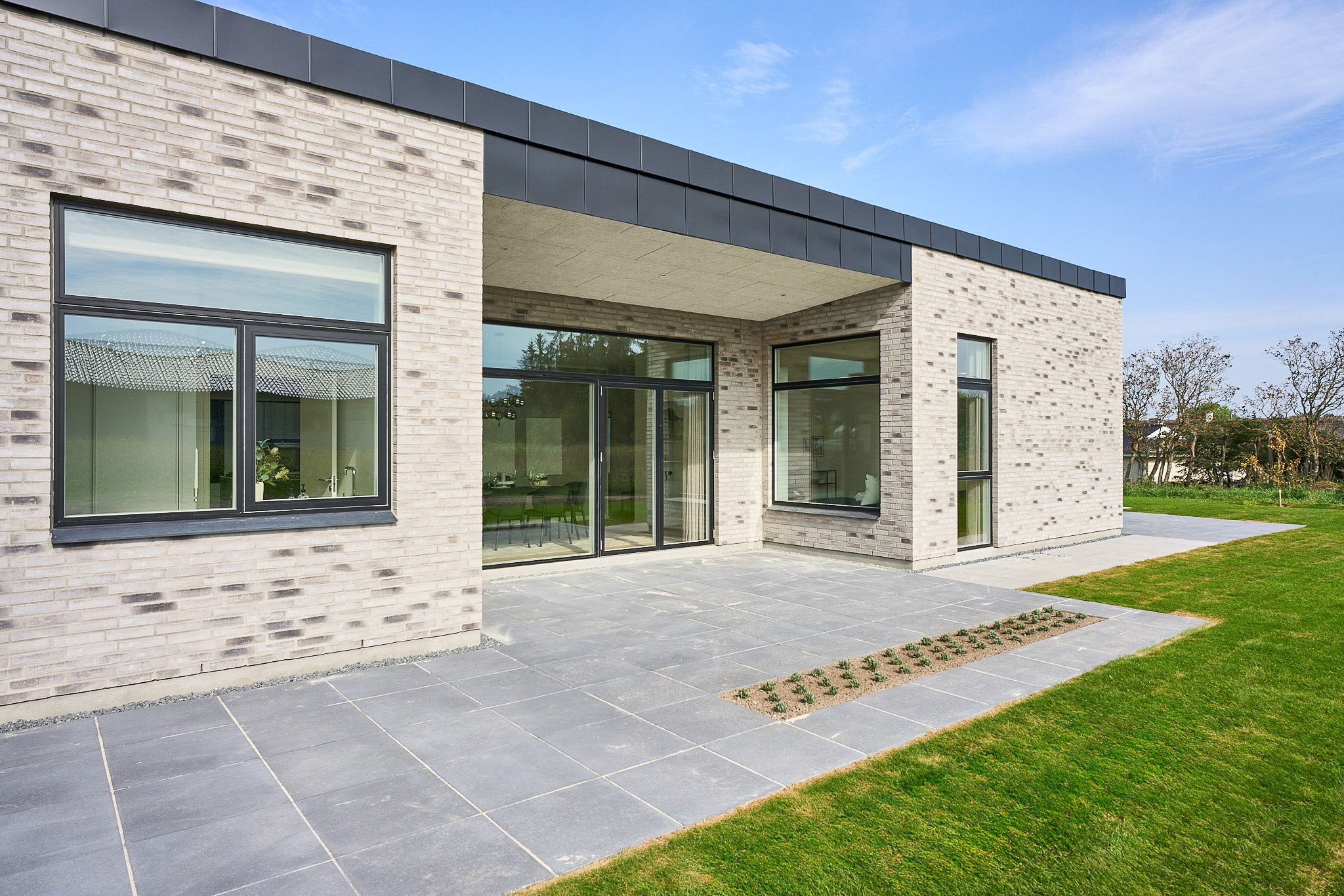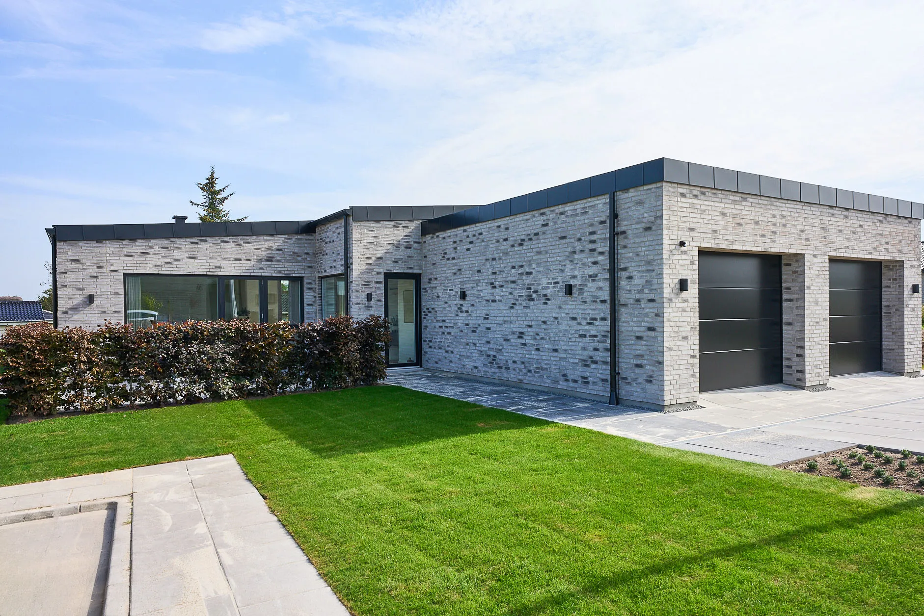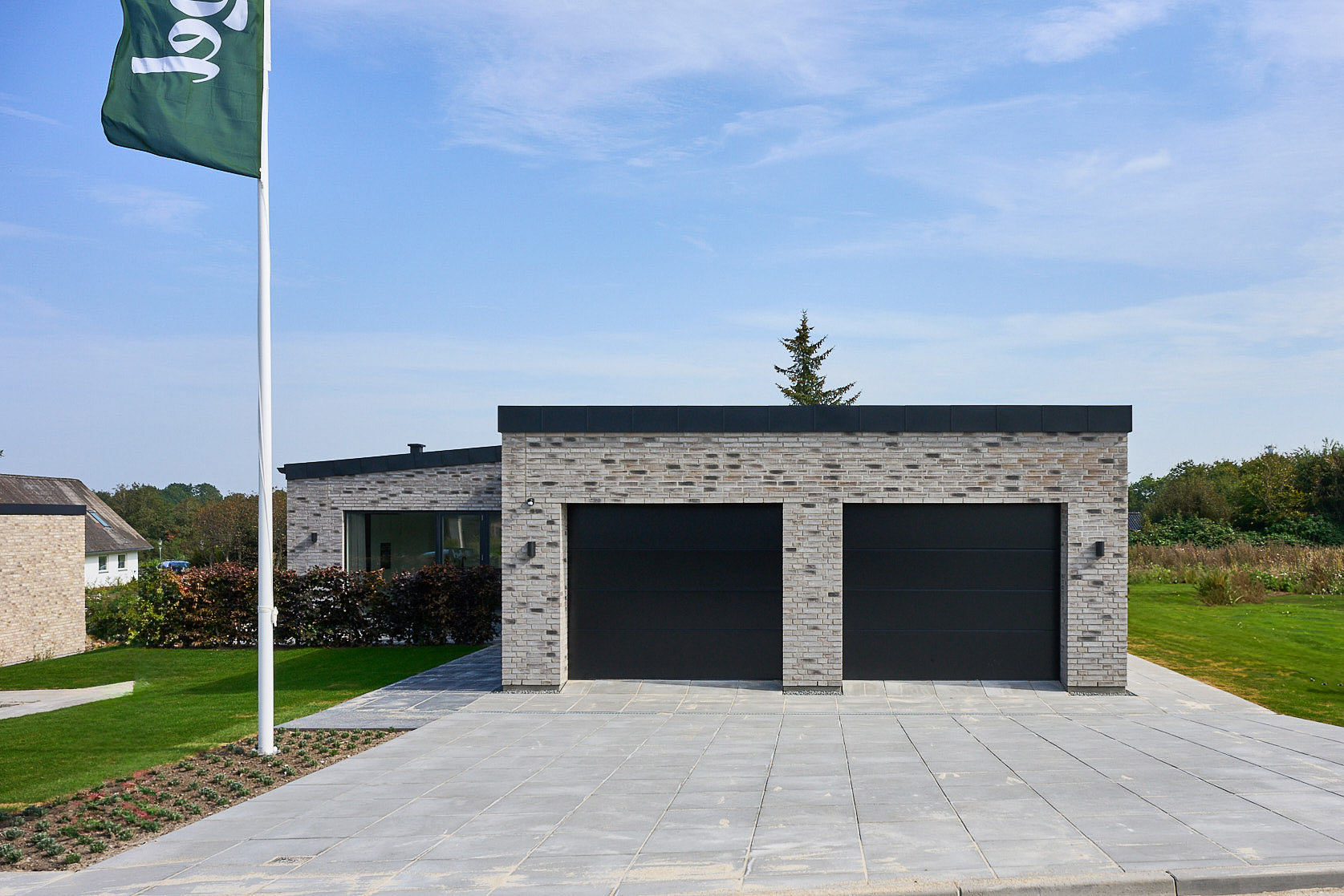 Familievenlig villa med ensidig taghældning og dobbeltdøre ud mod terrassen i garagen