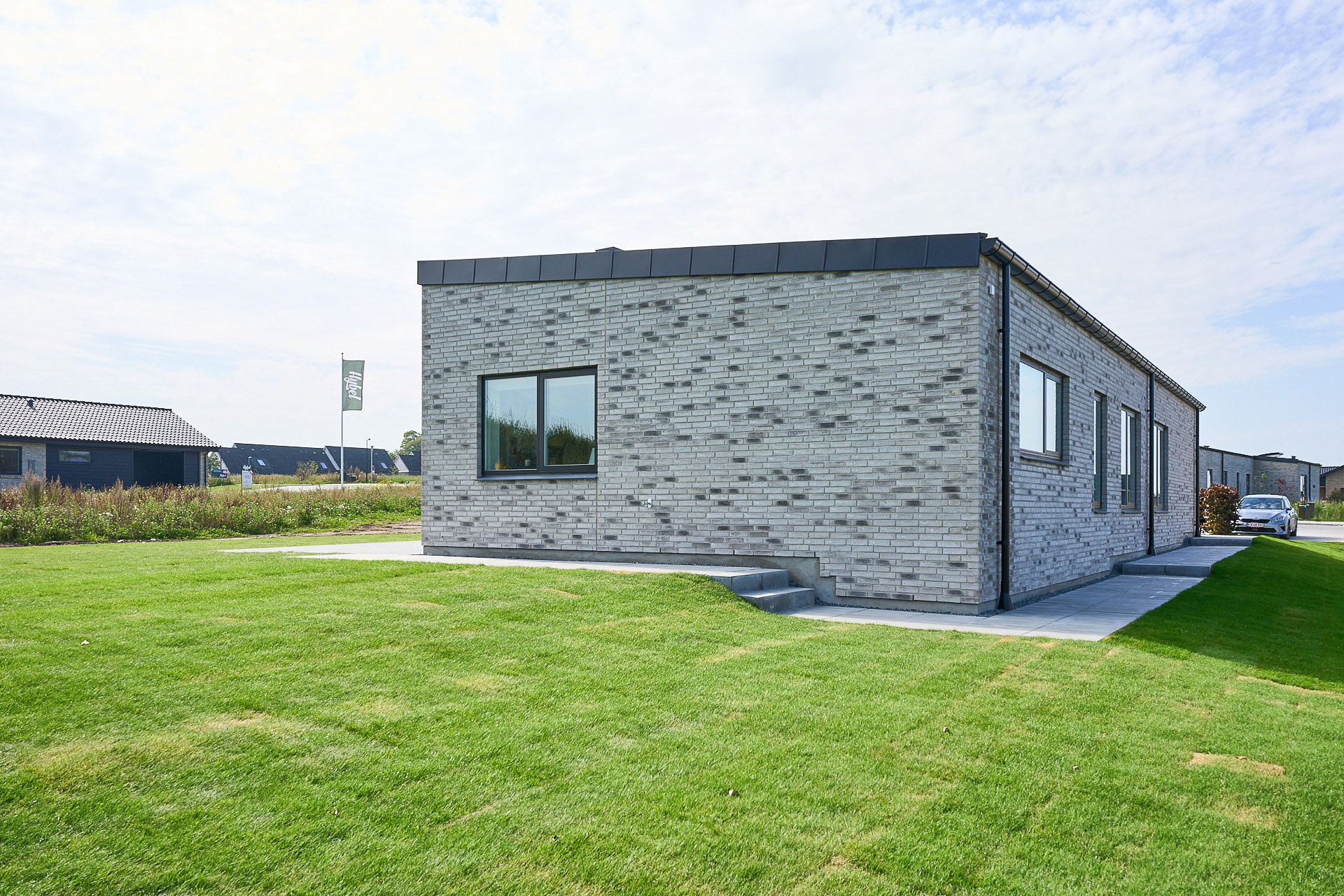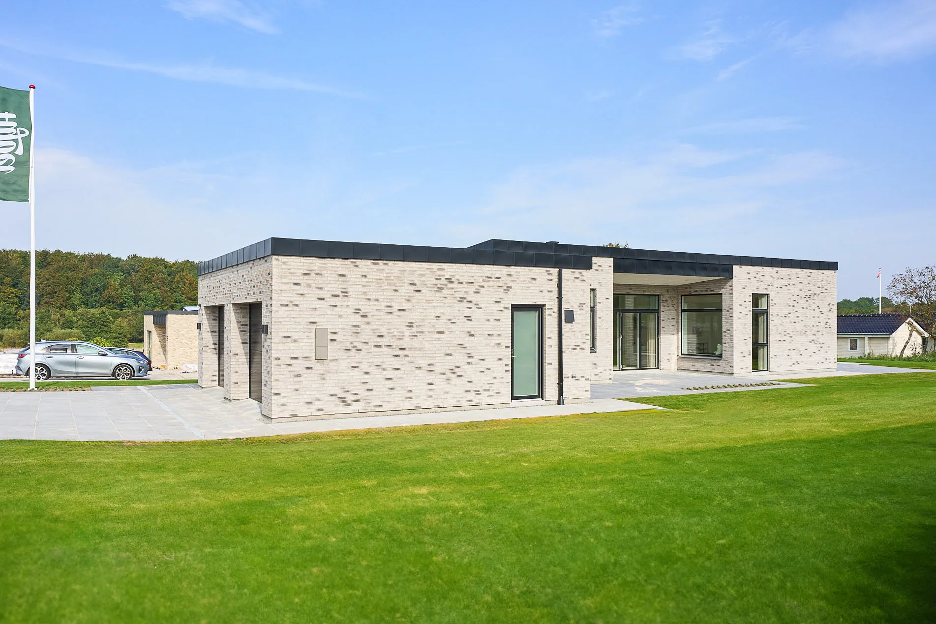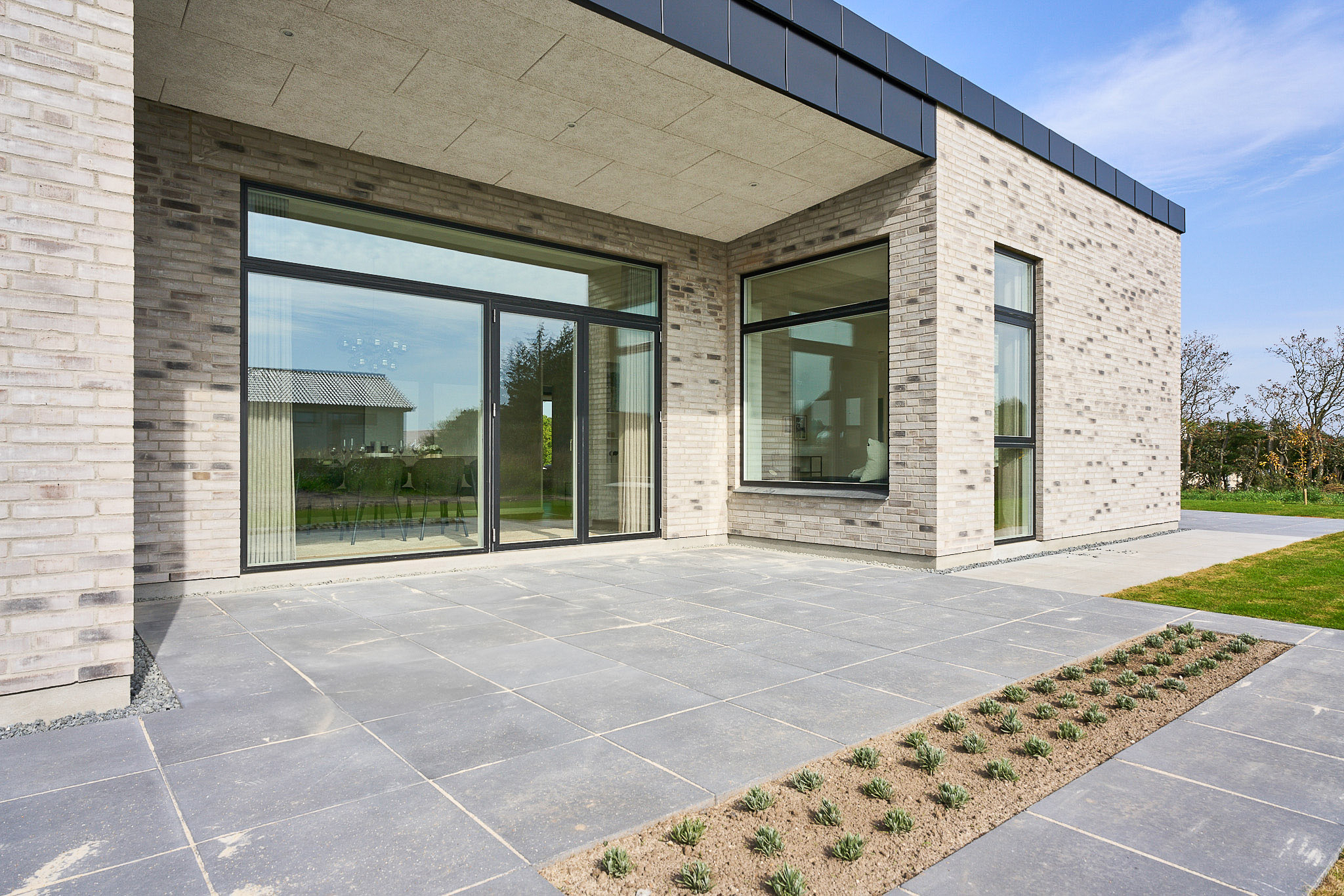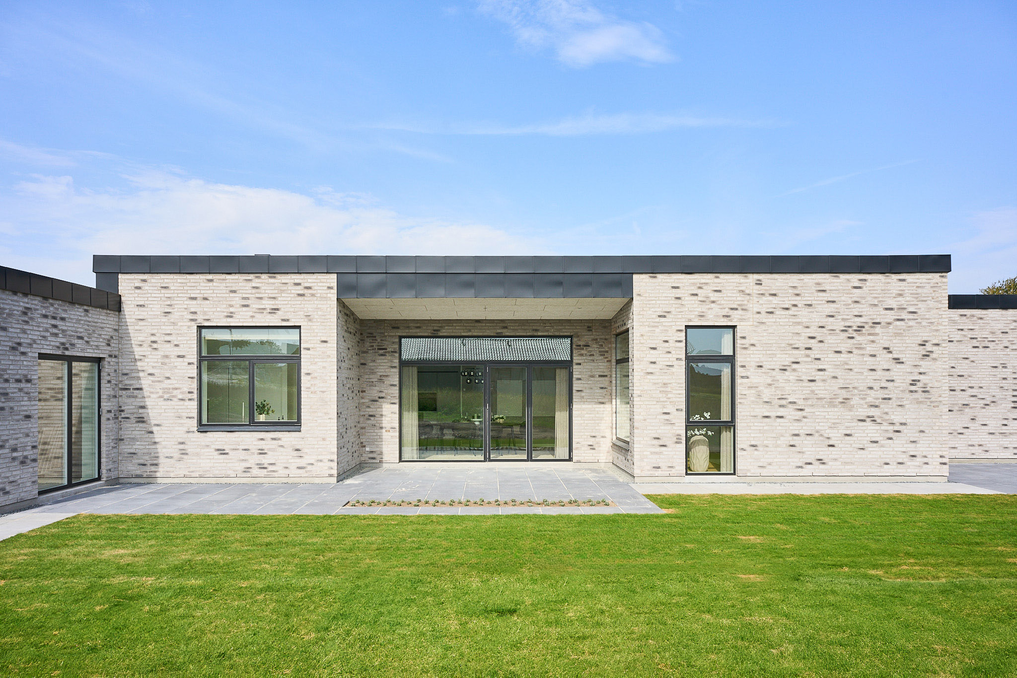 Familievenlig villa med ensidig taghældning og dobbeltdøre ud mod terrassen i garagen