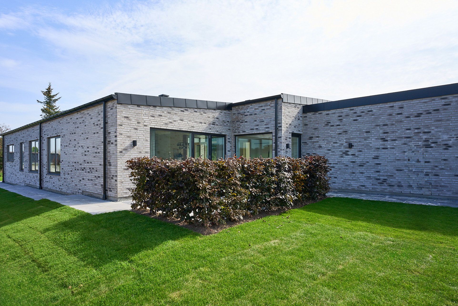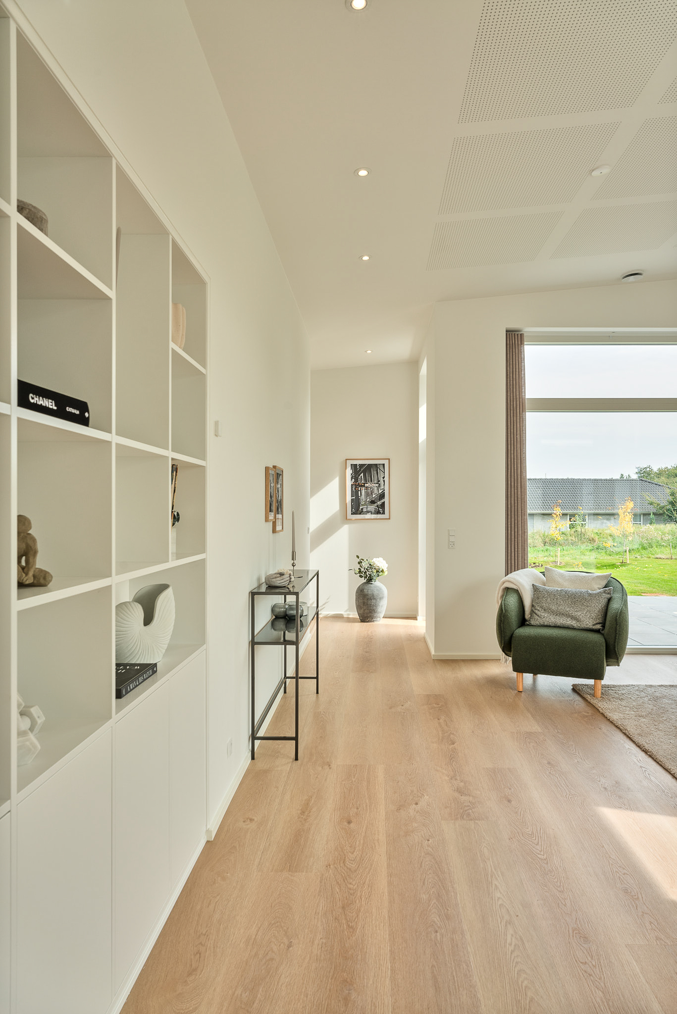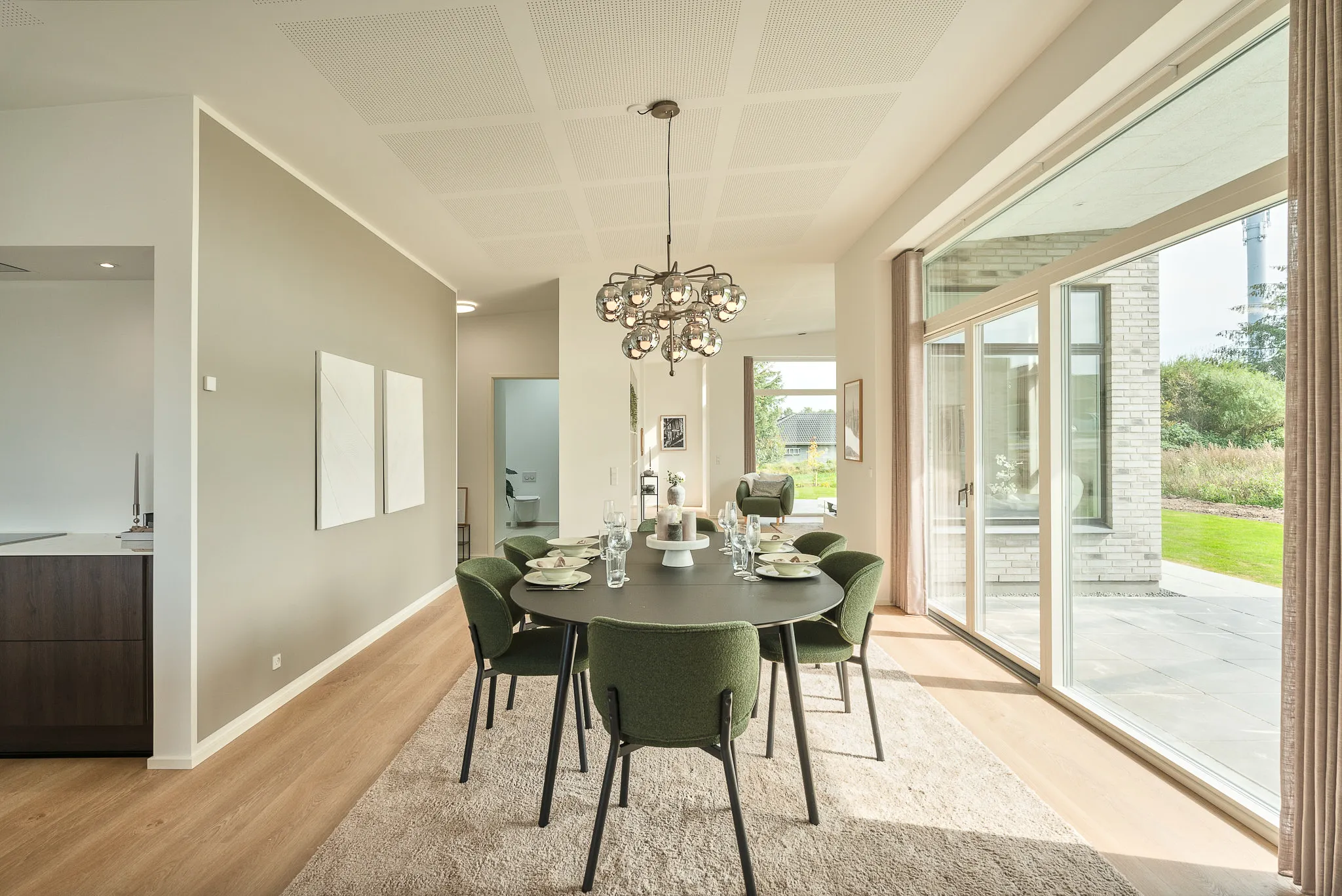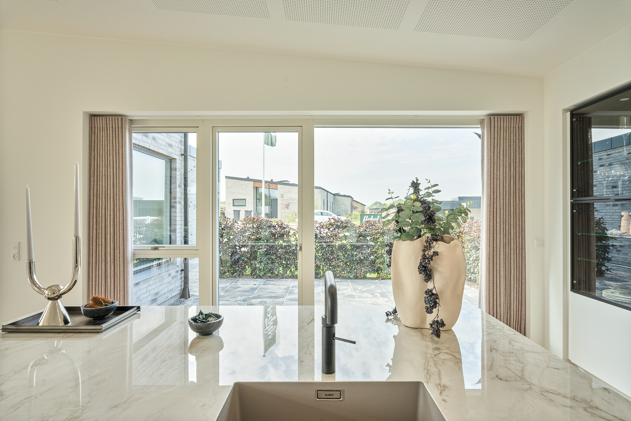 Familievenlig villa med ensidig taghældning og dobbeltdøre ud mod terrassen i garagen