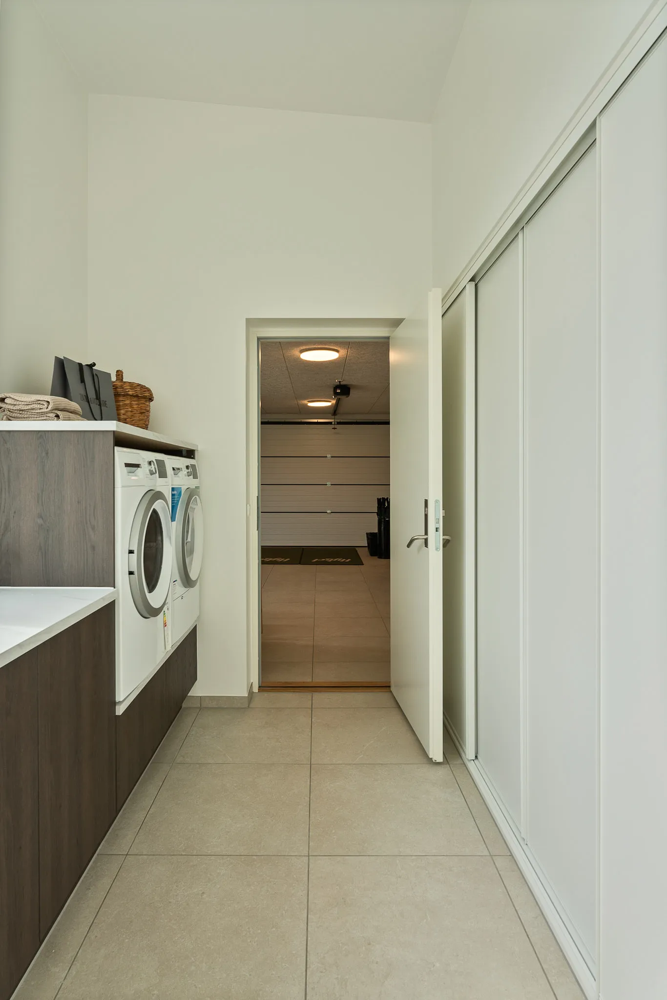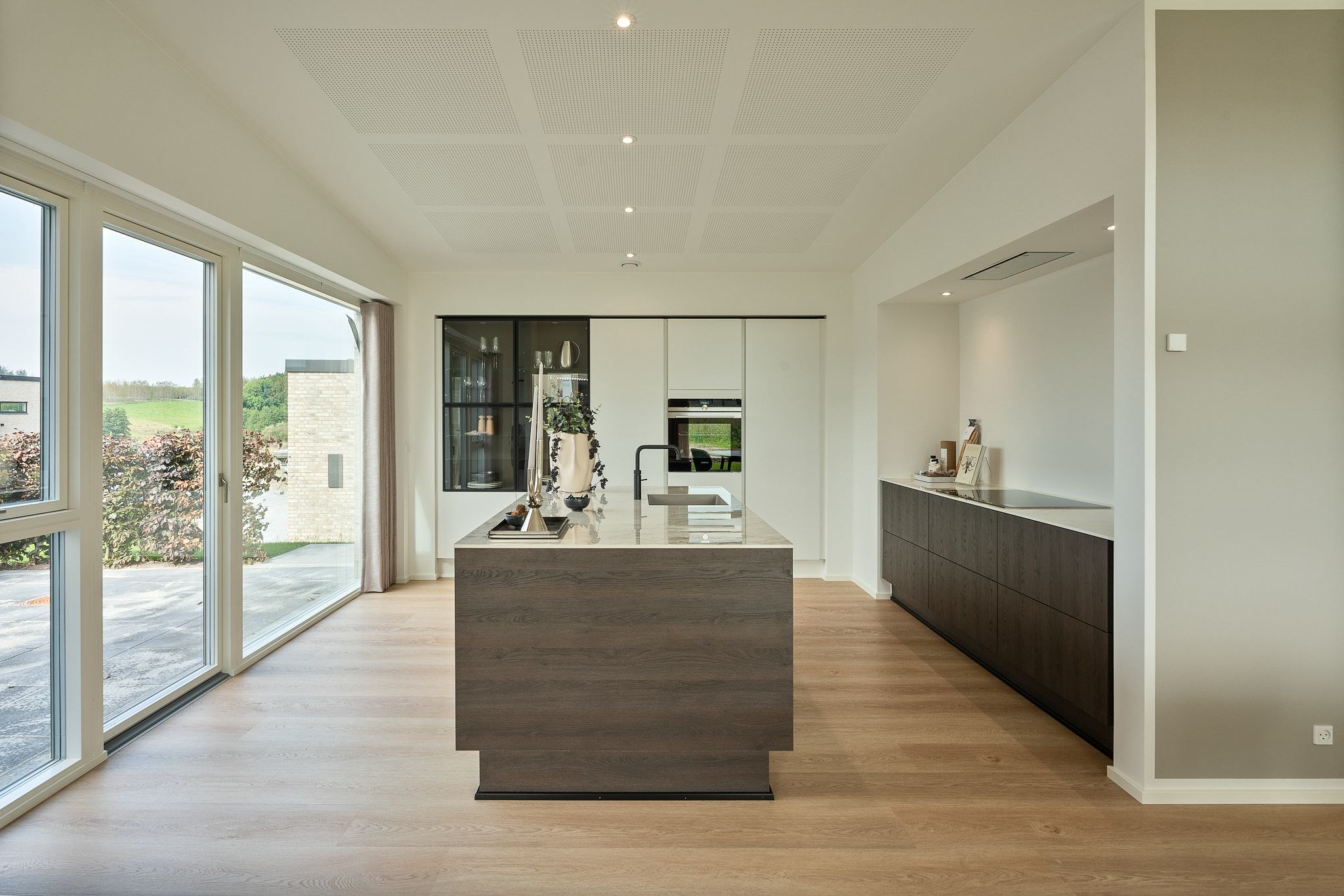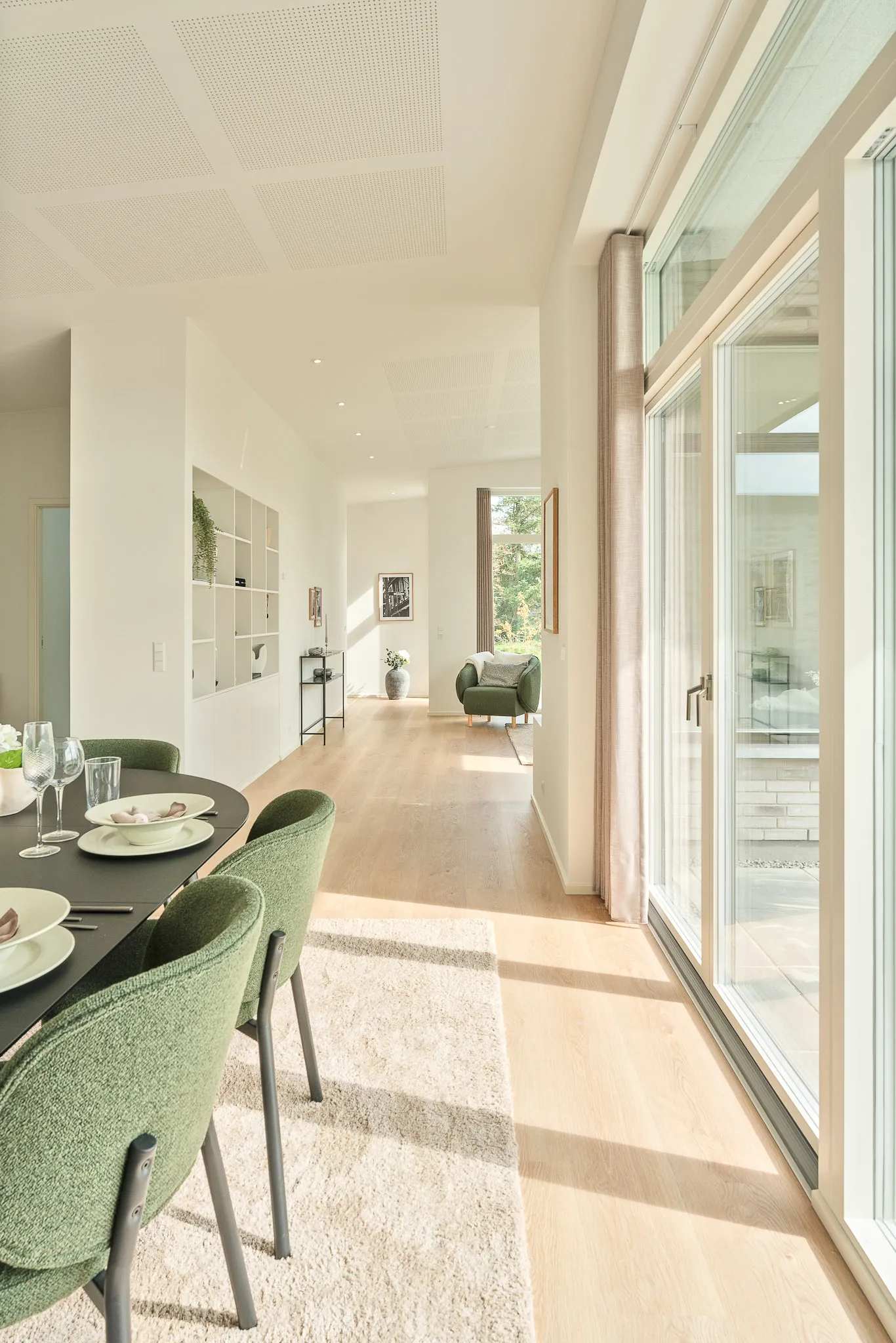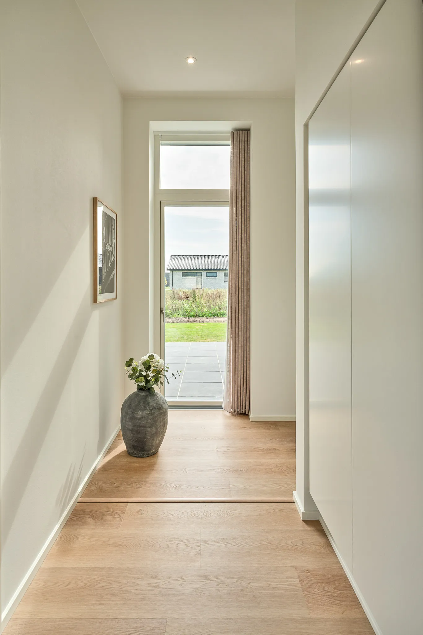 Familievenlig villa med ensidig taghældning og dobbeltdøre ud mod terrassen i garagen