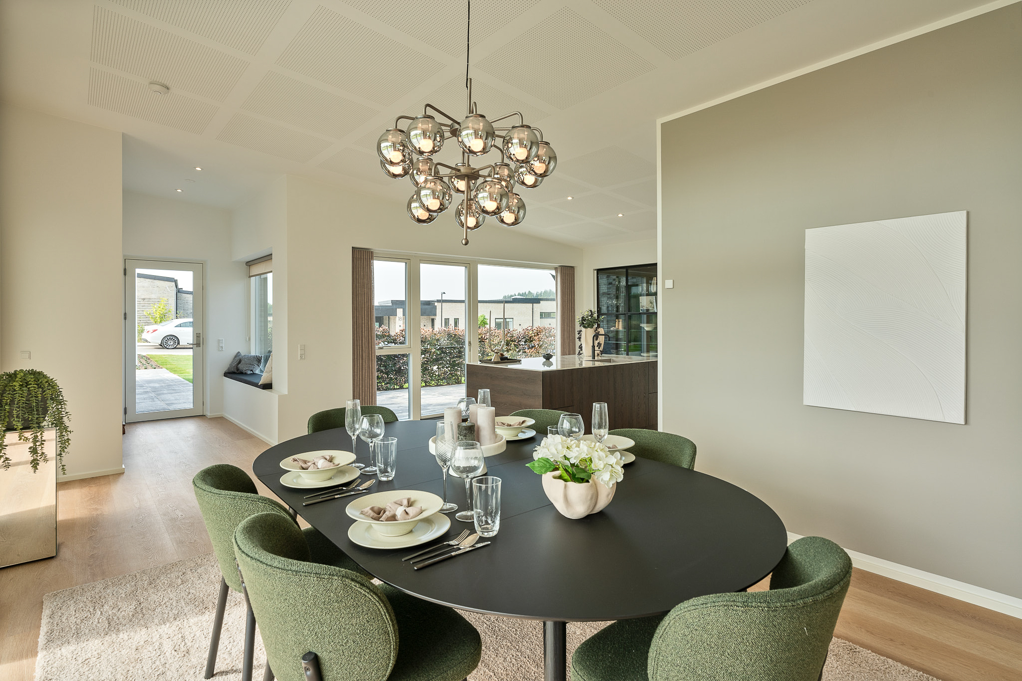 Dobbelt garage, lyst gennemgående køkken/alrum og stue, lækker forældreafdeling