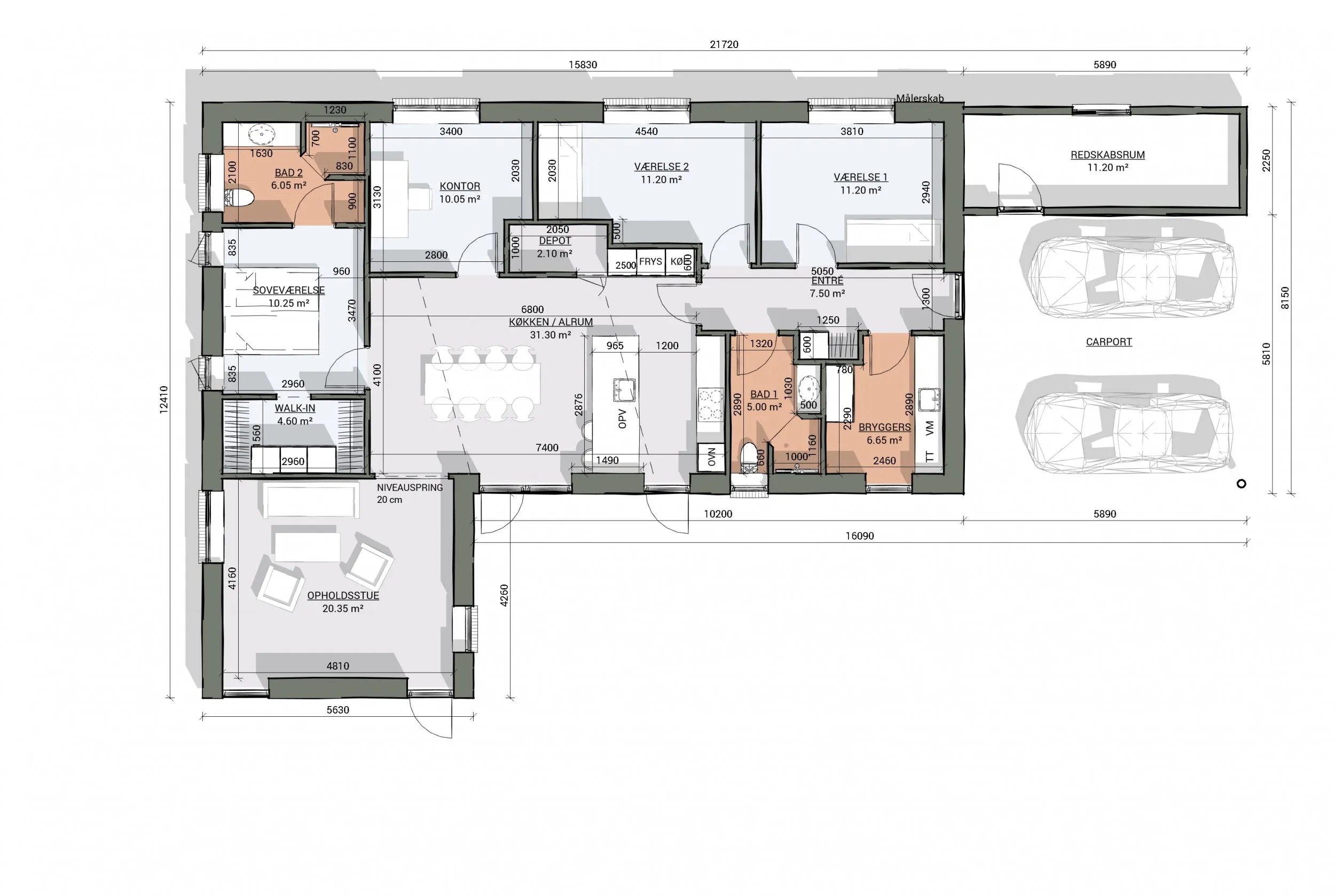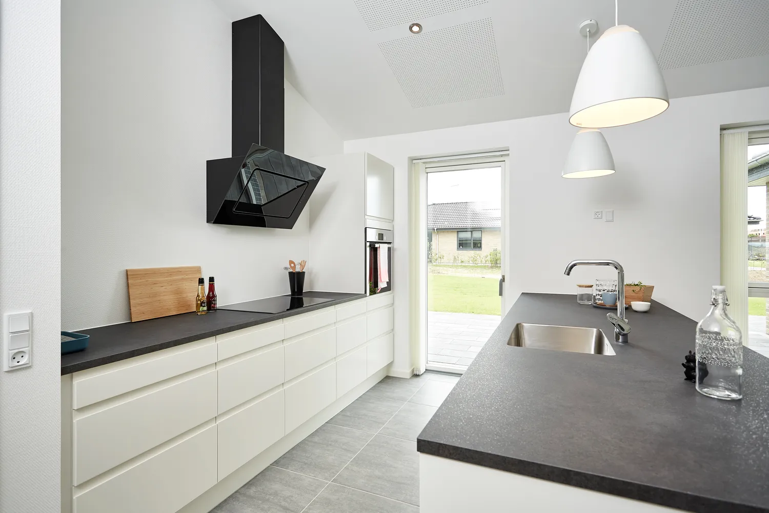 Køkken/alrum med skråloft og akustikfelter, sænkede lofter i stuen, trin til stuen og Walk-in.