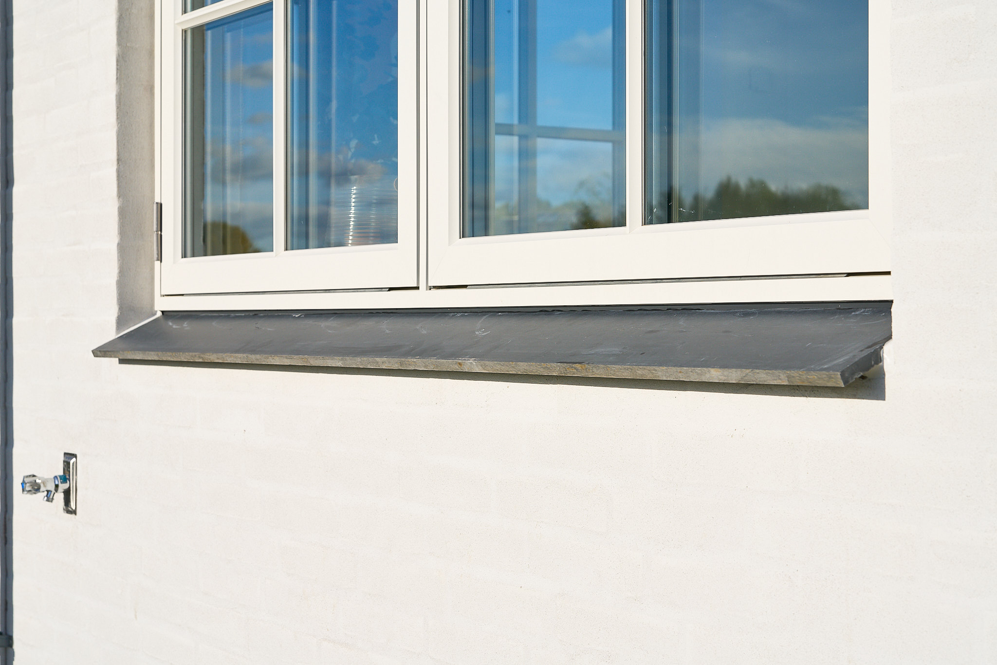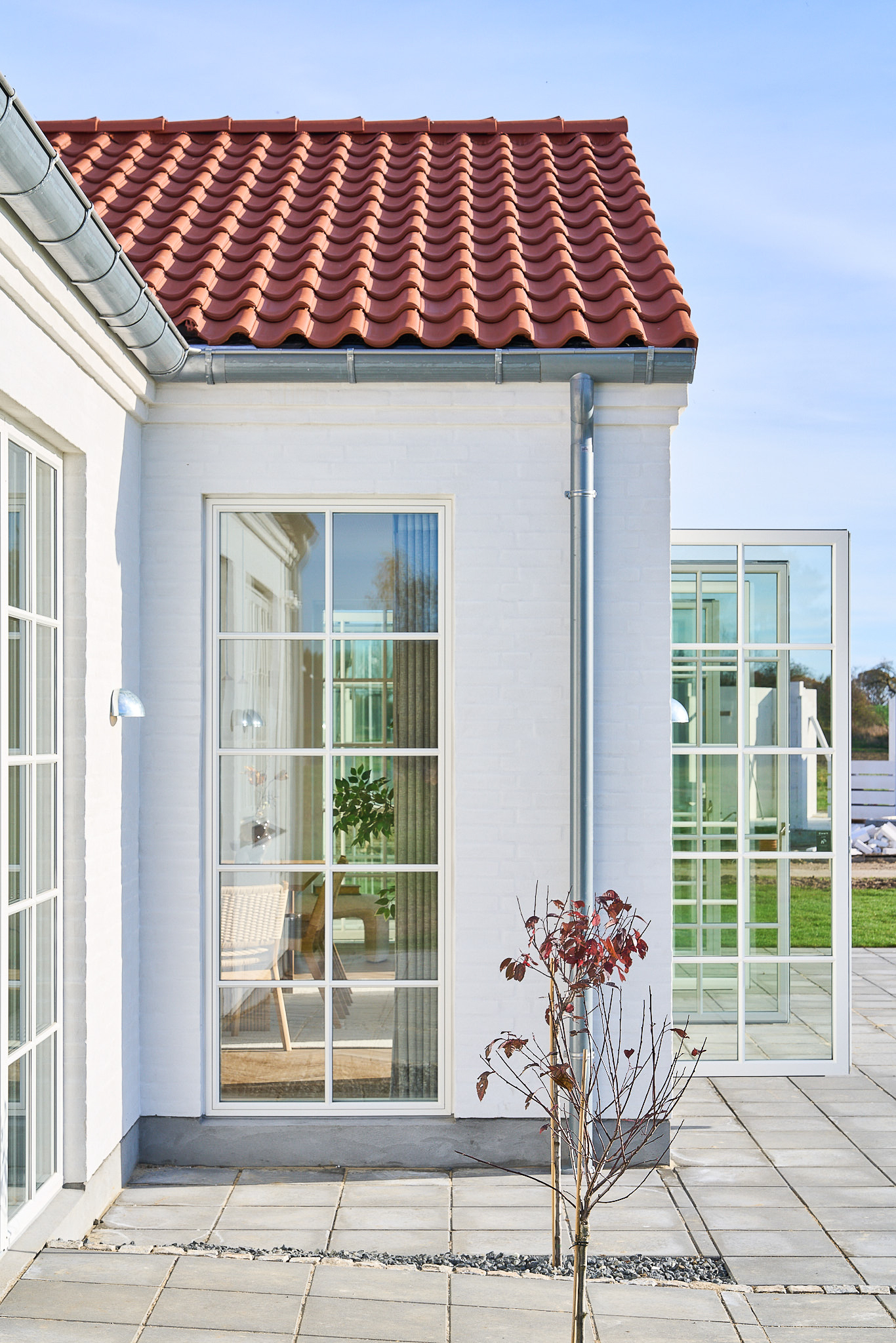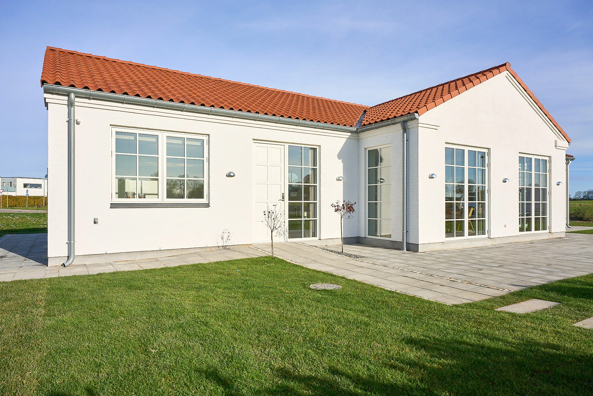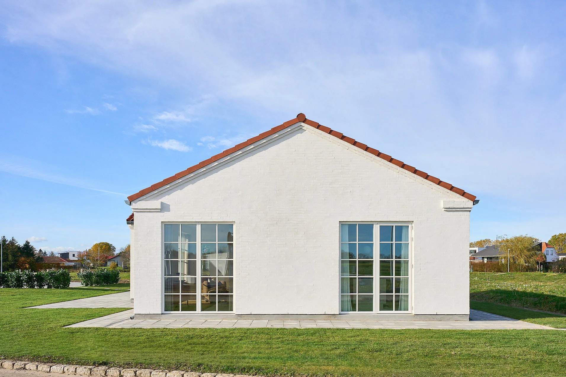Forskudt vinkelhus i palæstil med vandskuret facade, øget loftshøjde, sprosser og gesims