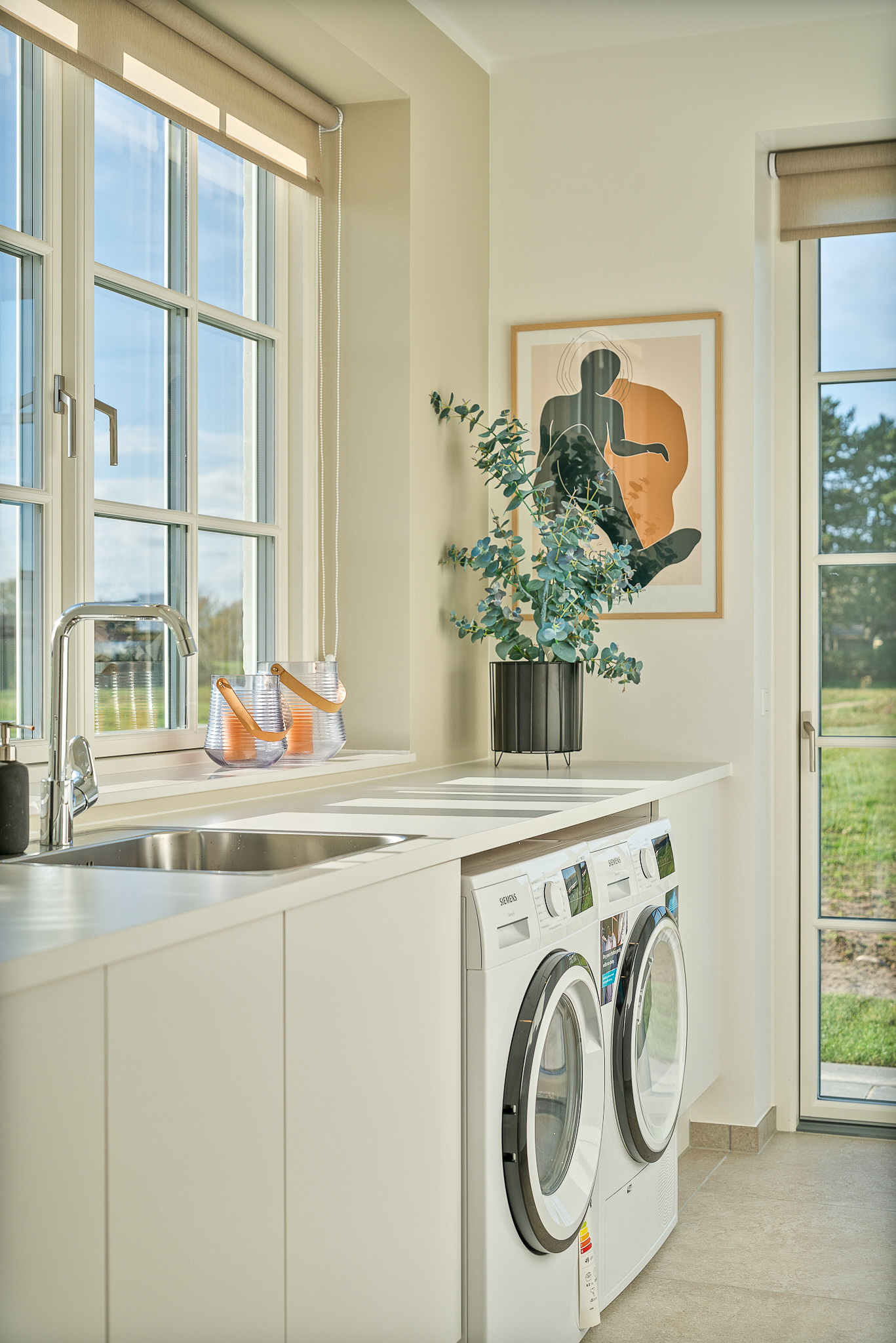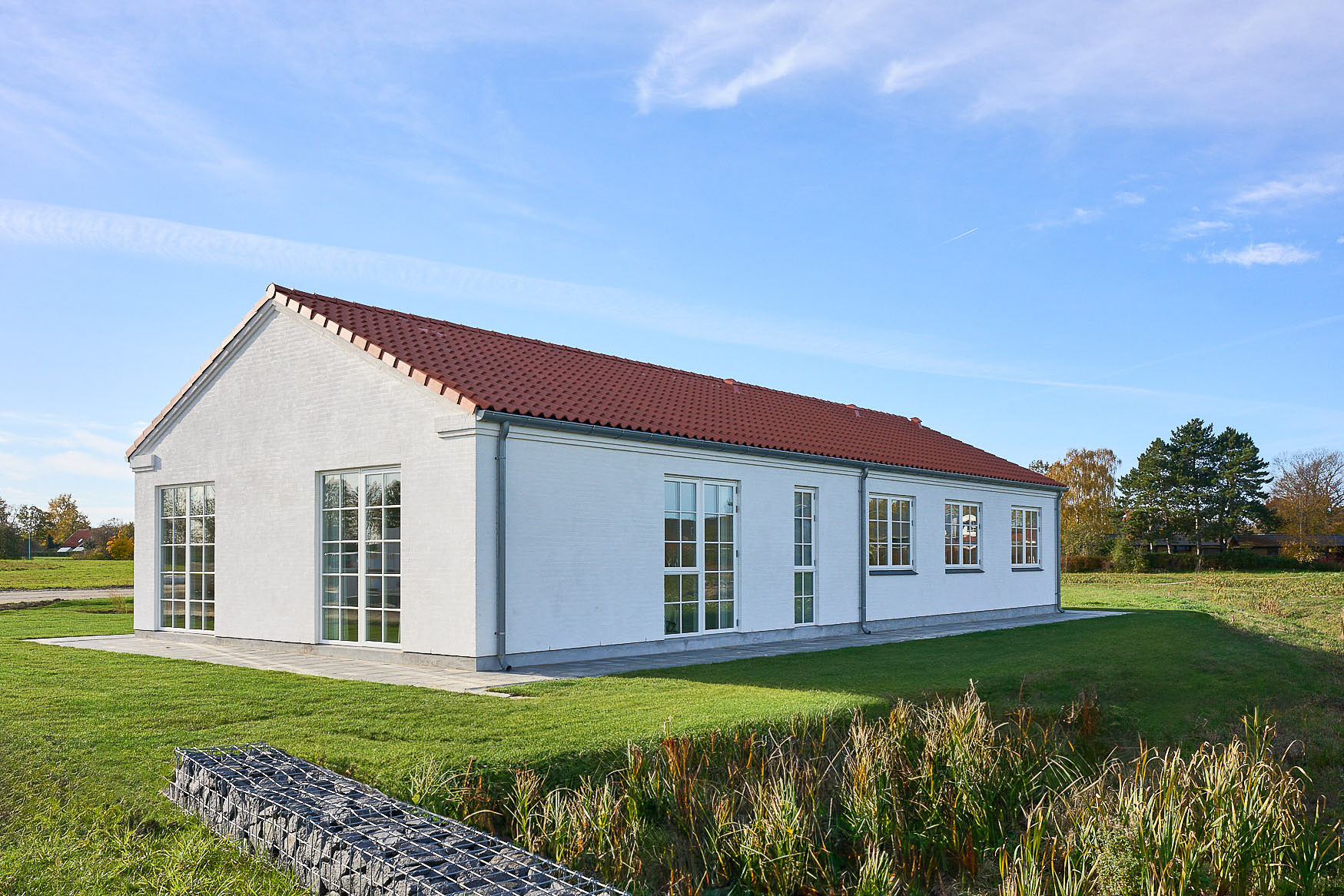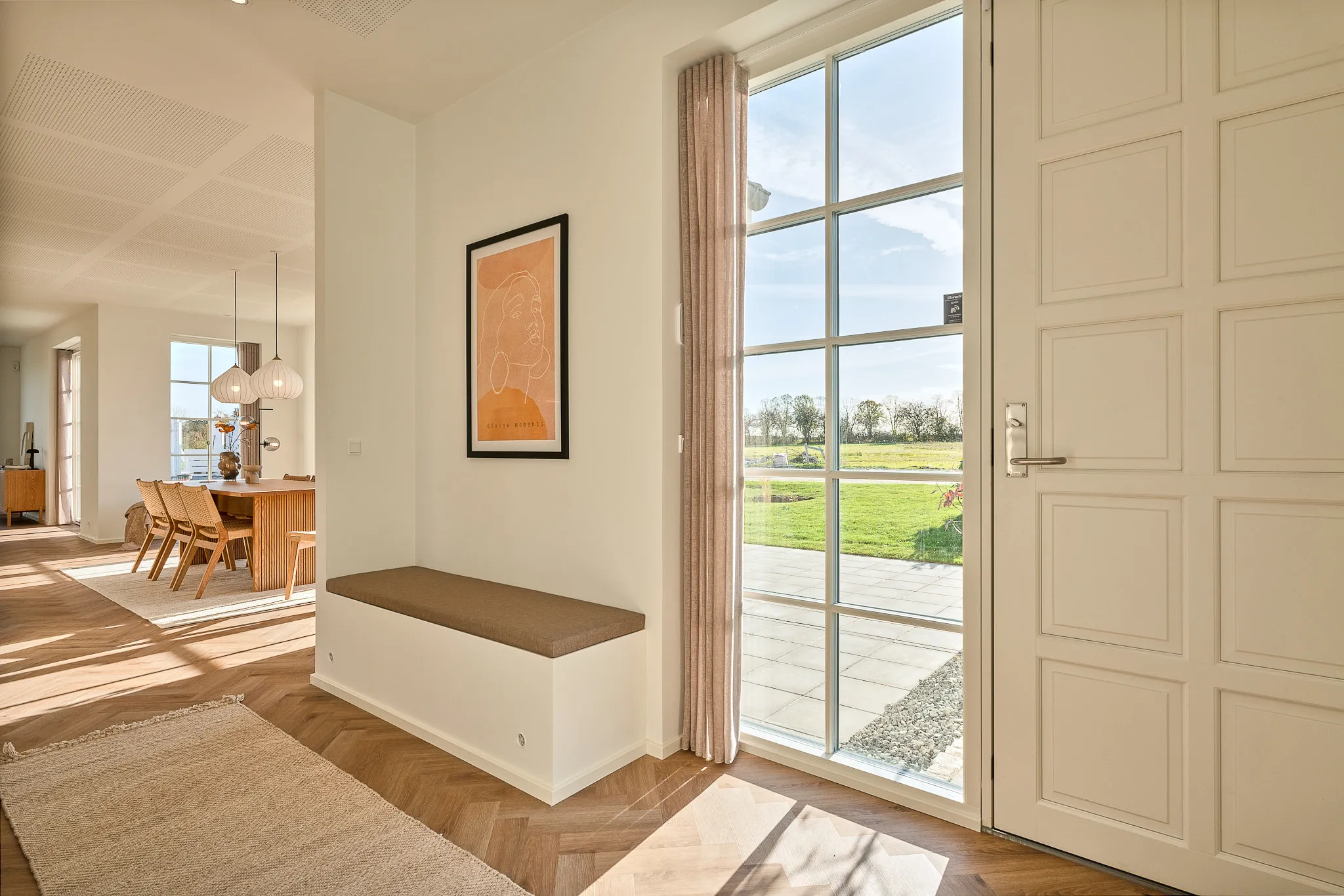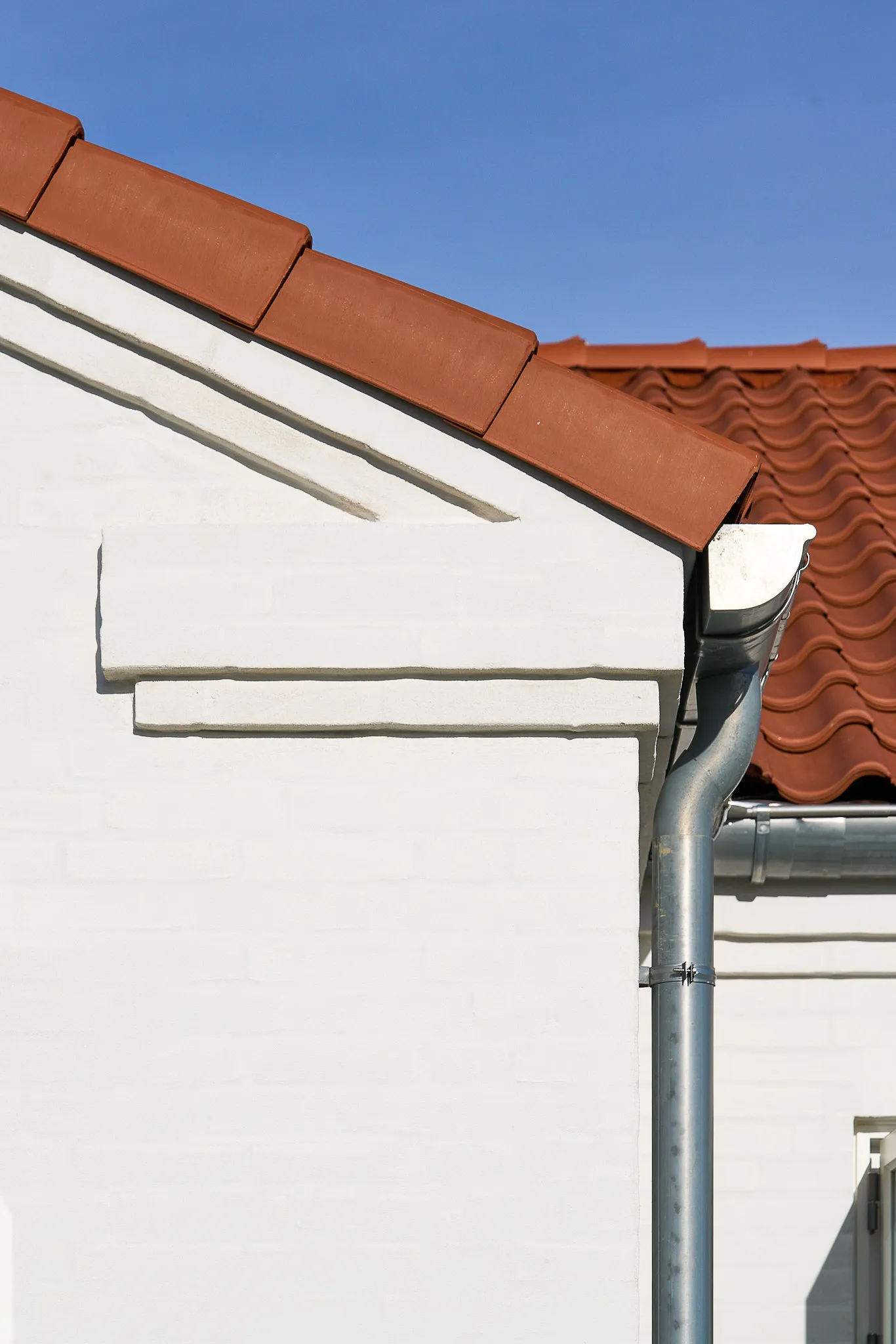 Forskudt vinkelhus i palæstil med vandskuret facade, øget loftshøjde, sprosser og gesims