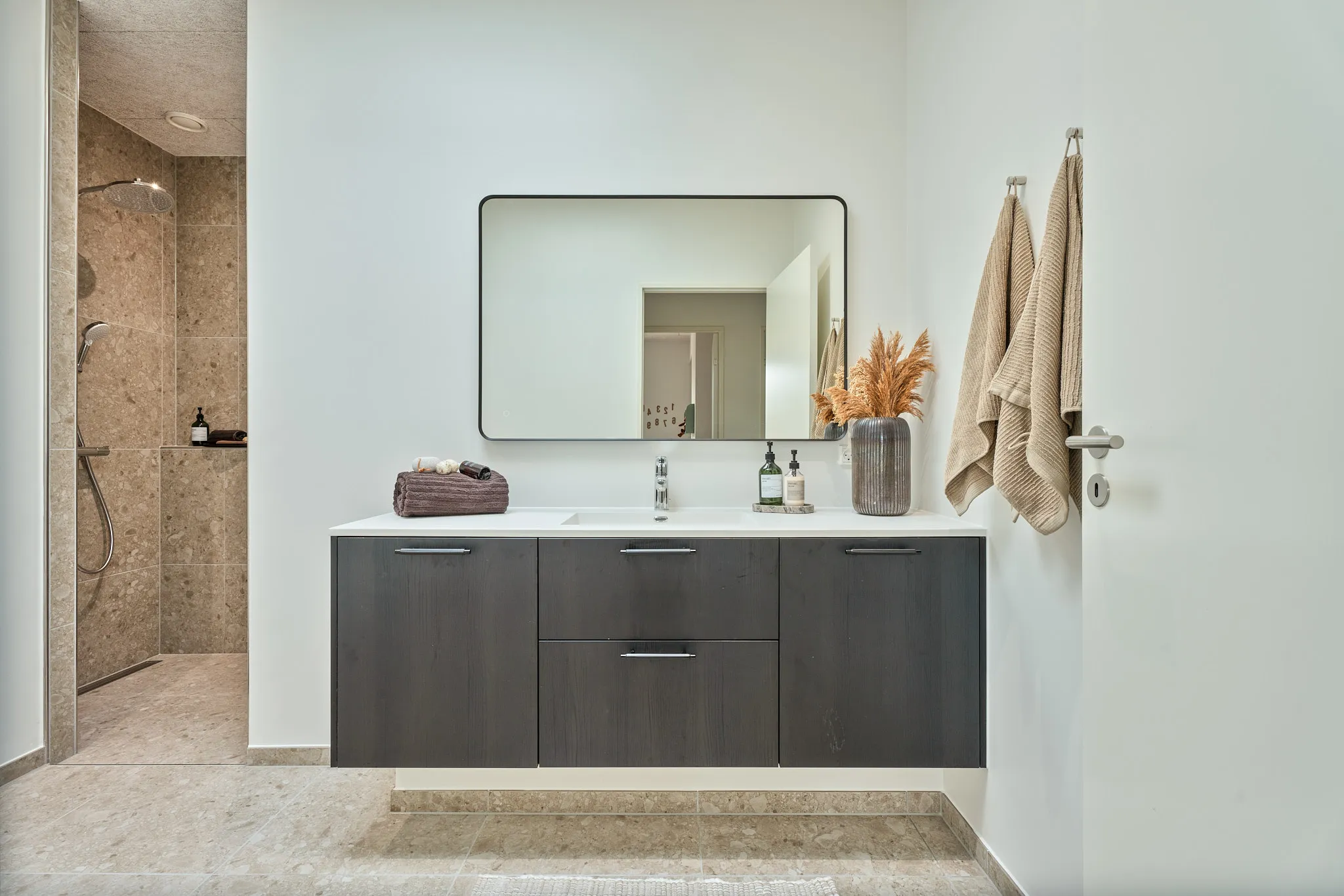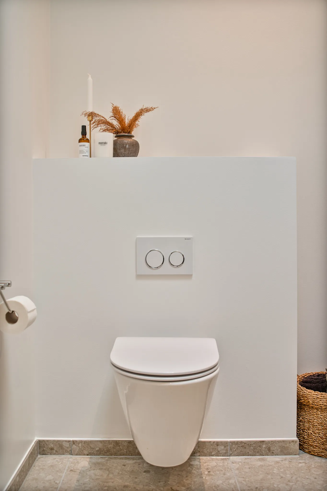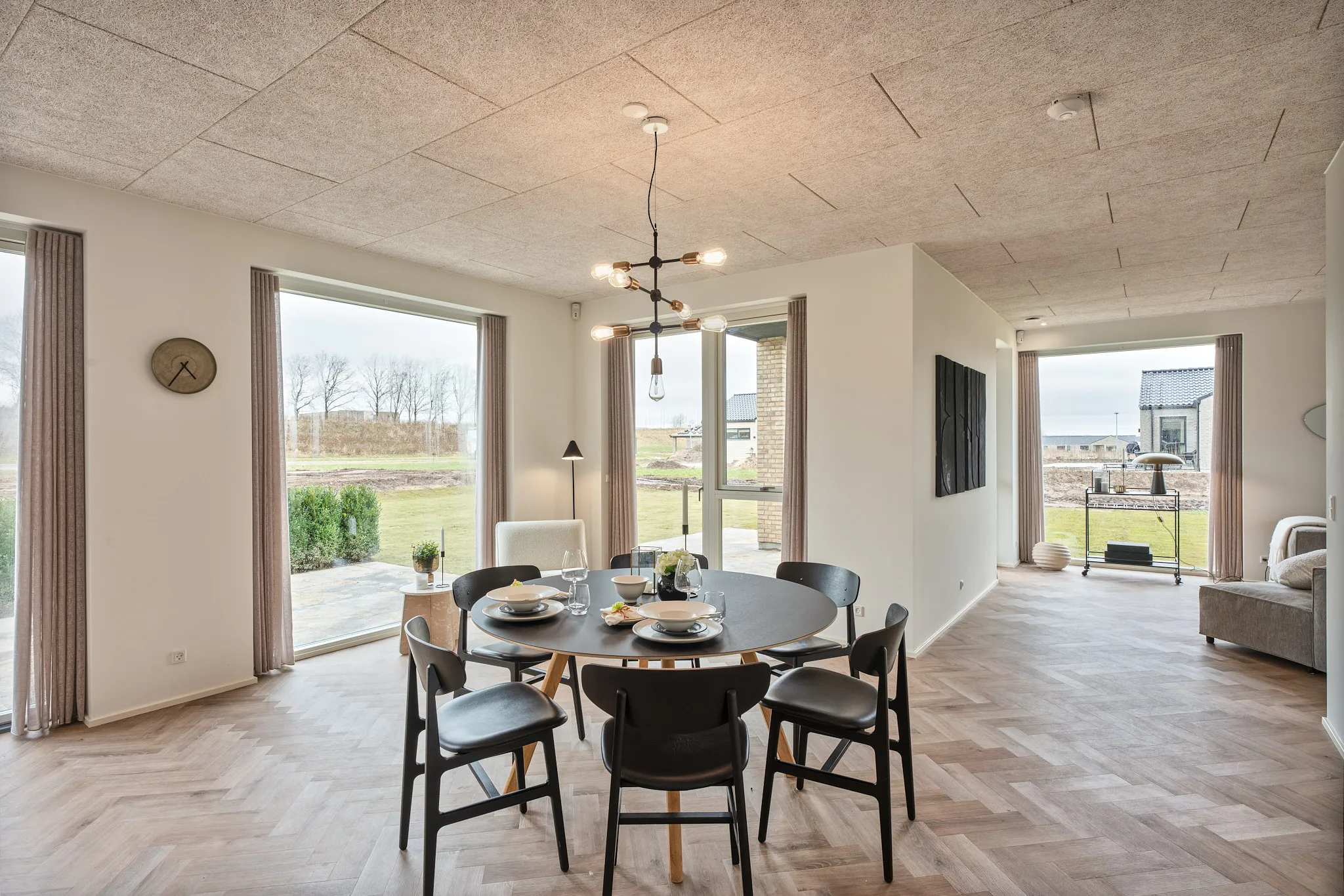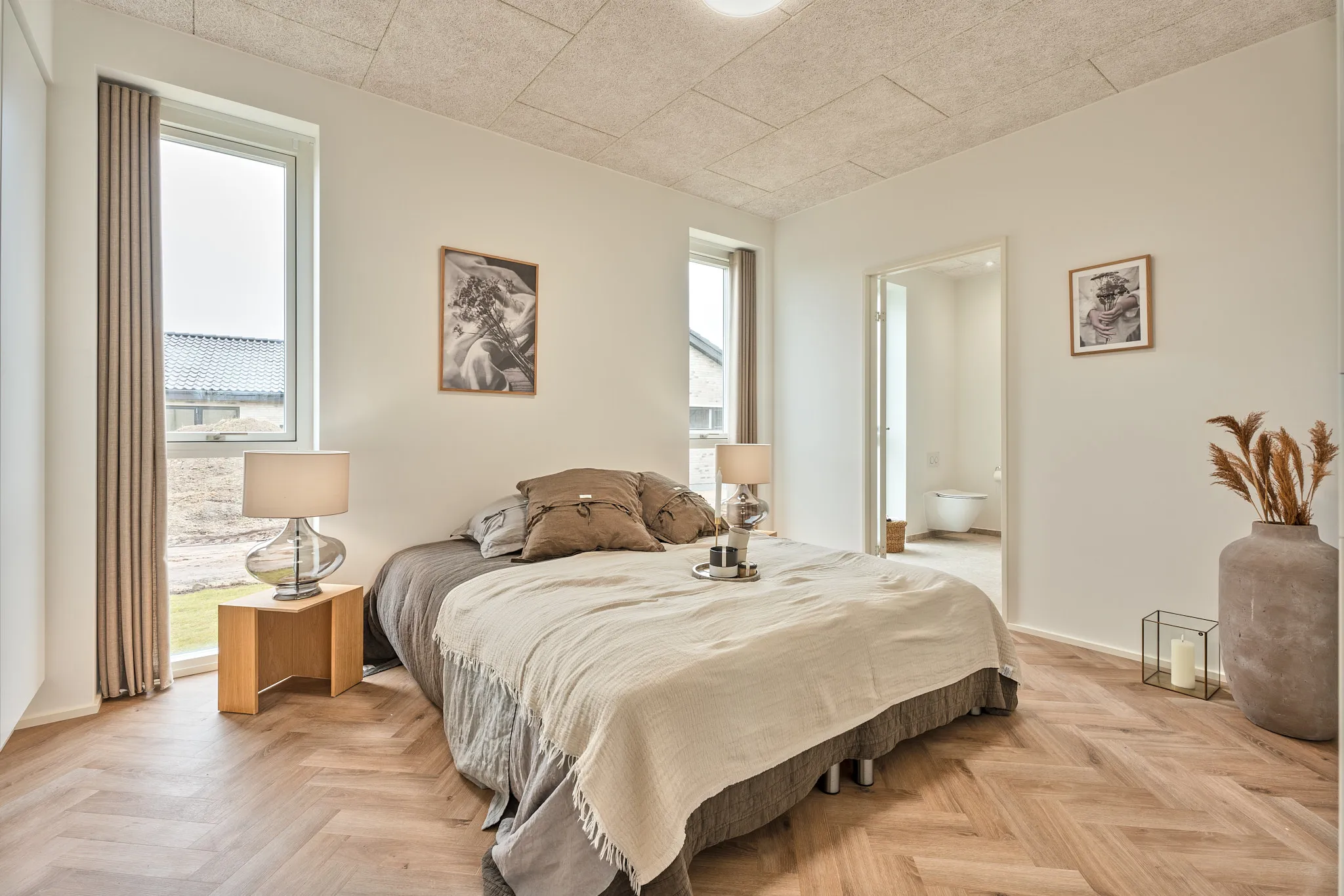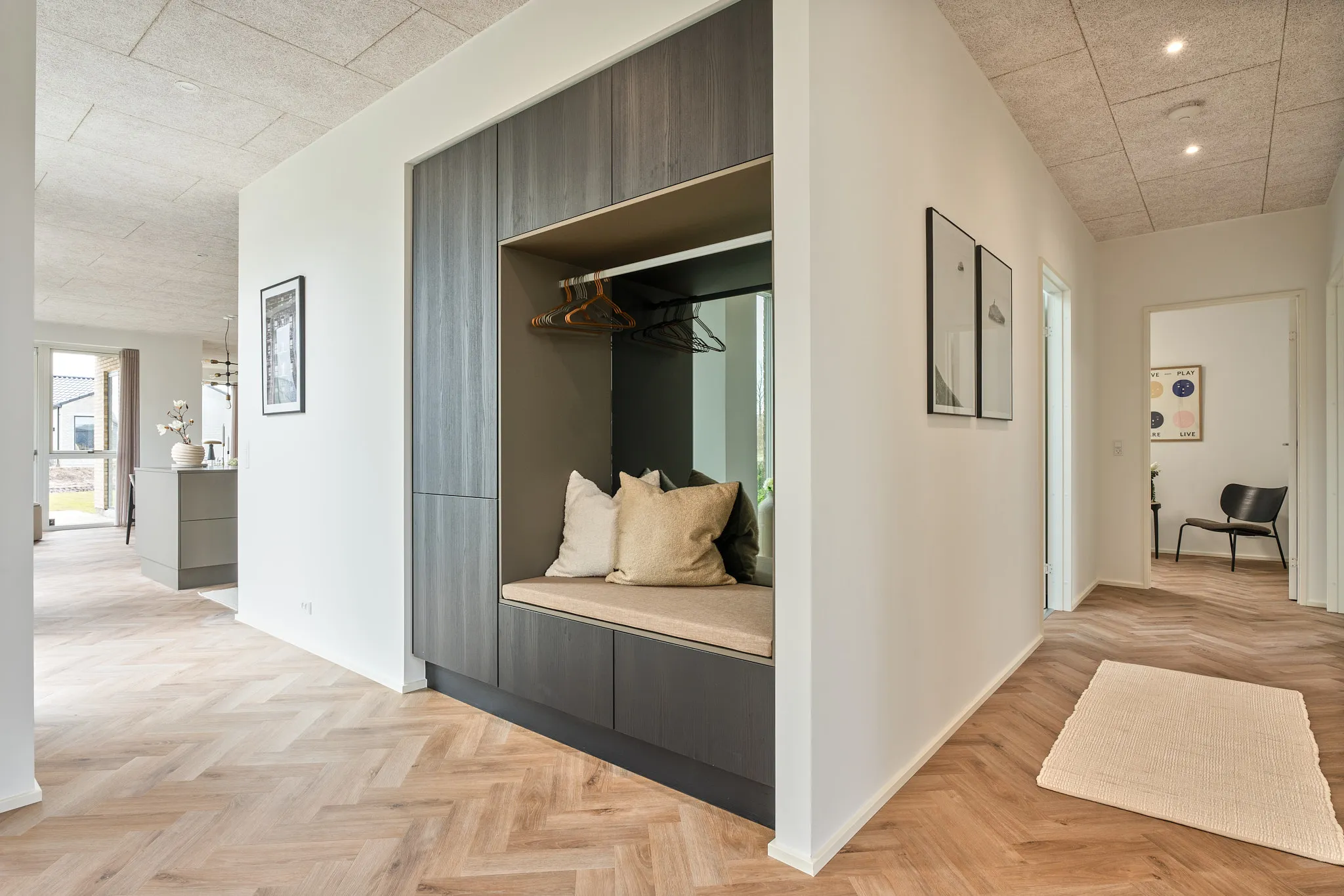 Hus med praktisk og lys entre, sildebensgulve, overdækket terrasse og flotte badeværelser