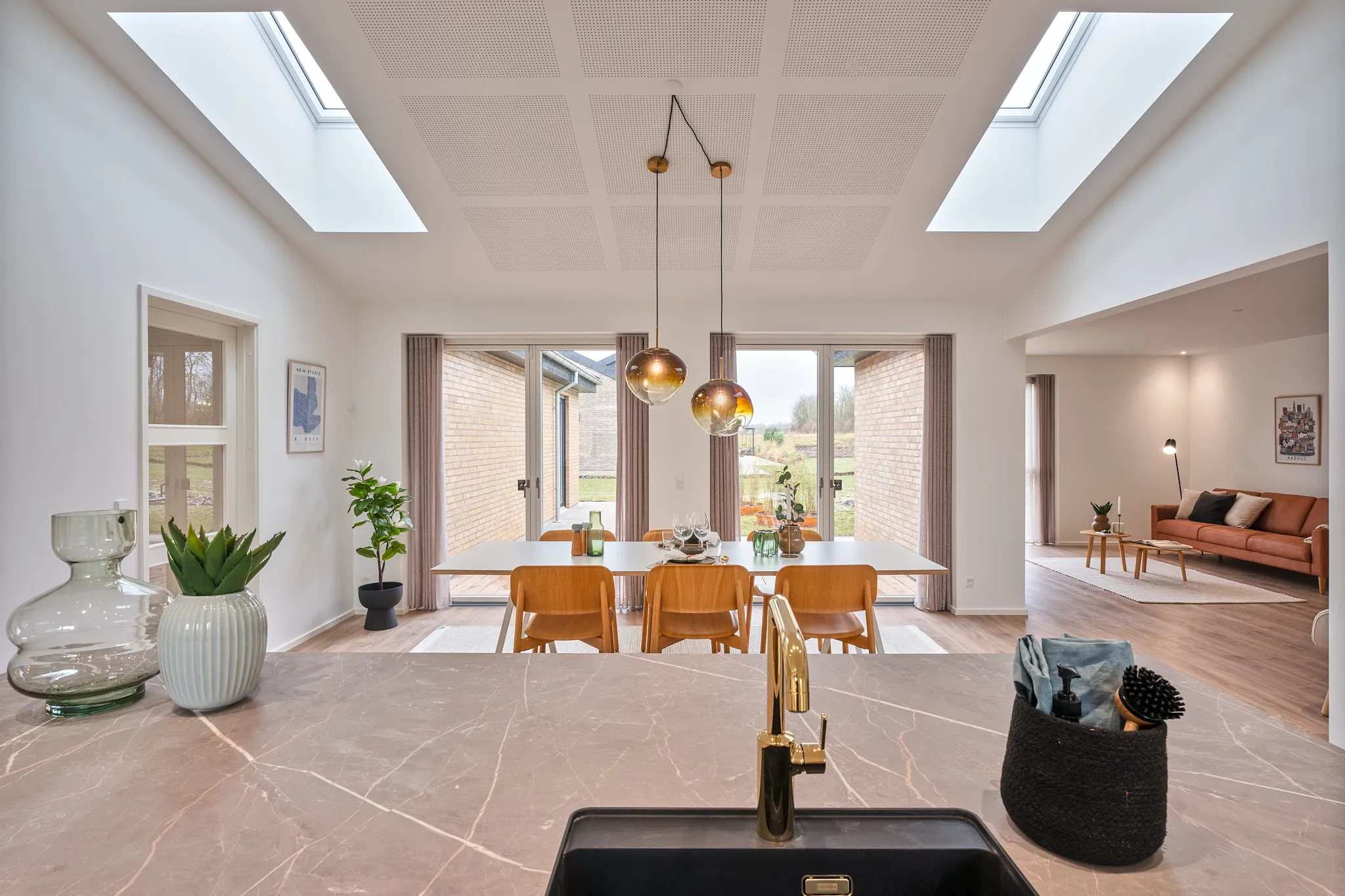 Hus med H-formet design, ovenlysvinduer, luksus badeværelse med badekar, dobbeltbrus og dobbeltvask.