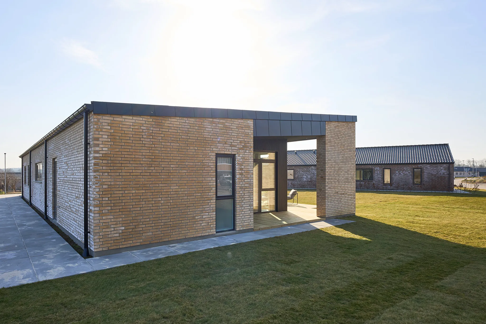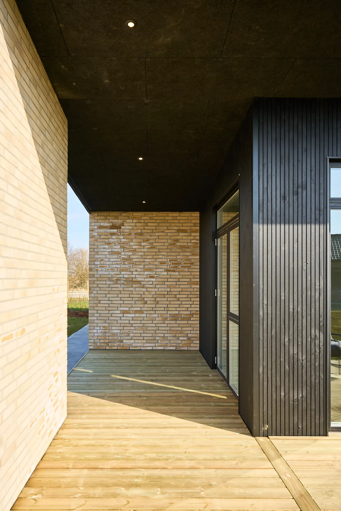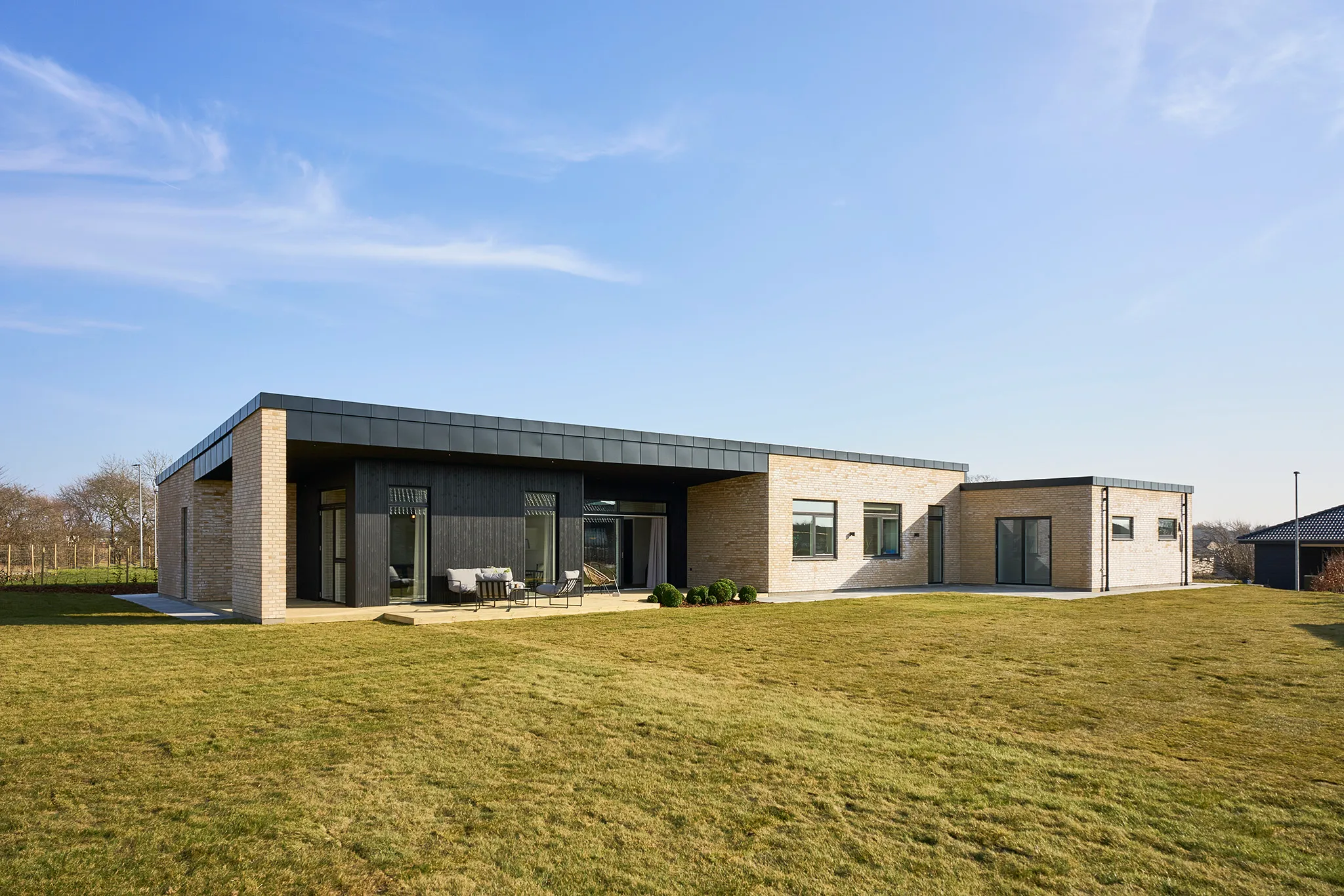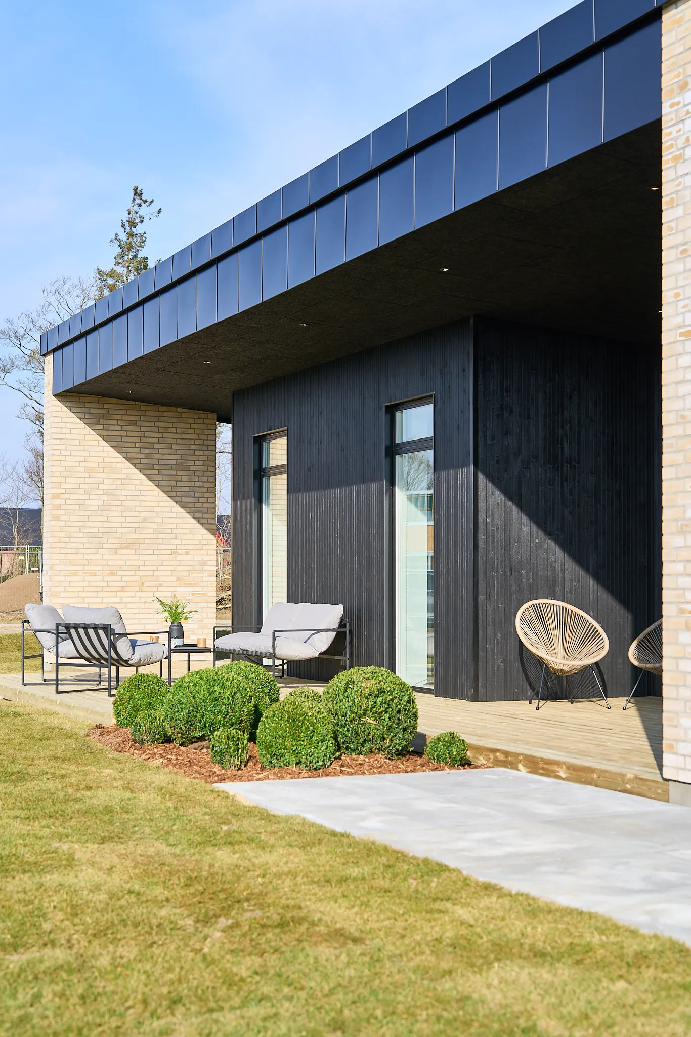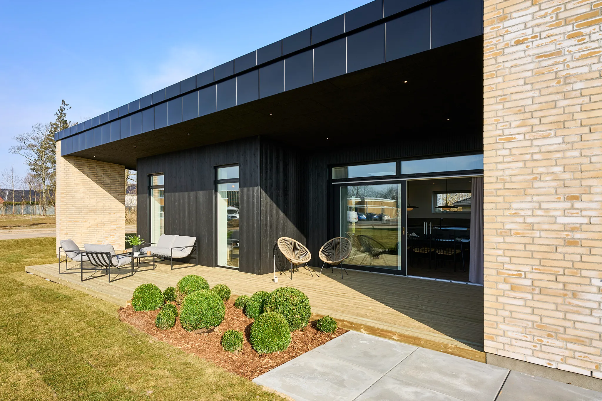 Elegant forskudt hus med træbeklædning og wellness-følelse