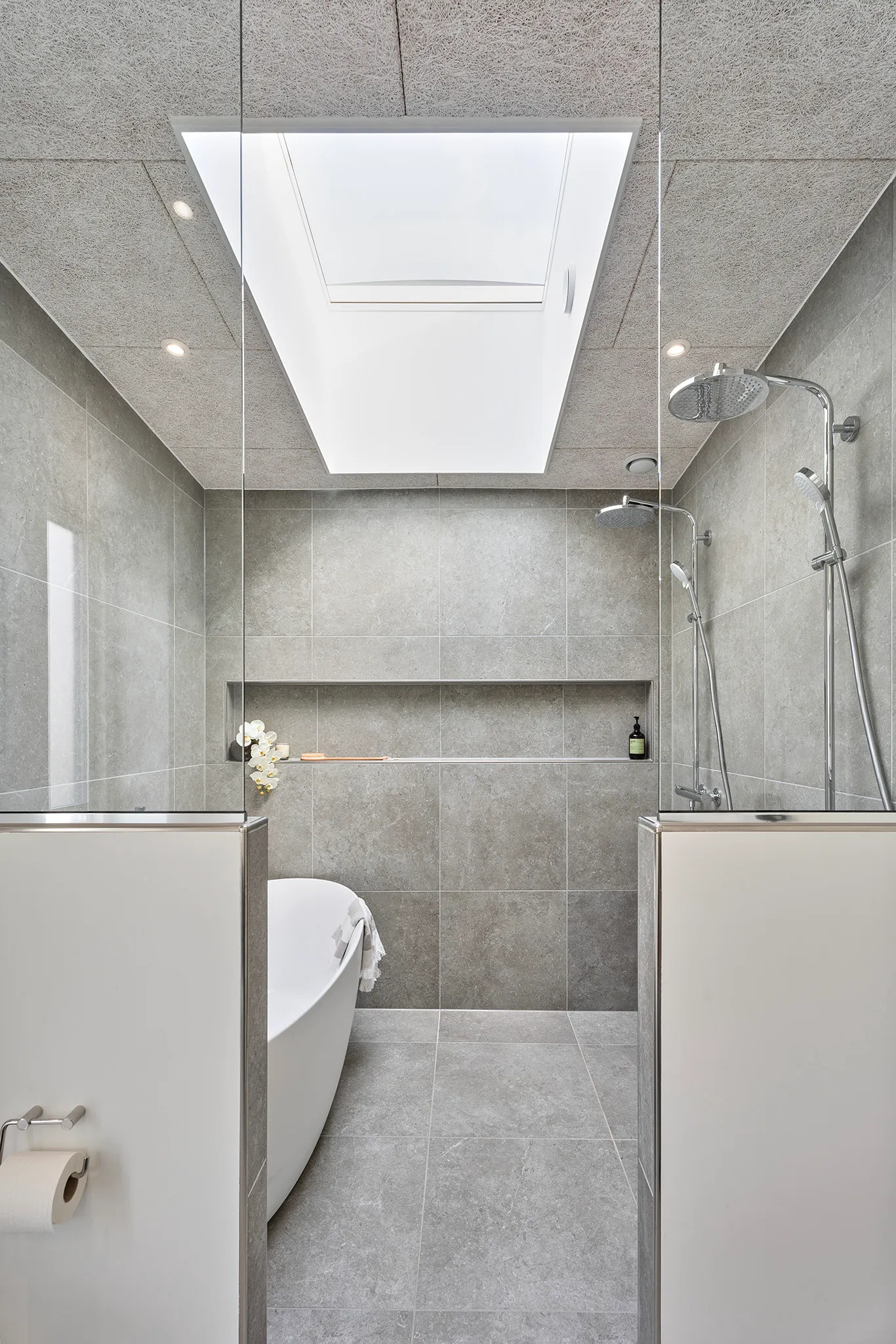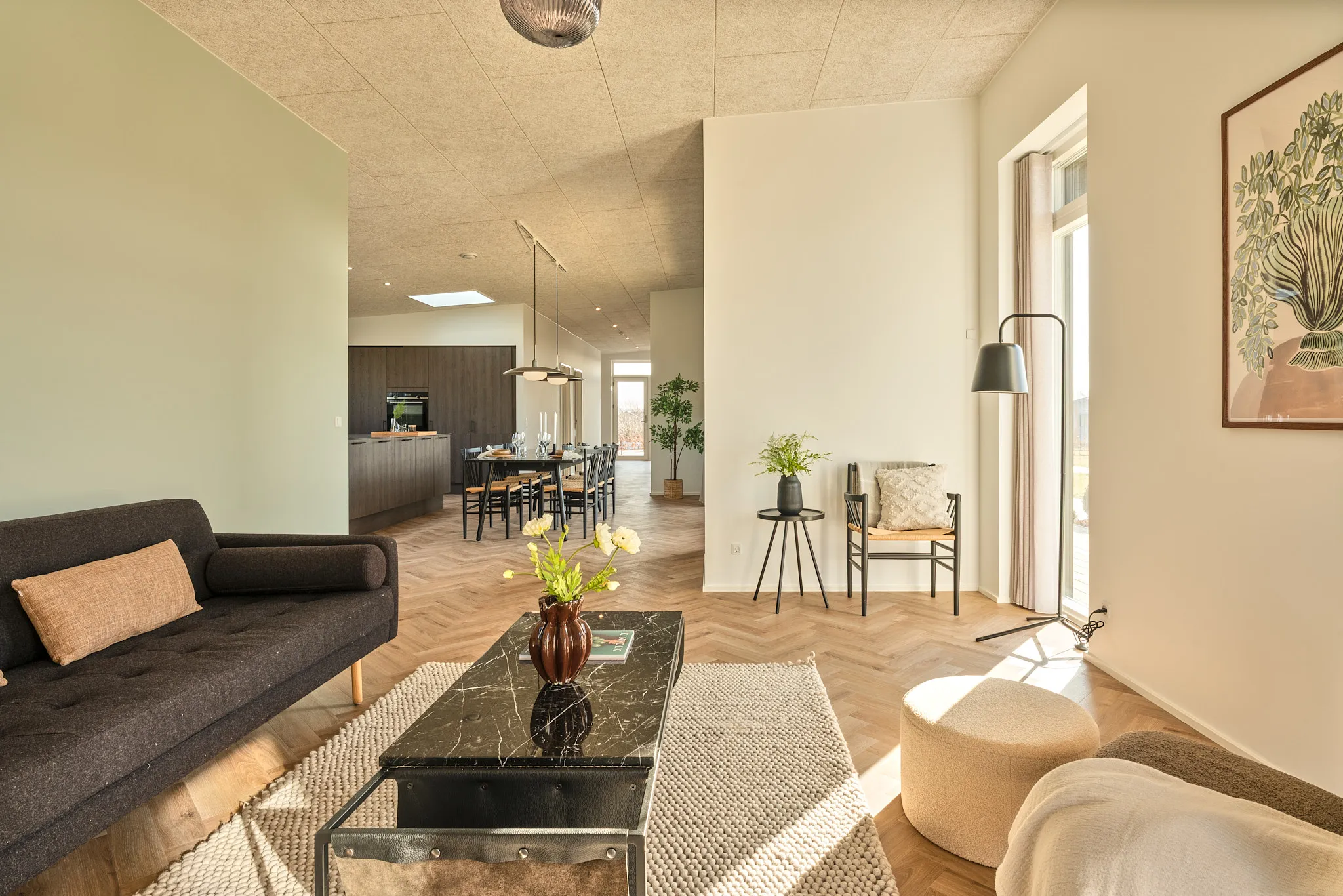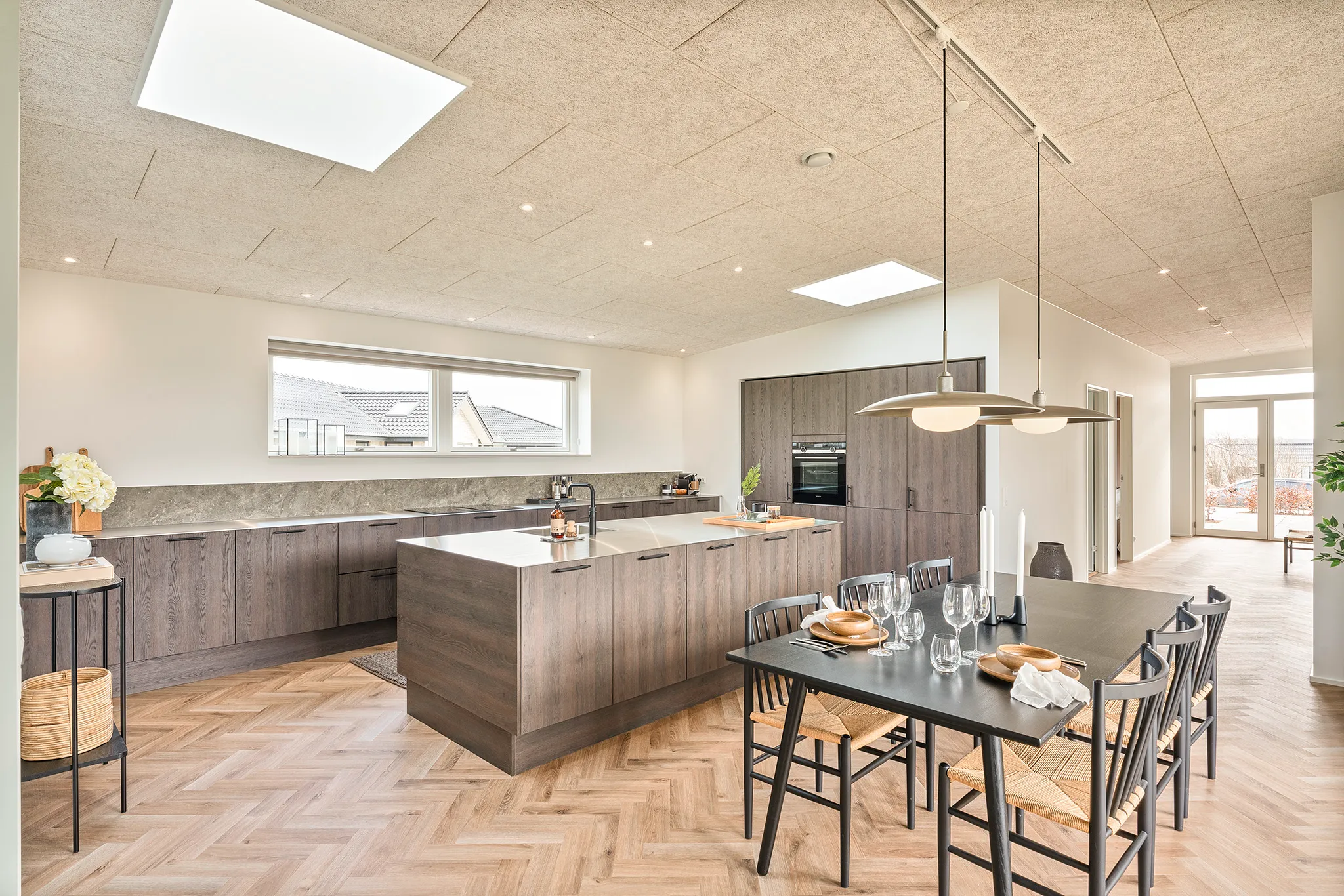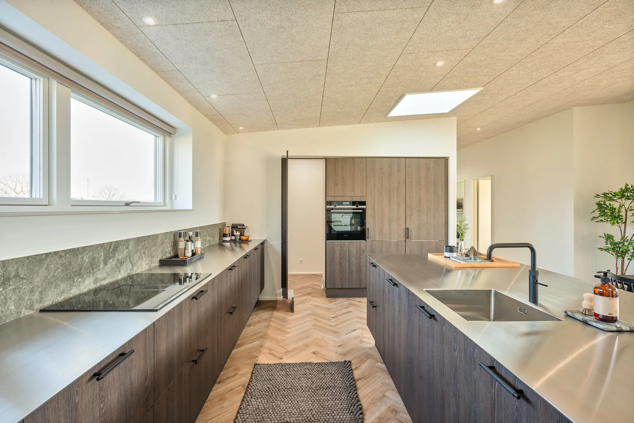 Træbeklædning, stort bryggers, Særskilt entre-garderobe, garage, ovenlys i bad samt wellness afdeling.