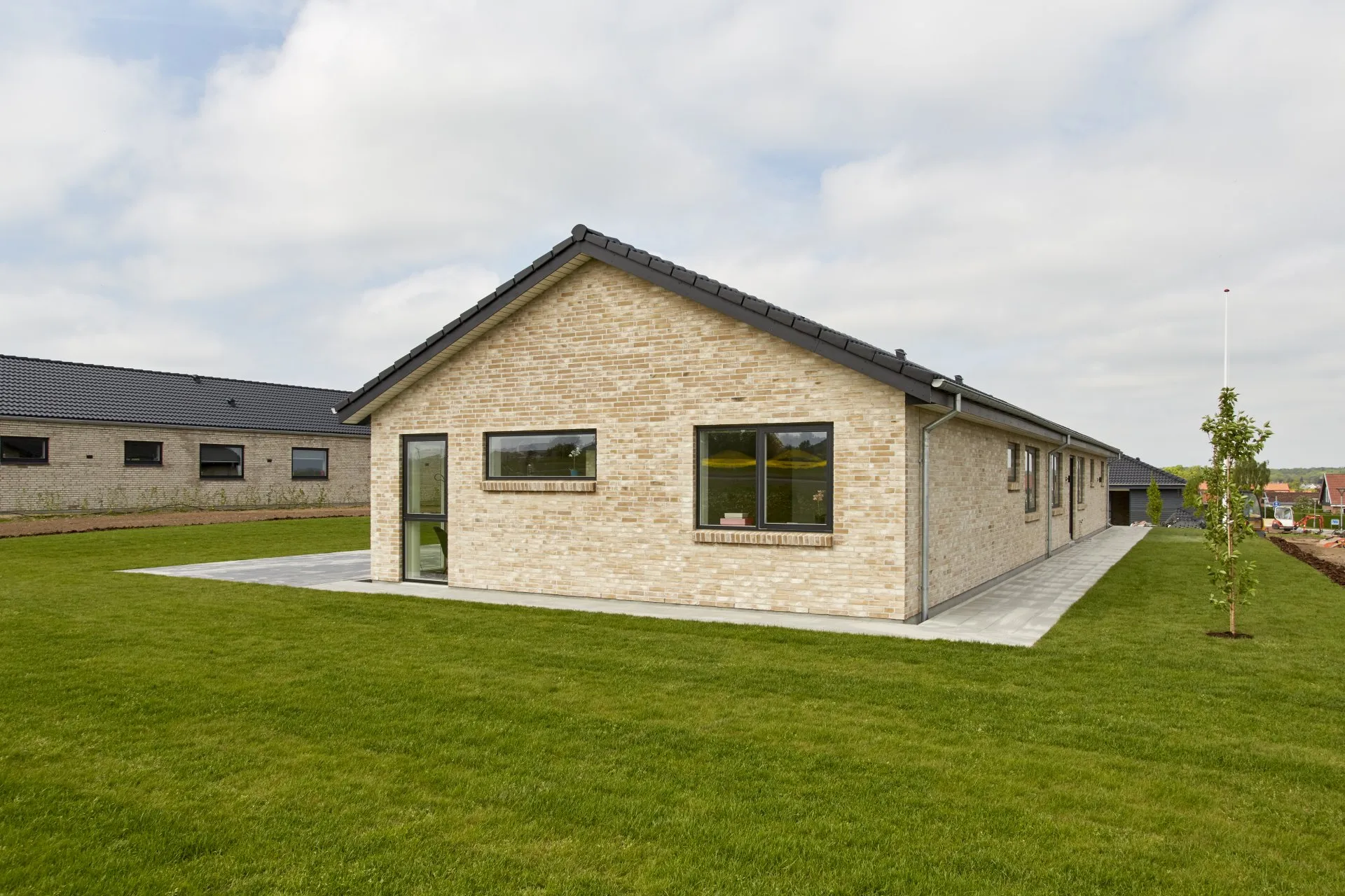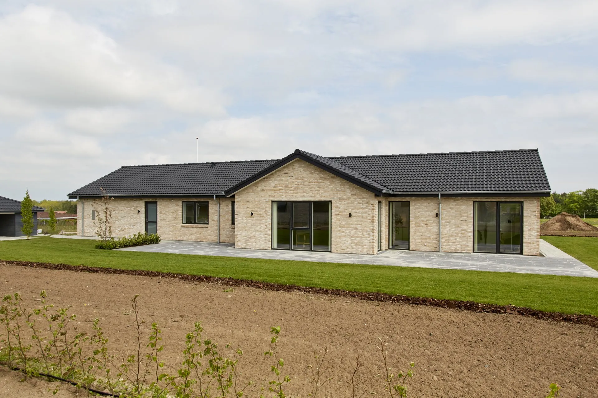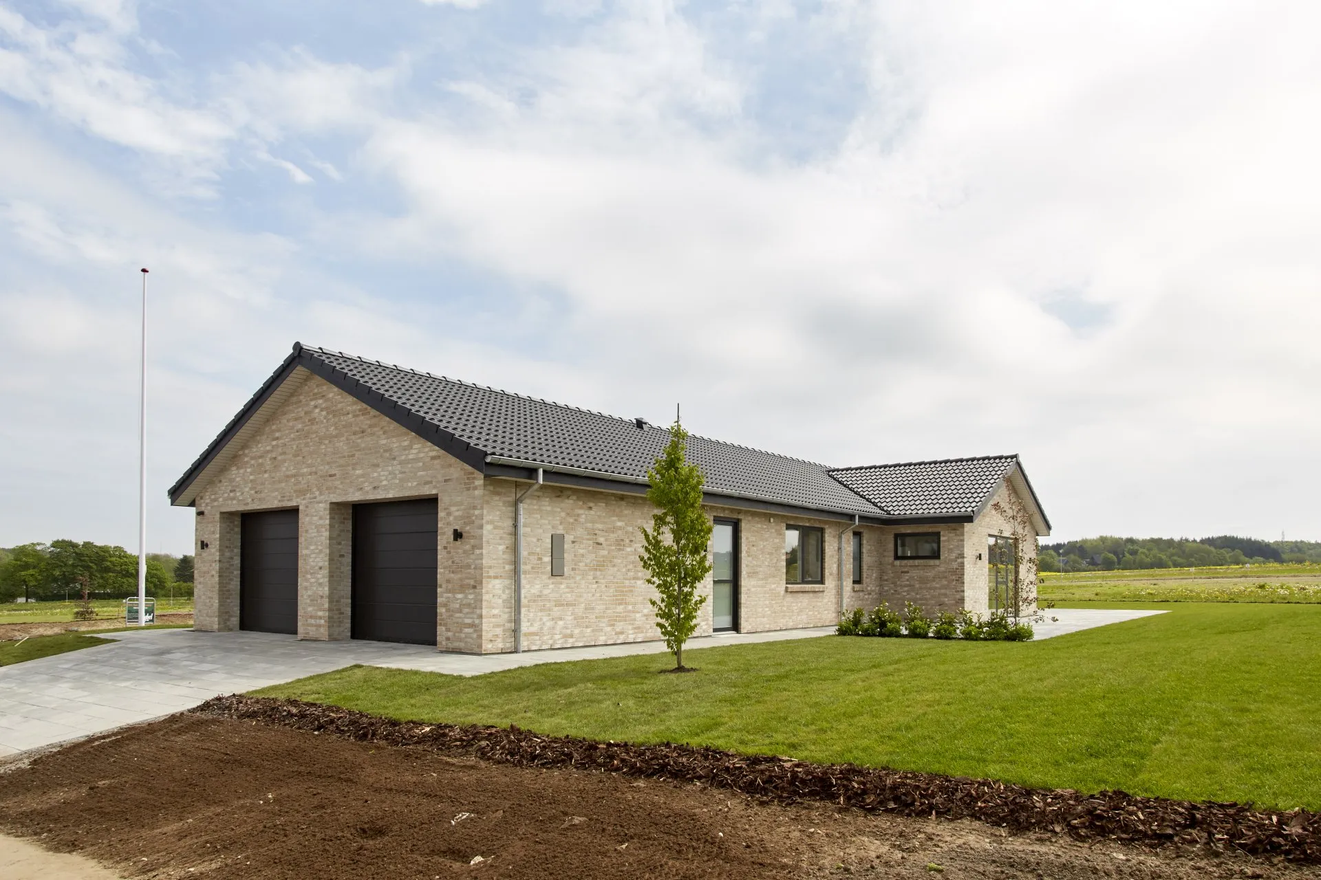 Forskudt vinkelhus med integreret garage og saddeltag med udhæng.