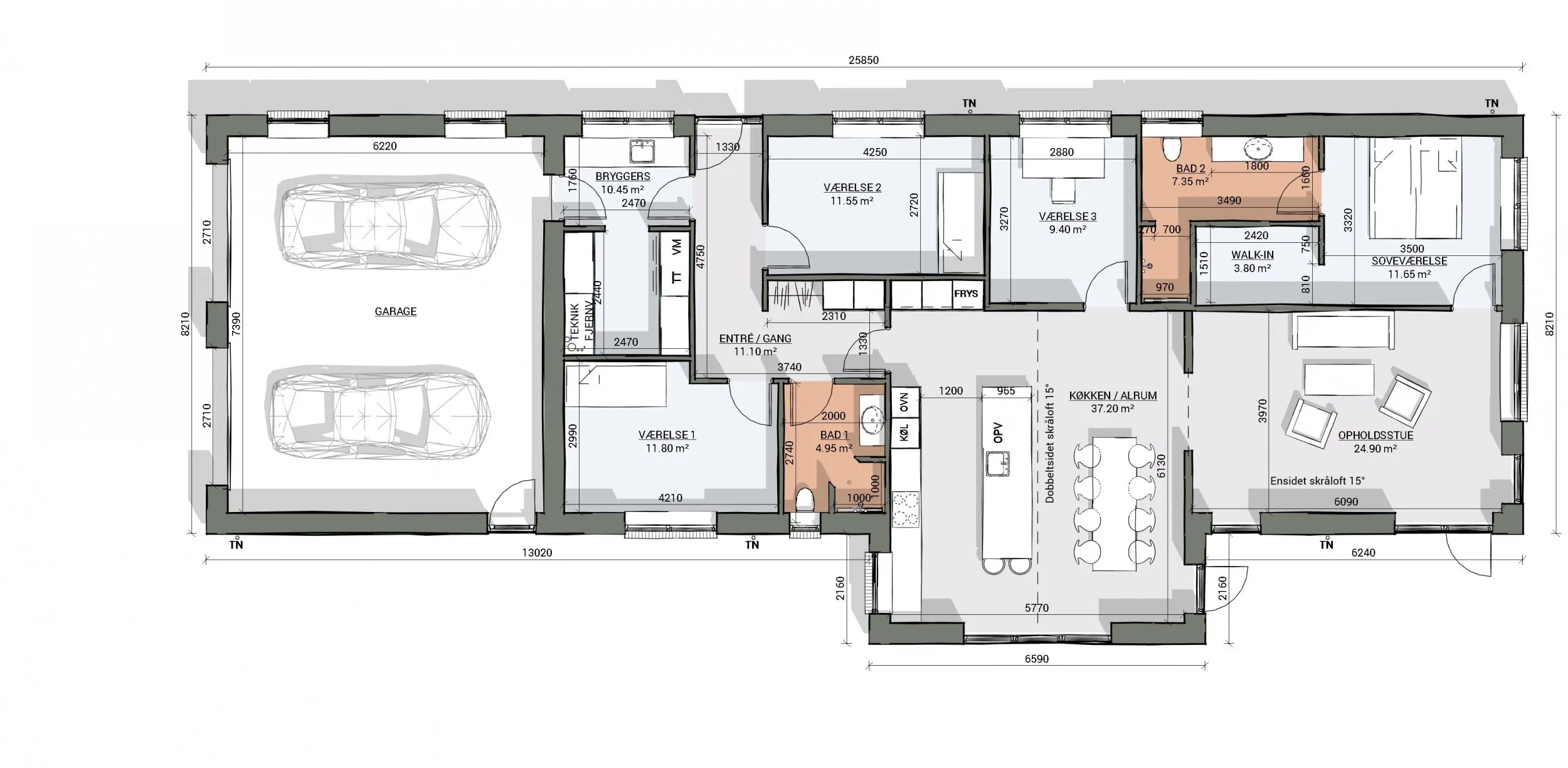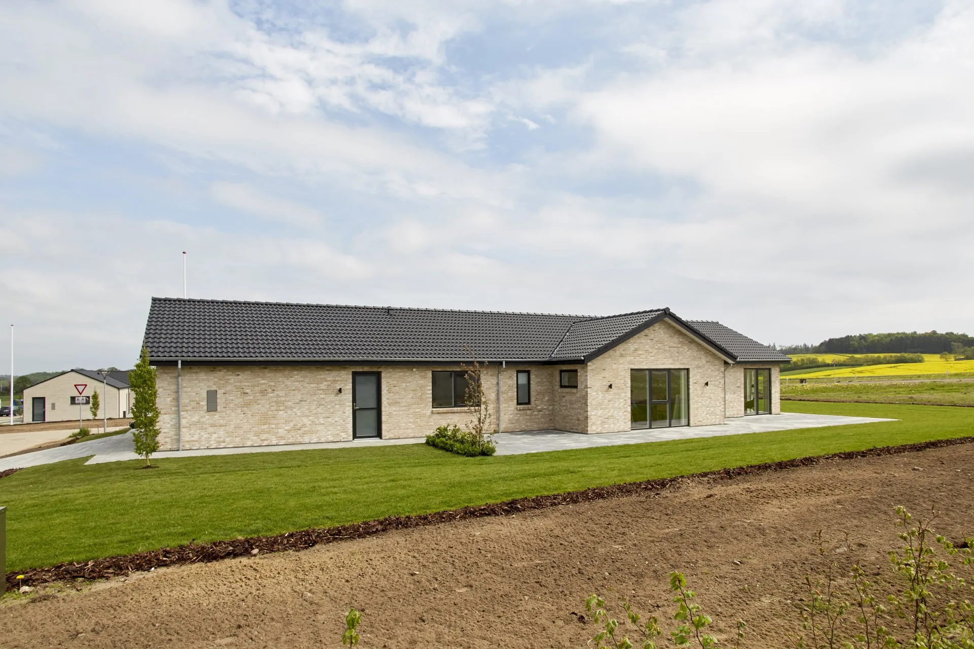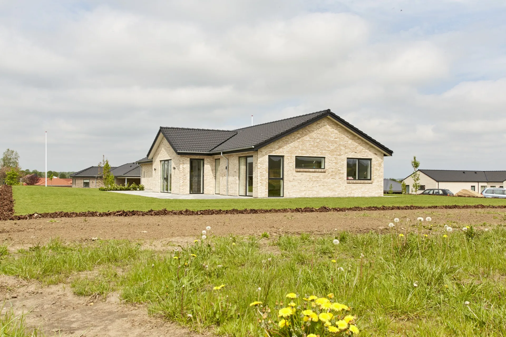 Forskudt vinkelhus med integreret garage og saddeltag med udhæng.