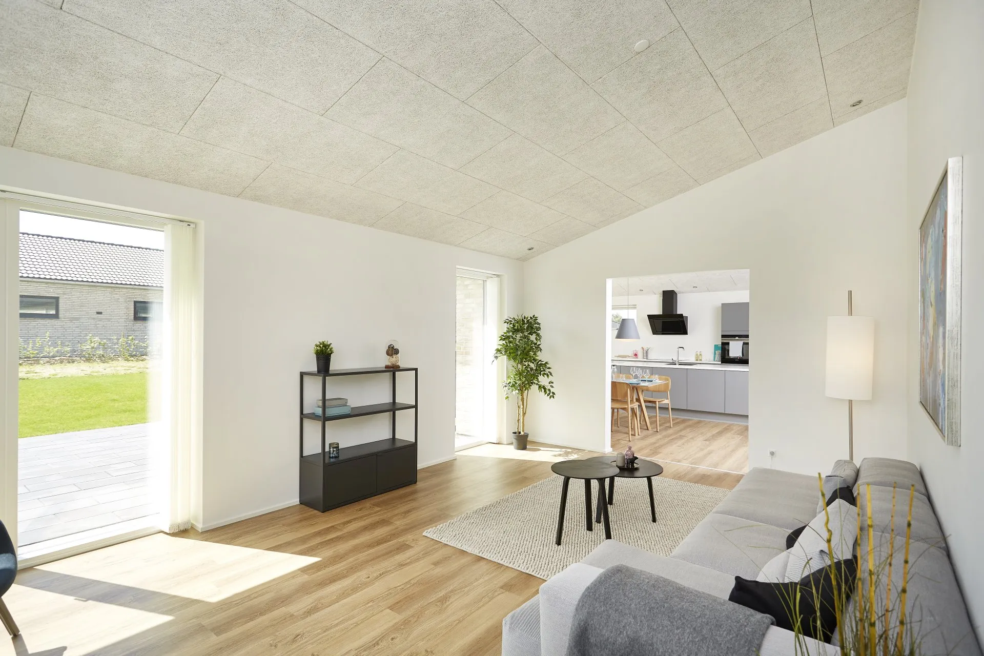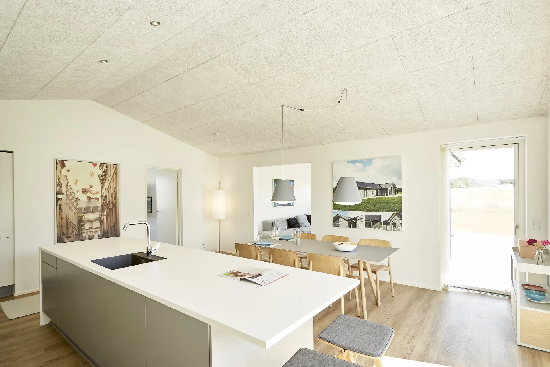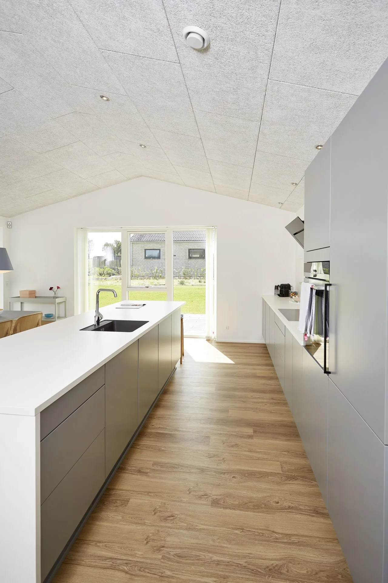 Store glaspartier, højt til loftet i køkken/alrum, Troldtekt lofter og åben indgang til walk-in.