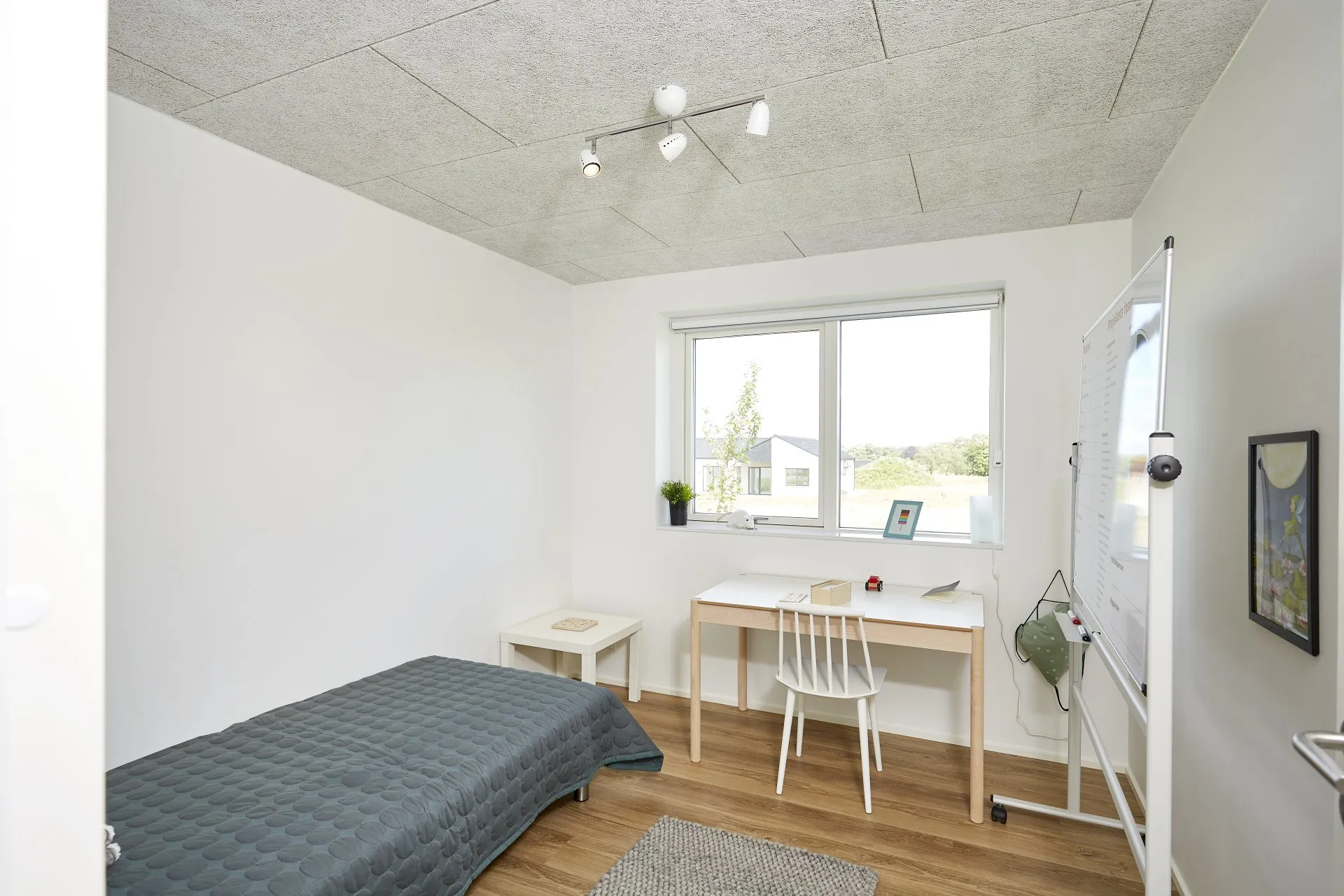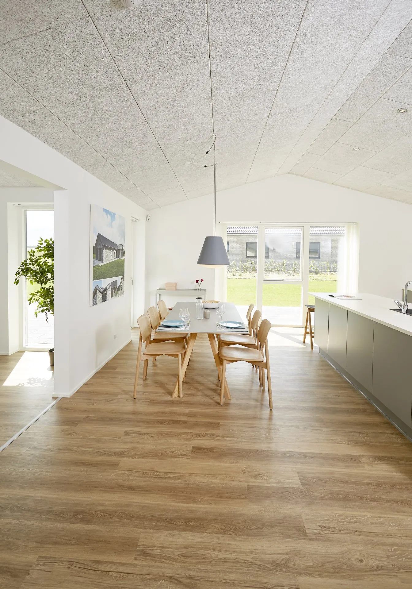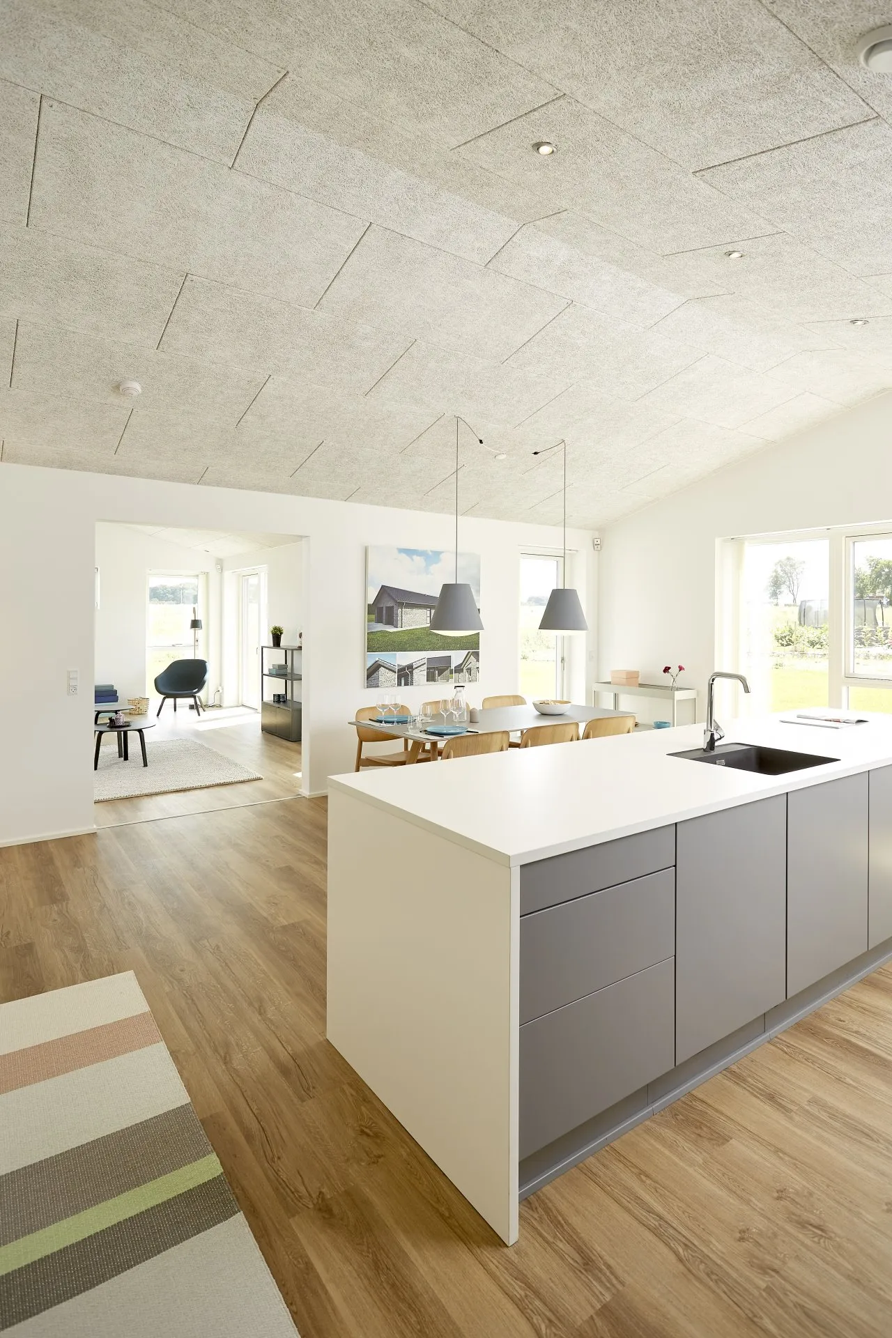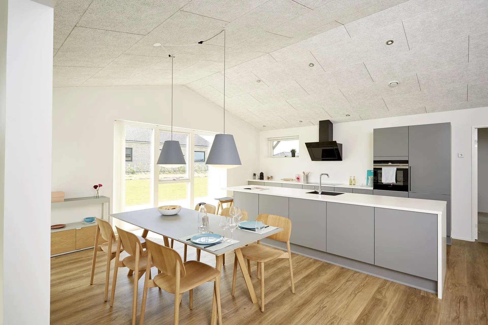 Store glaspartier, højt til loftet i køkken/alrum, Troldtekt lofter og åben indgang til walk-in.