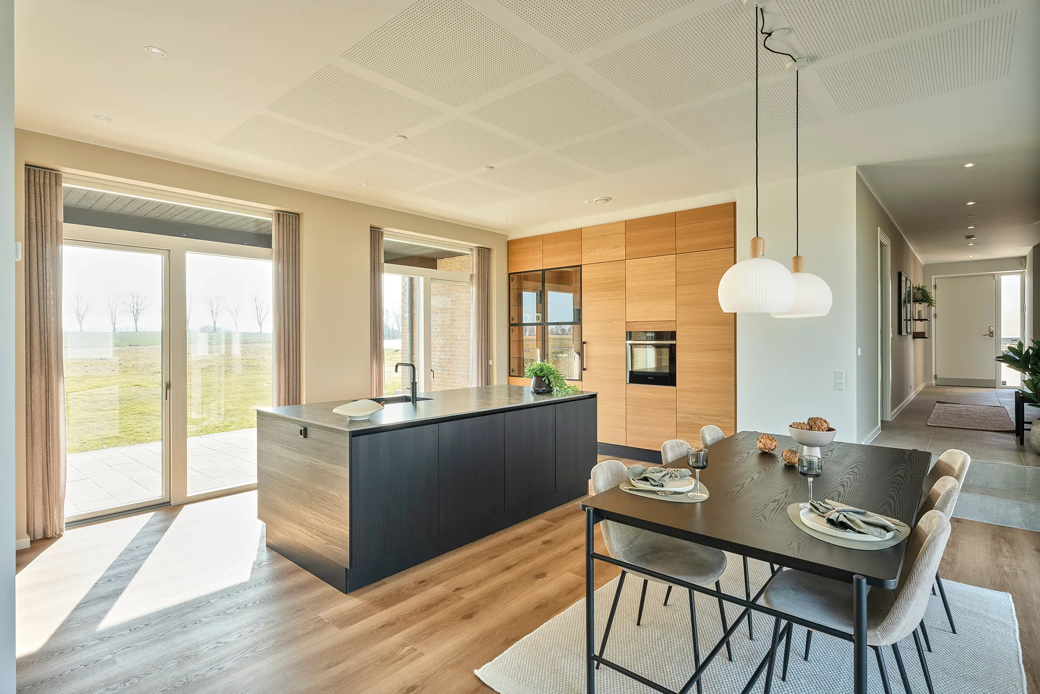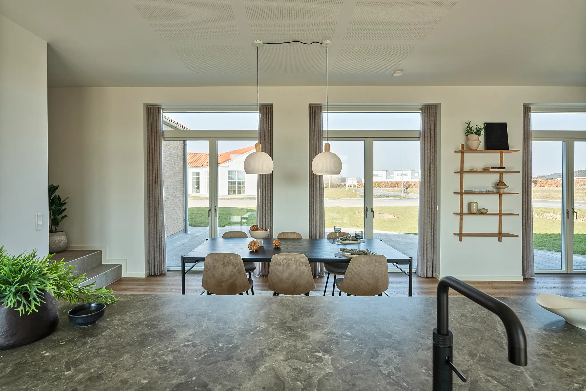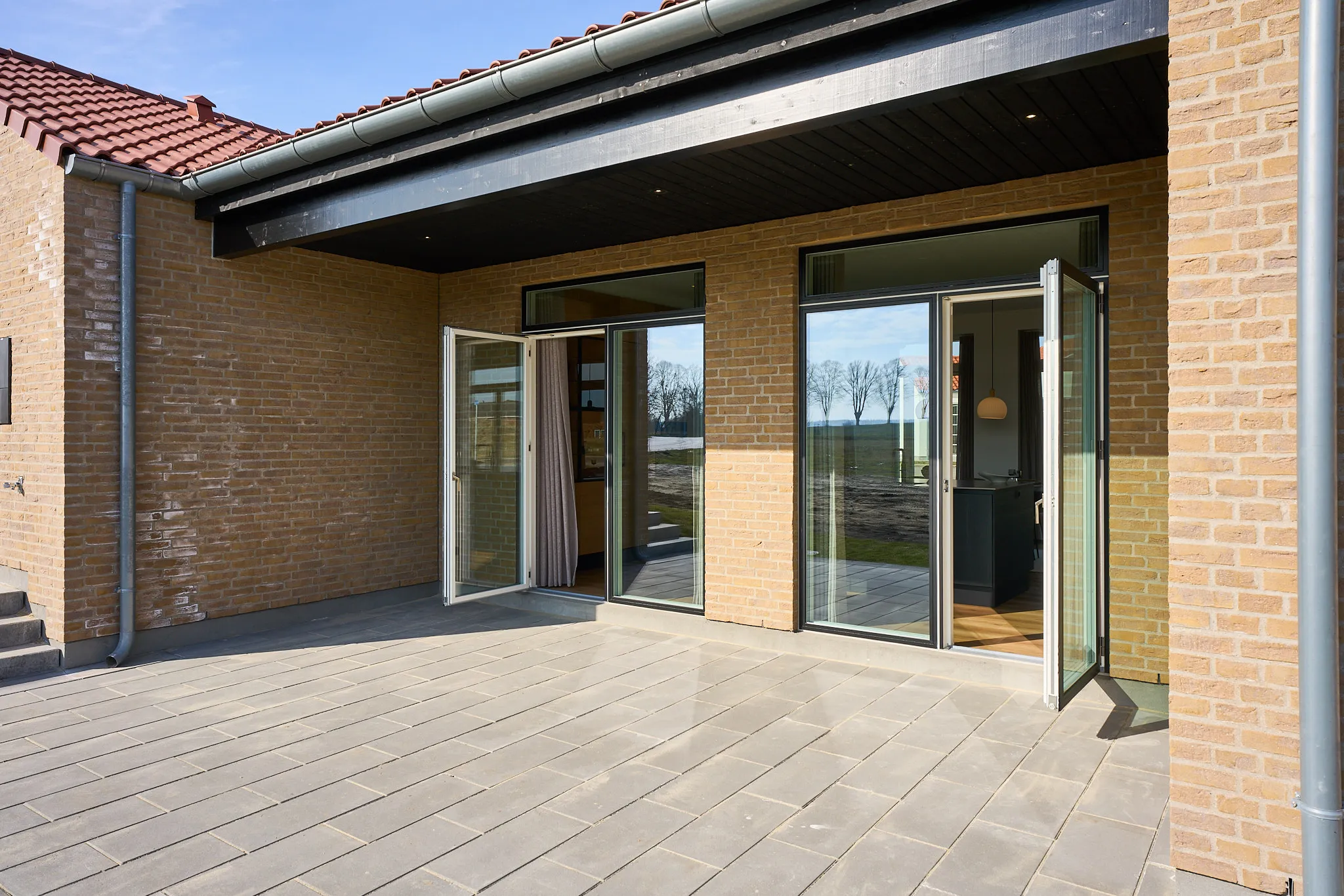 Et hjem med nedtrapning, indbygget reol, dobbelt garage, åbent kontor, tegltag og massere af dobbeltdøre på begge sider.