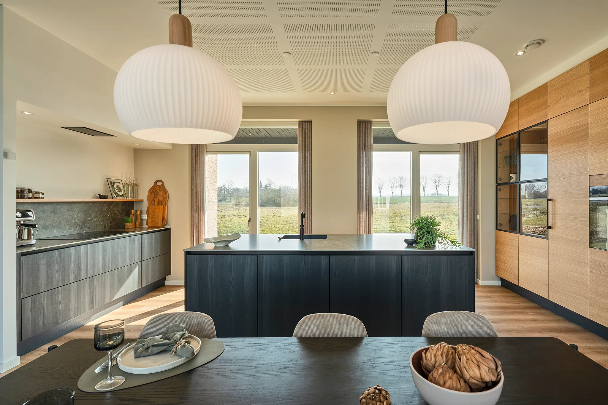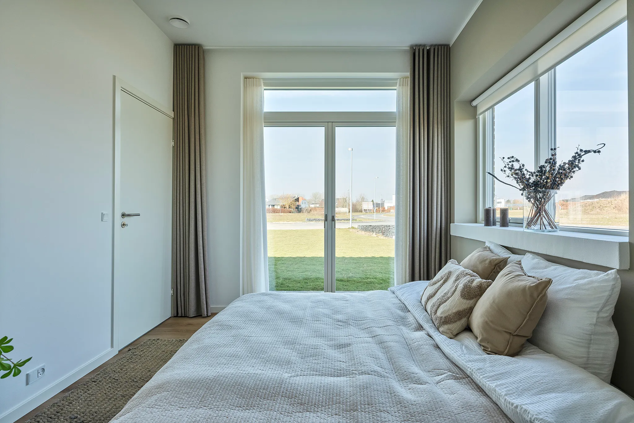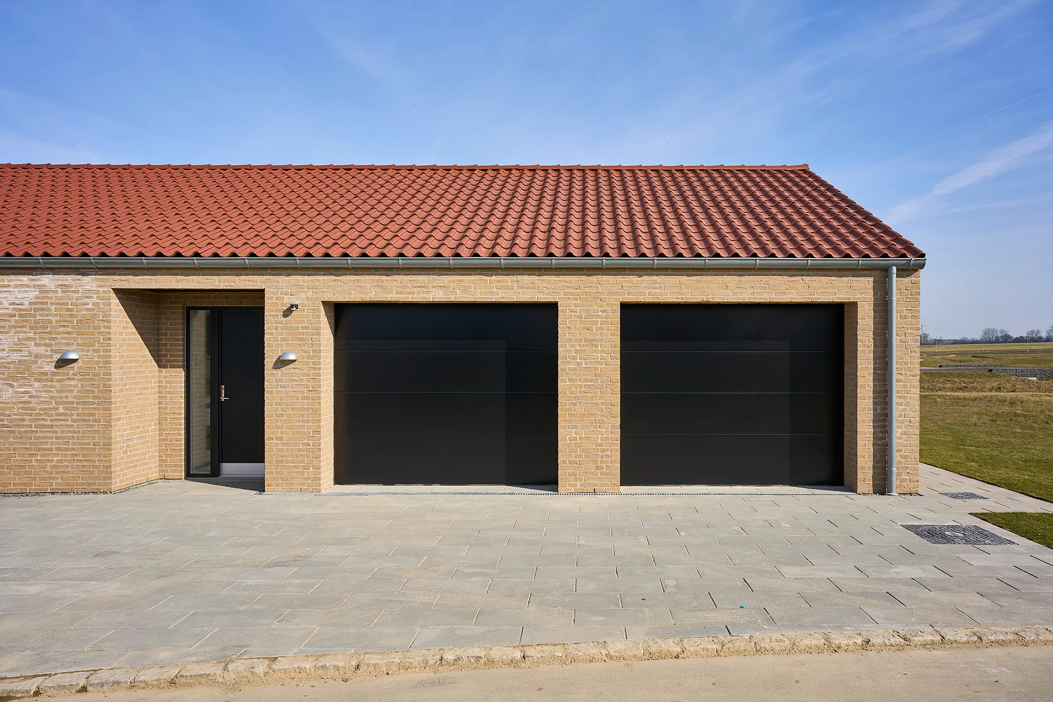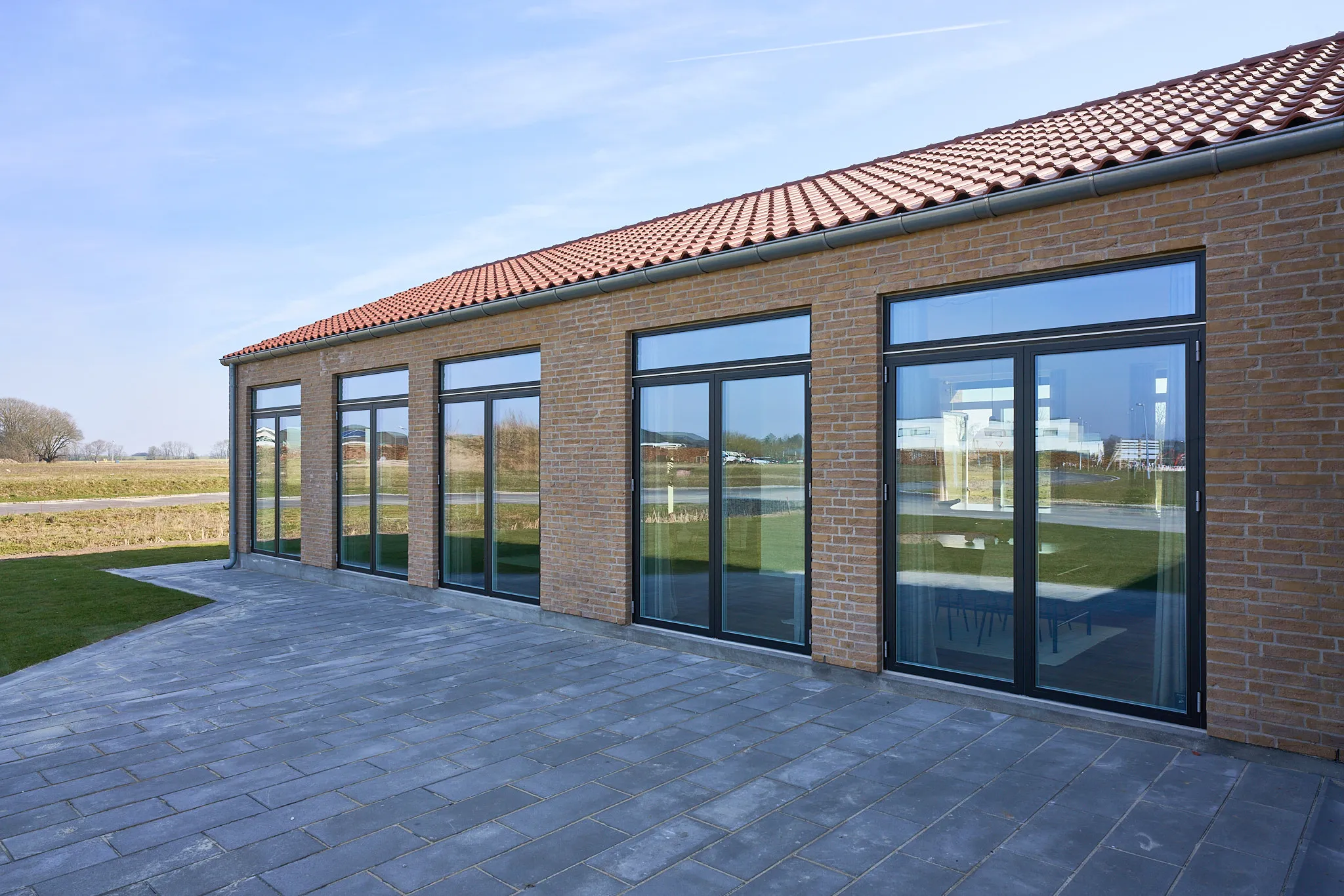 Et hjem med nedtrapning, indbygget reol, dobbelt garage, åbent kontor, tegltag og massere af dobbeltdøre på begge sider.