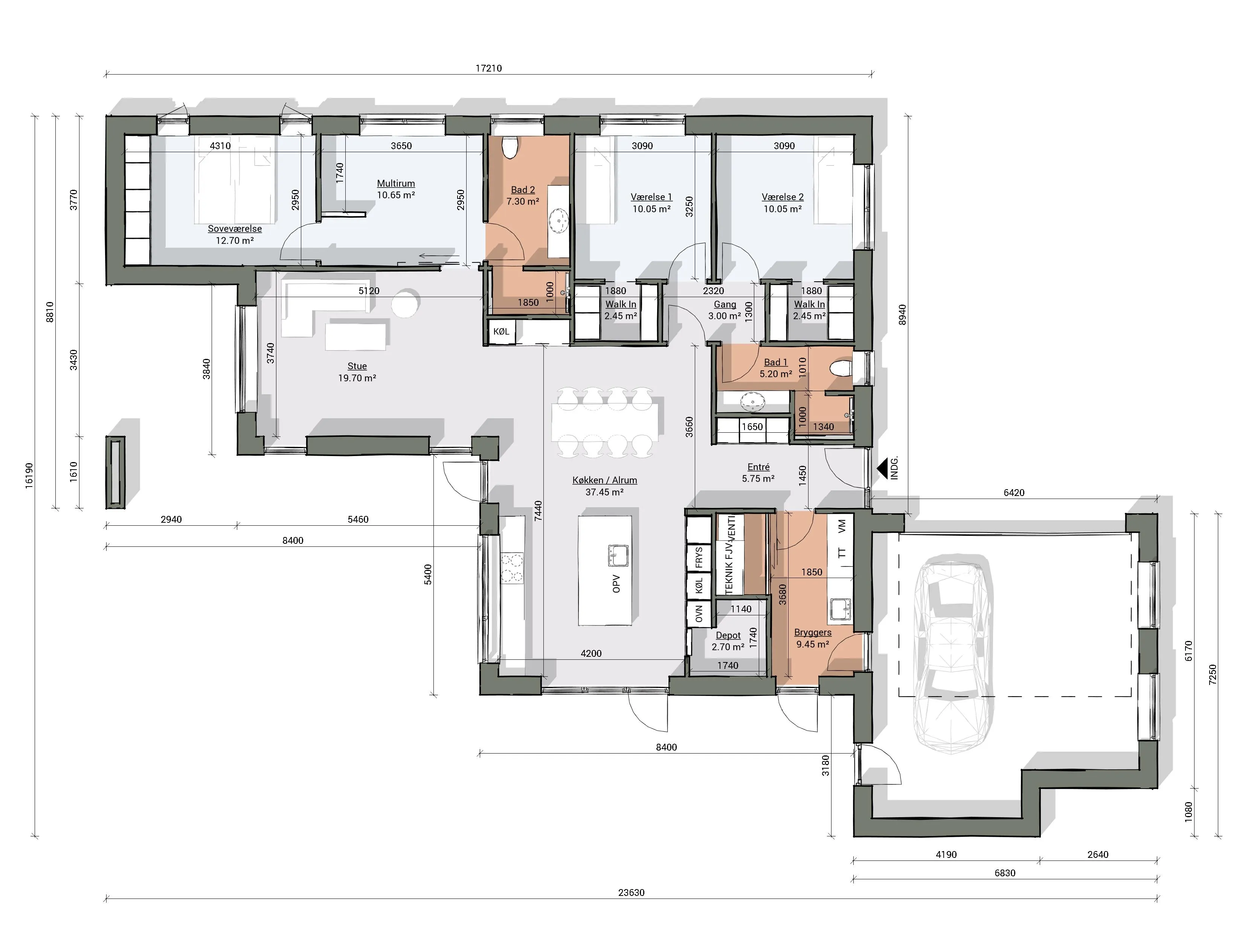 Forskudt plantegning med garage, bordemhætte, vin-niche, åbent kontor, øget loftshøjde & børne-walk-in.