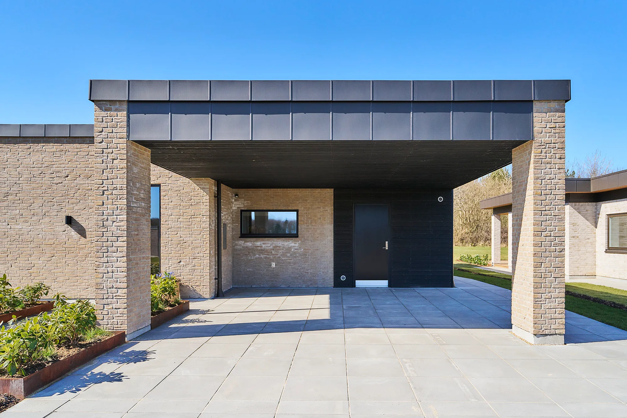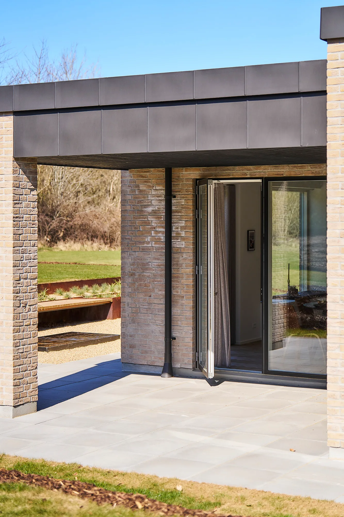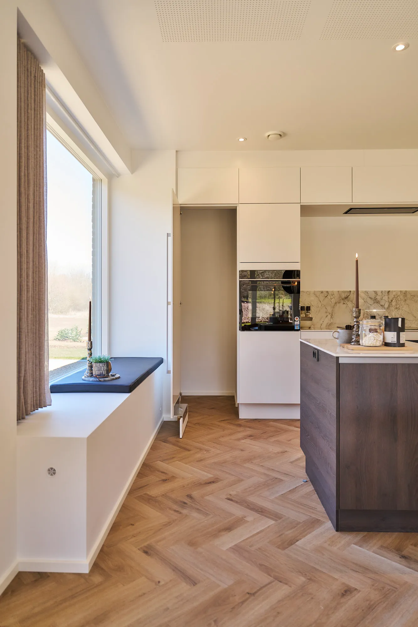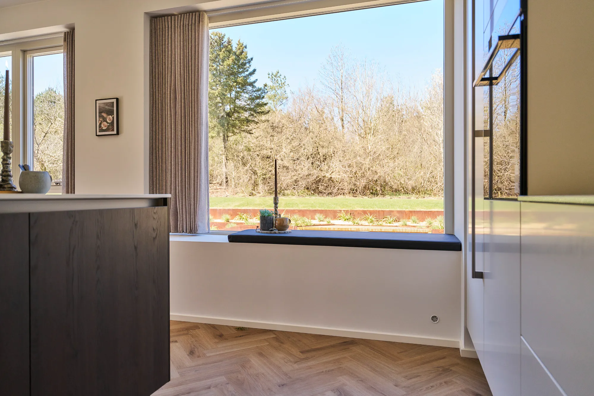 Veludnyttet hus med Øget loftshøjde, Sildebensgulv, Overdækket terrasse & siddebænk i køkkenet.