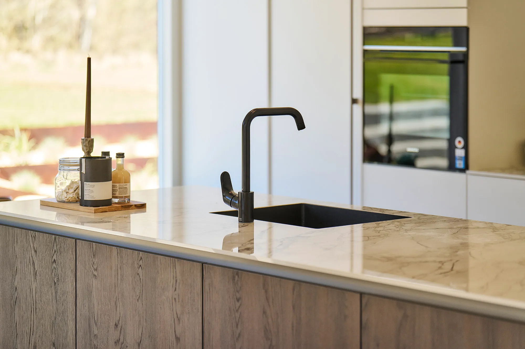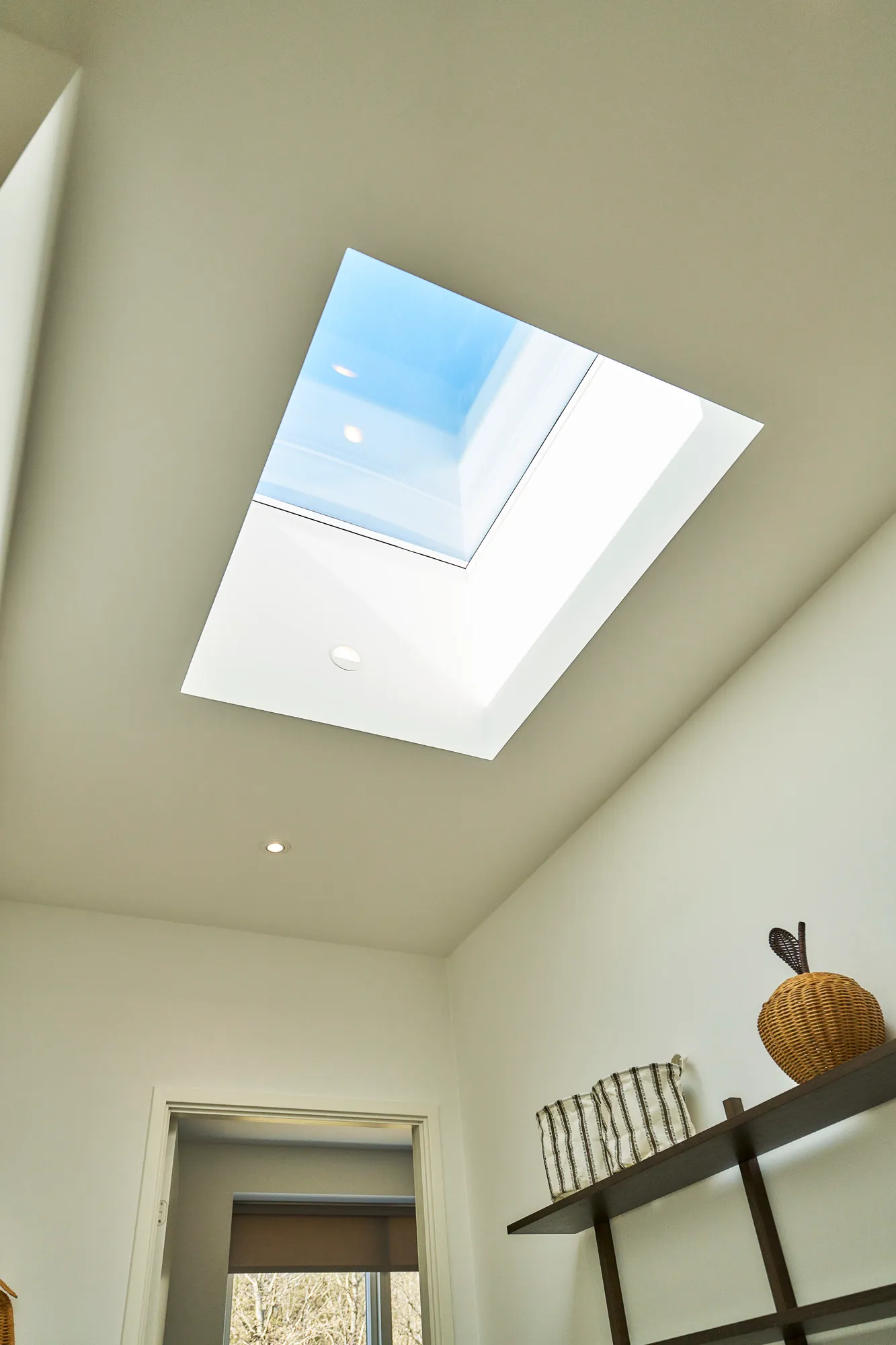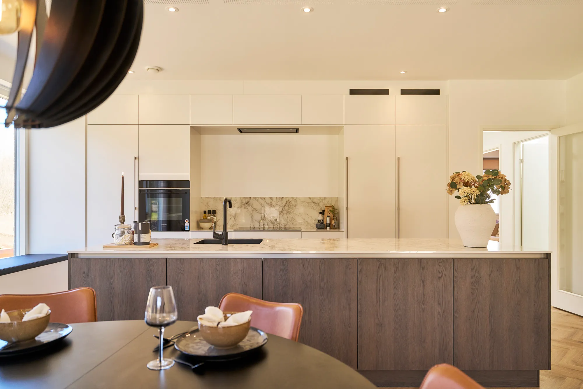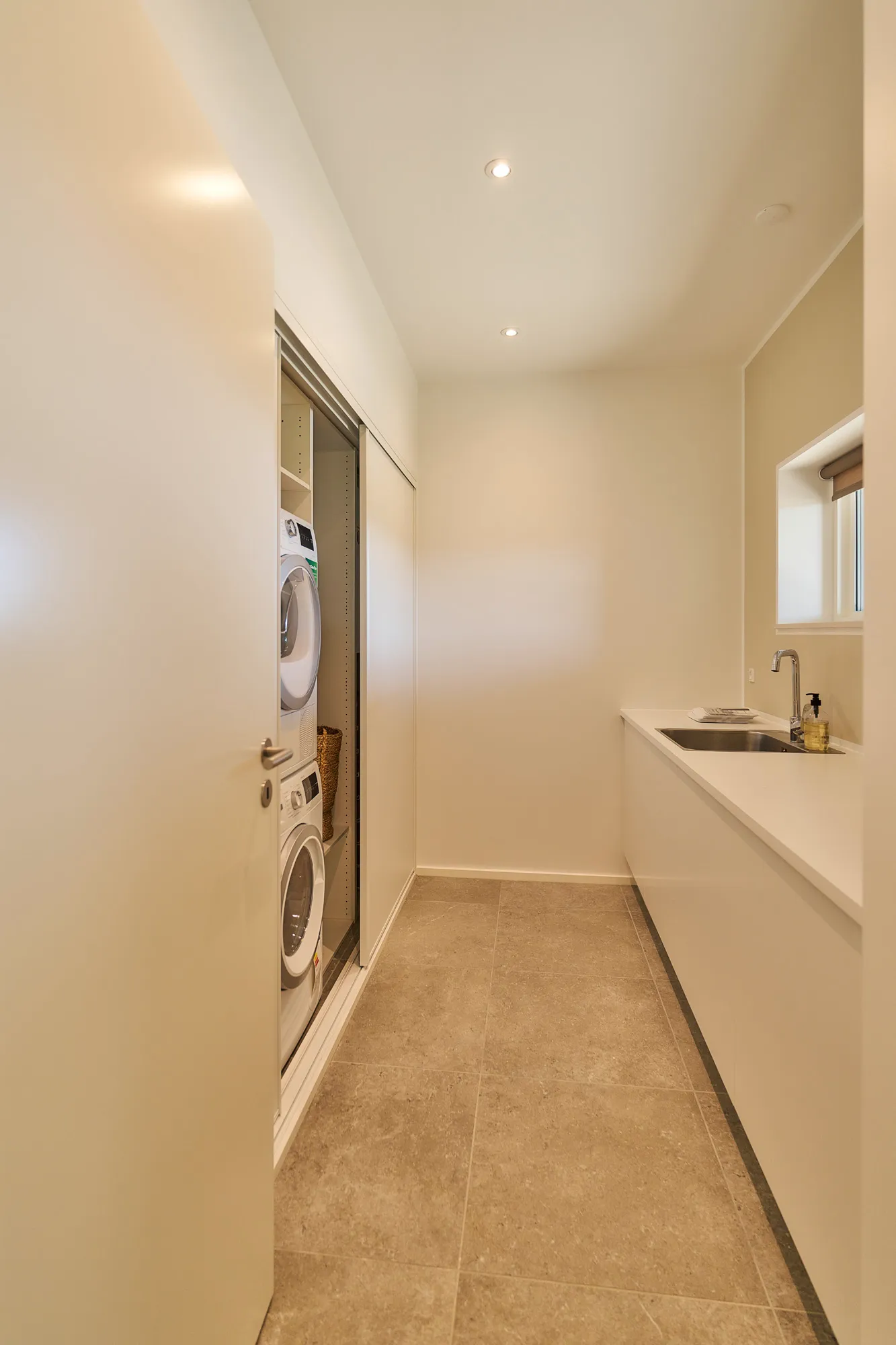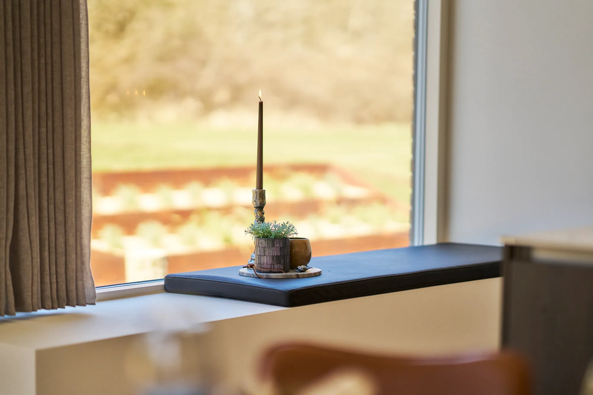 Veludnyttet hus med Øget loftshøjde, Sildebensgulv, Overdækket terrasse & siddebænk i køkkenet.