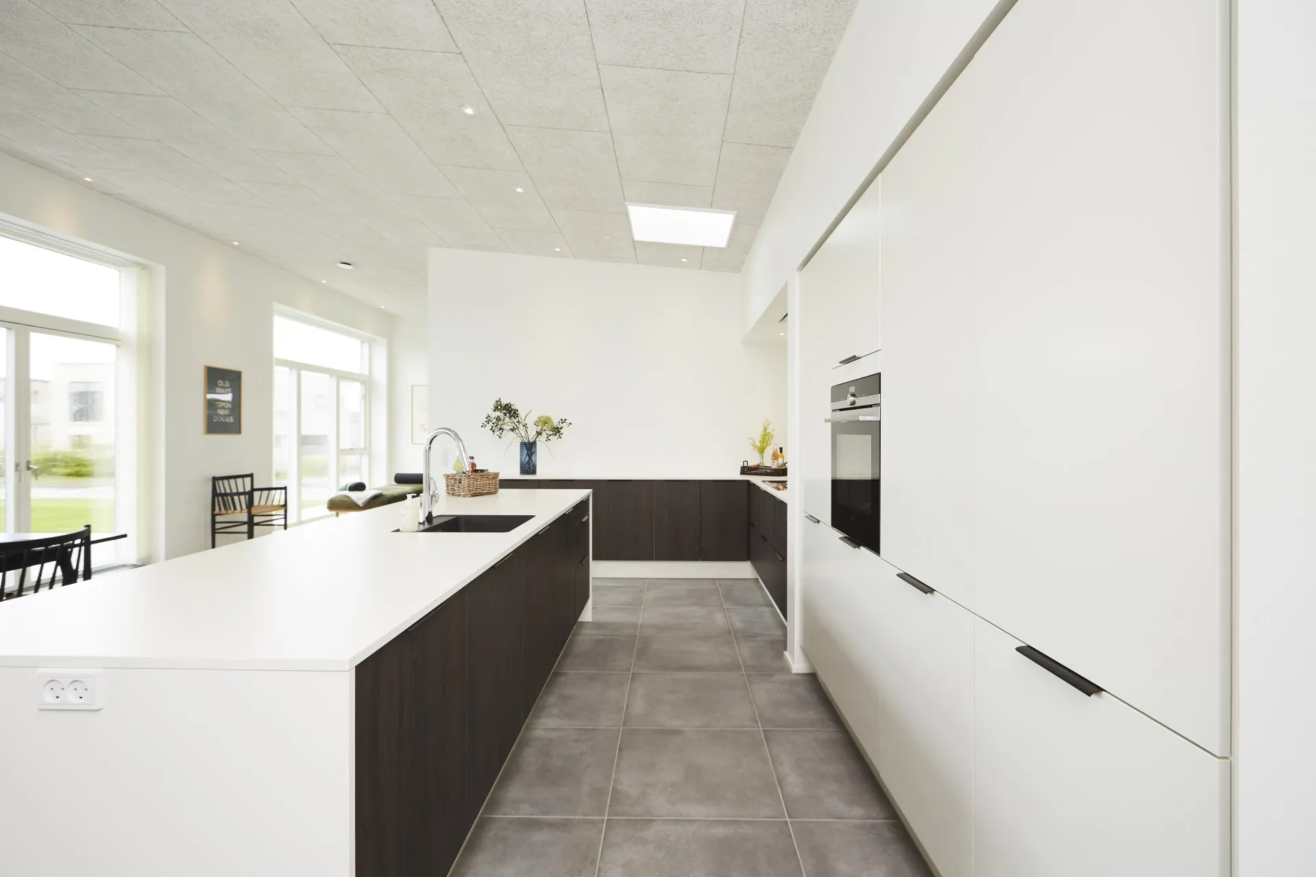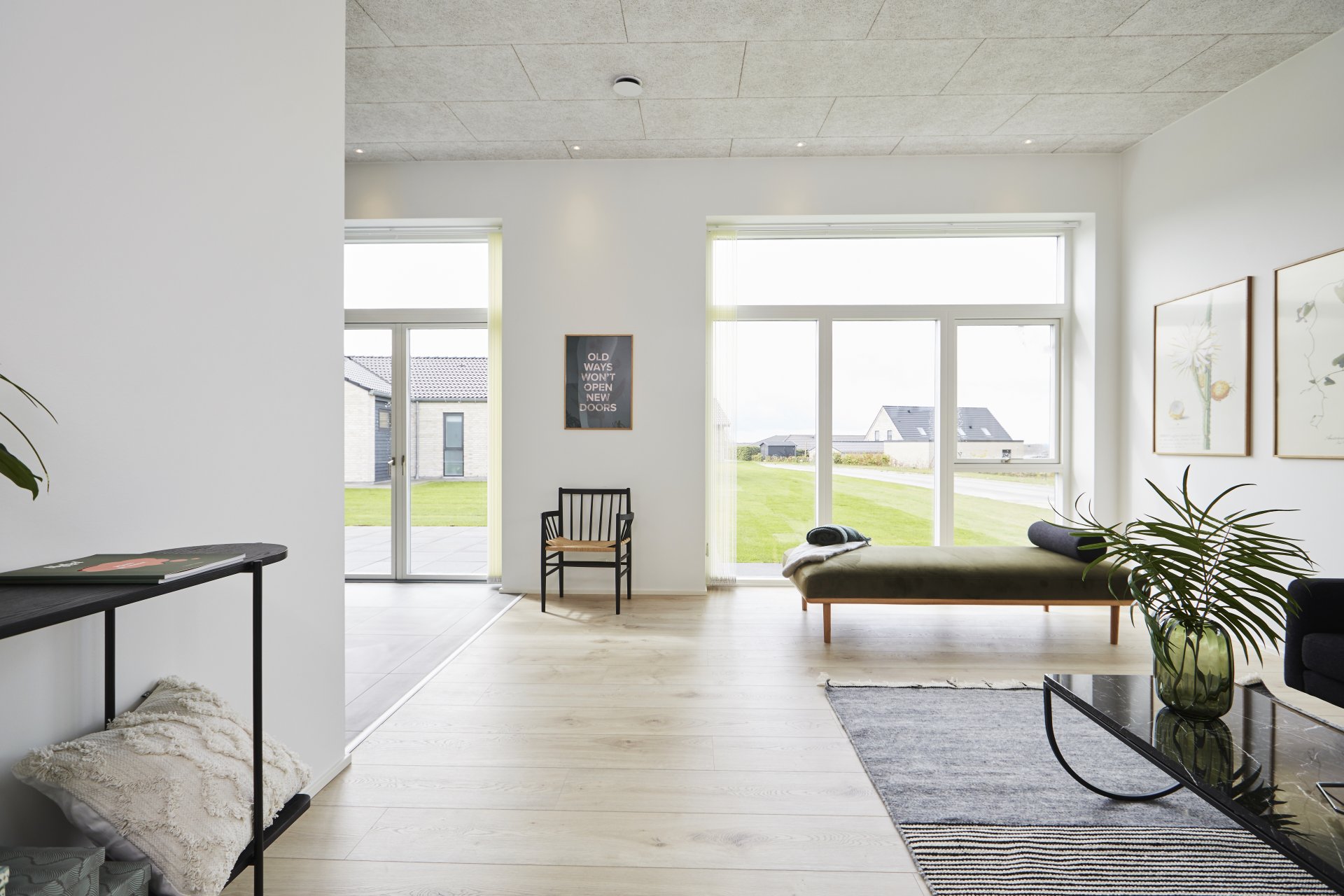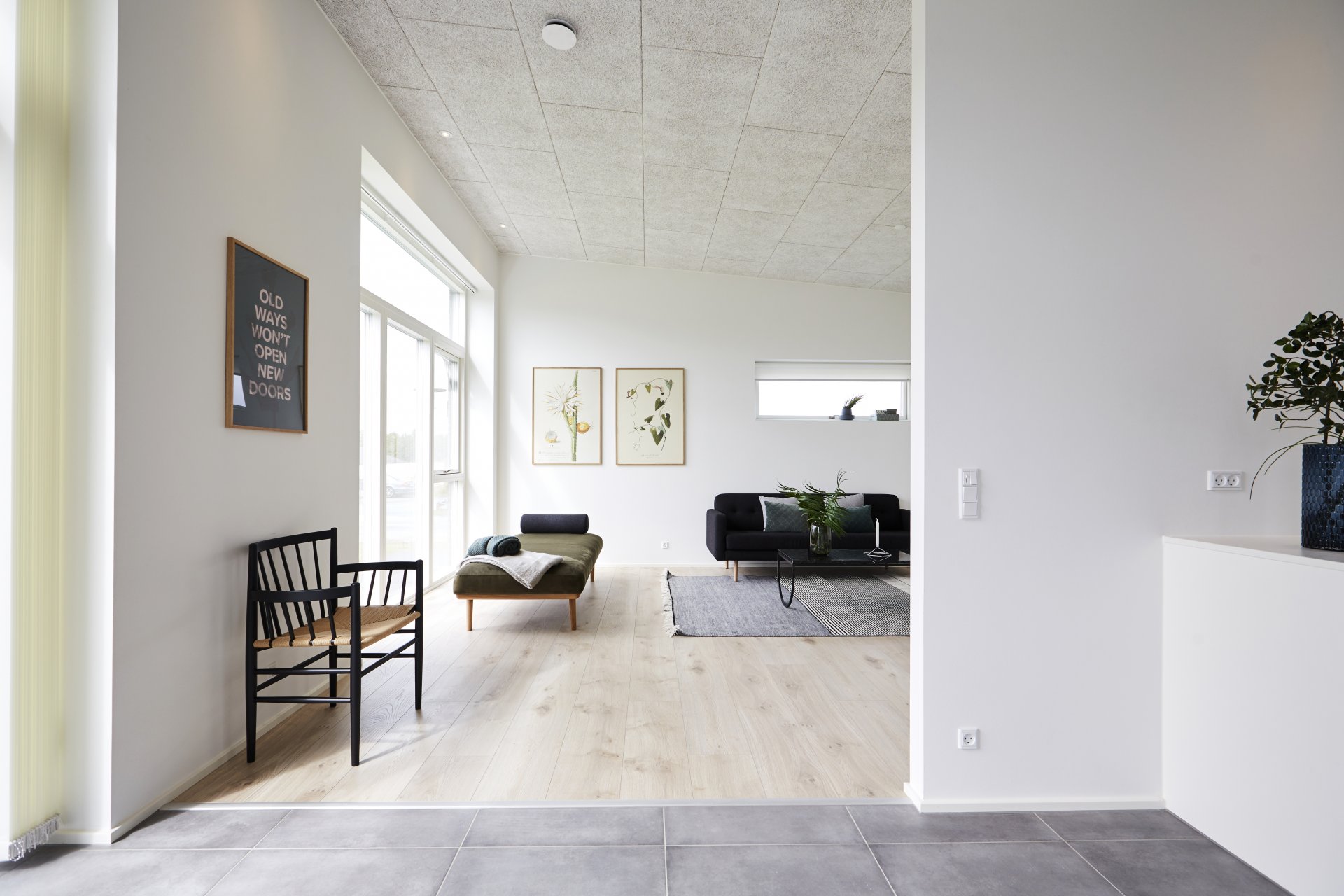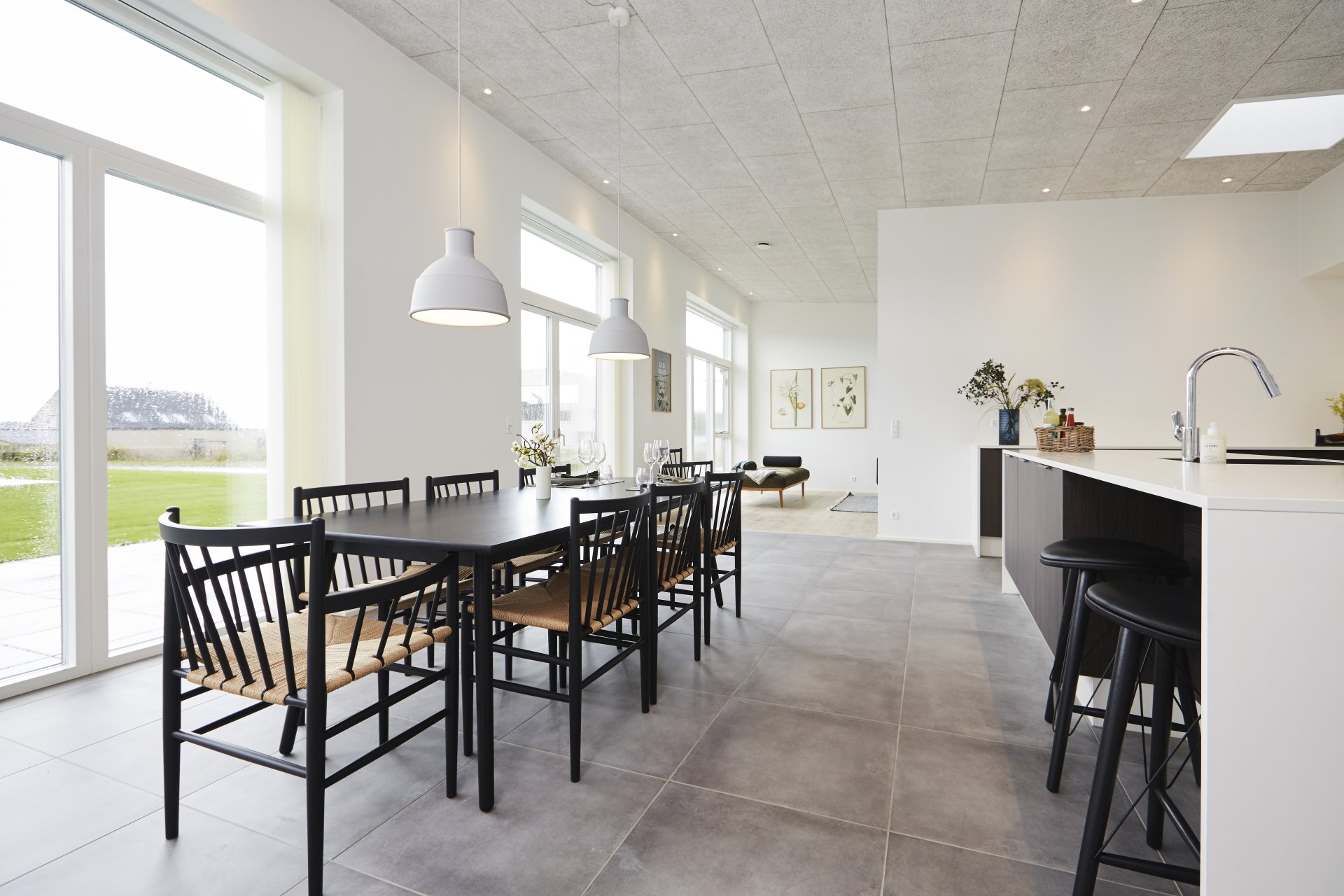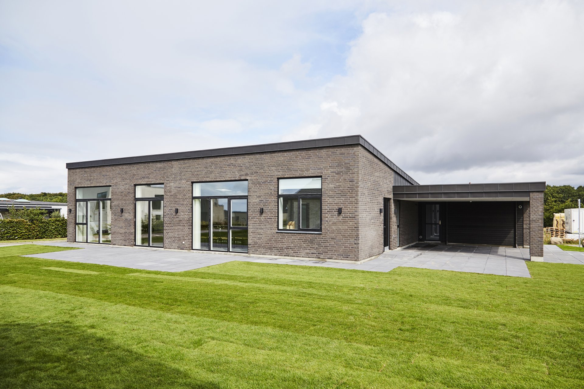 Gennemgående skrålofter, stort køkken/alrum, fritstående badekar og fladtags carport.