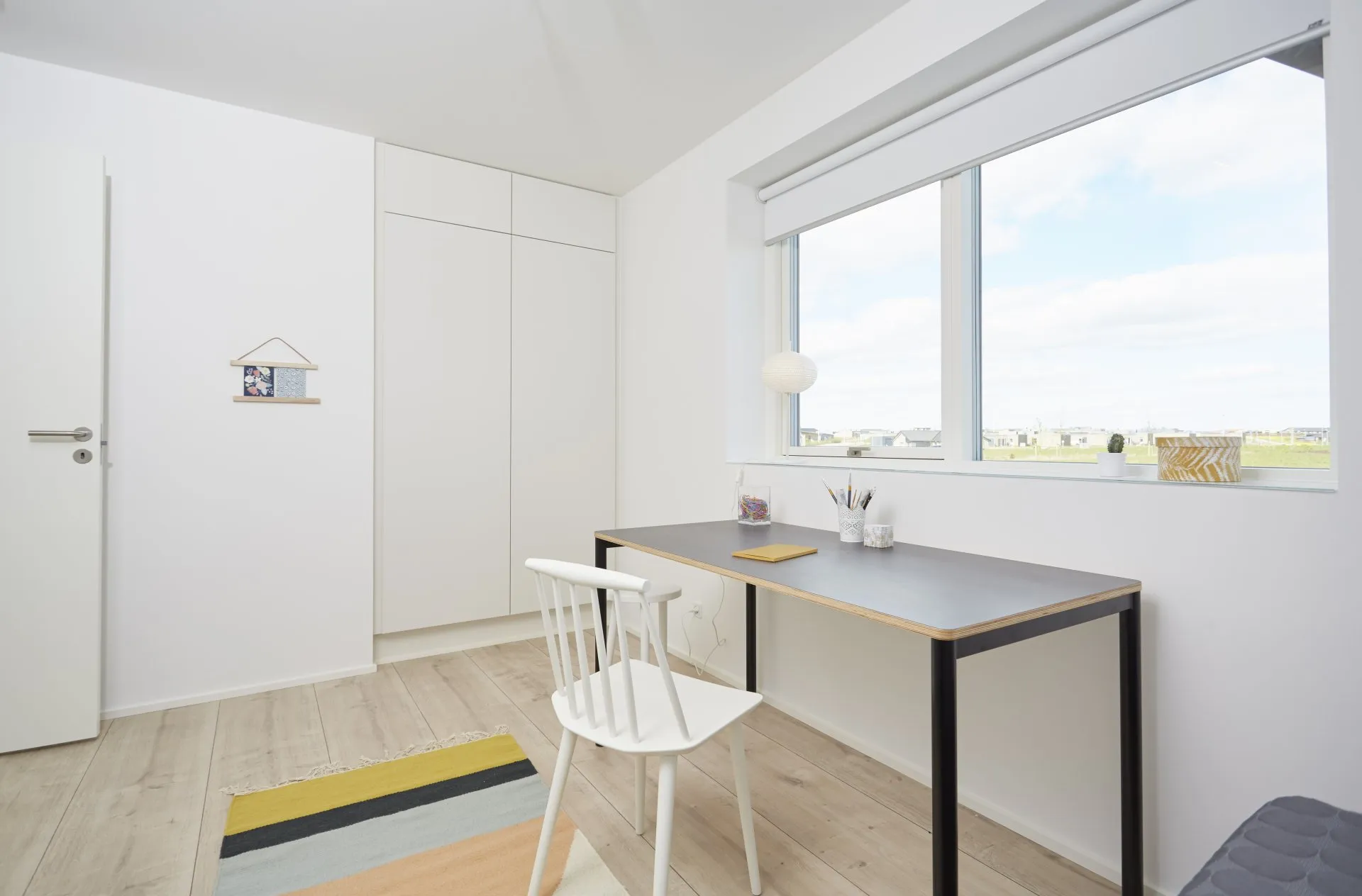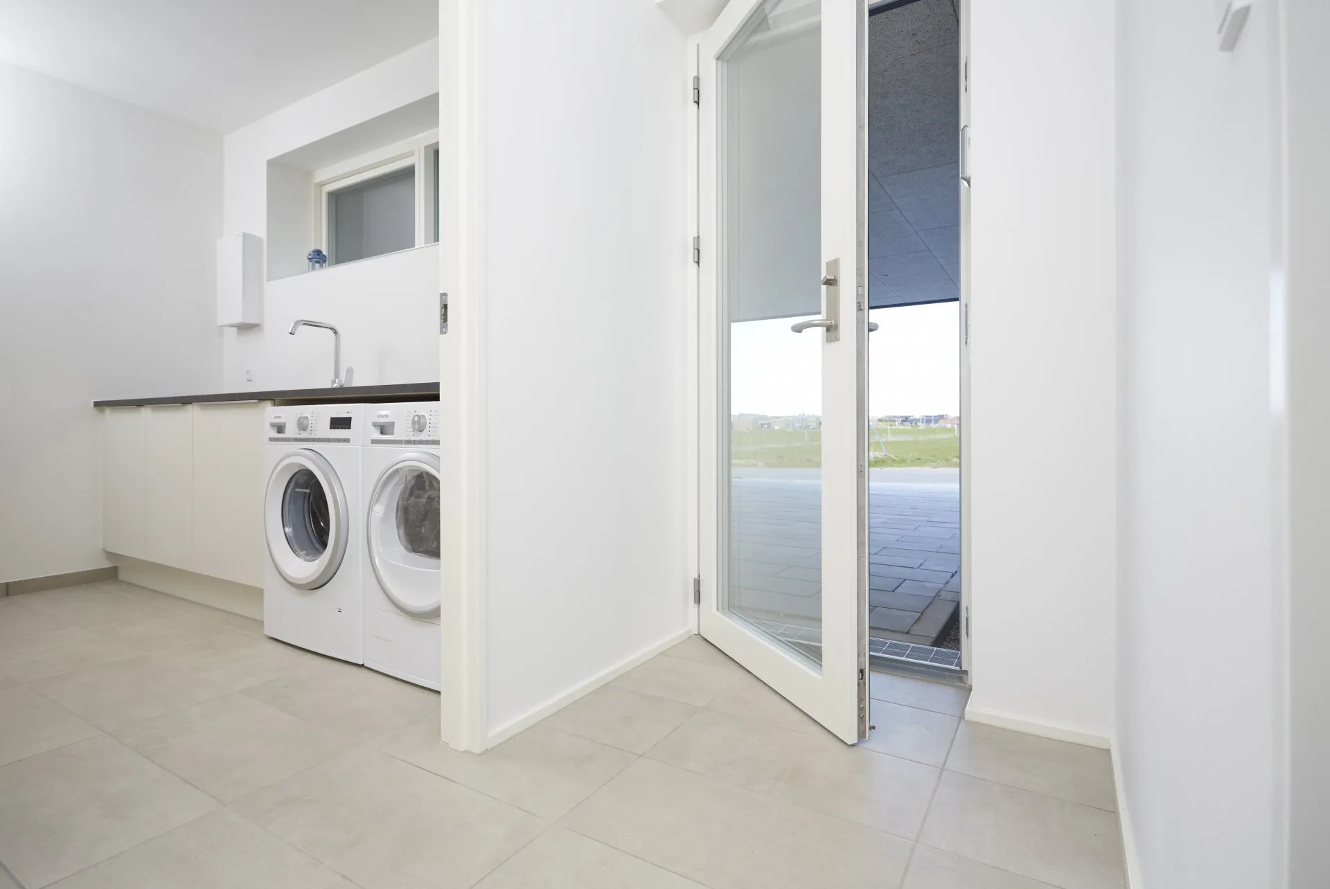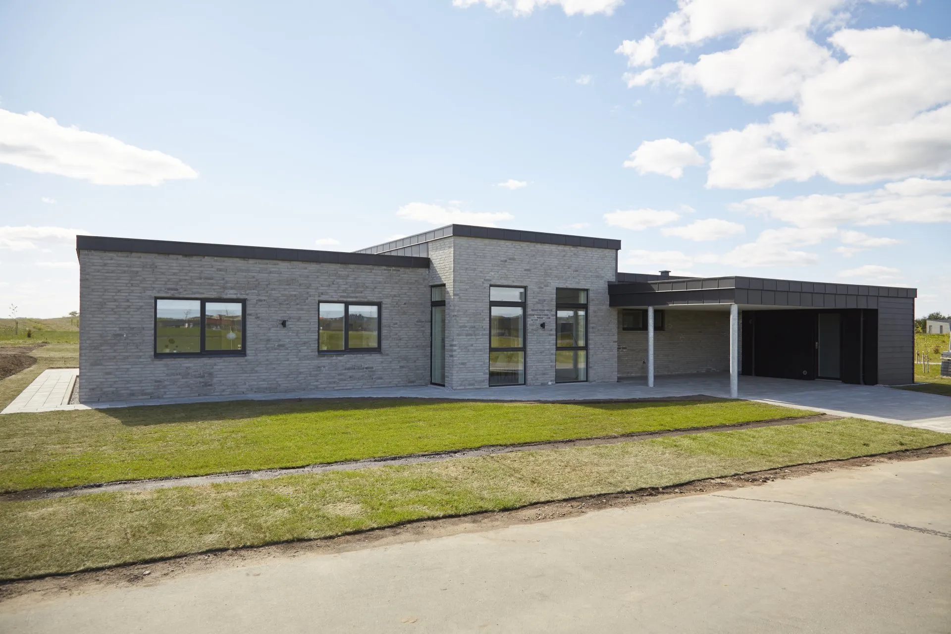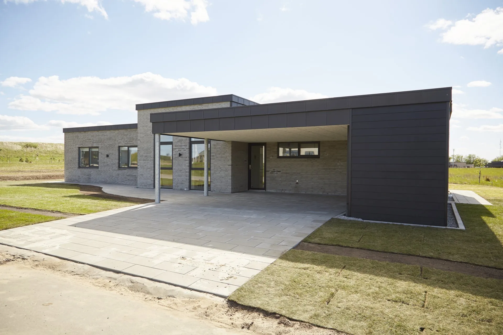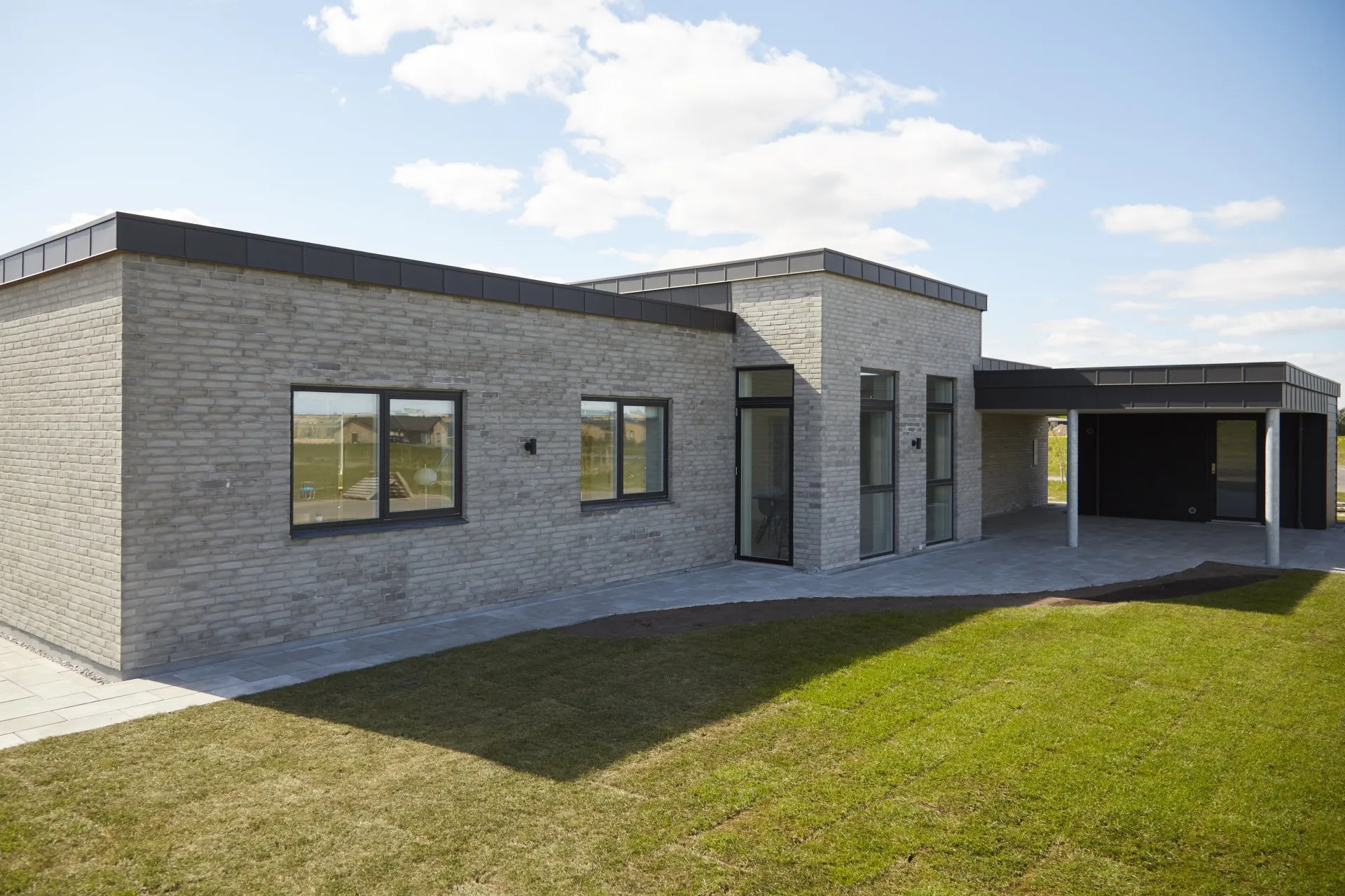 Overdækket terrasse, indbyggede skabe, påklædningsgang og flad carport.