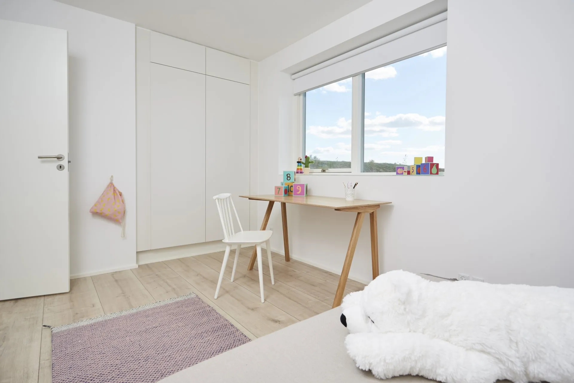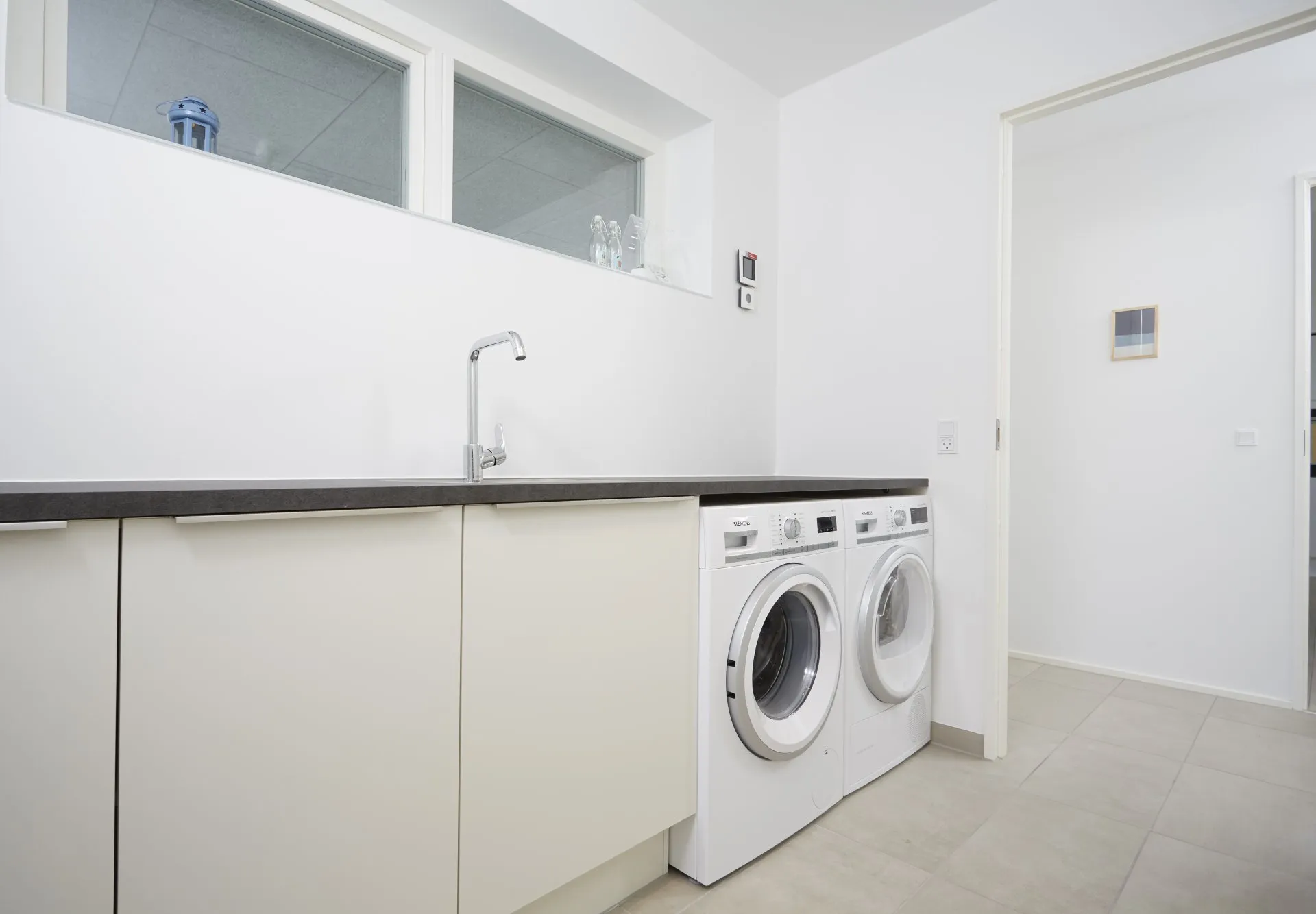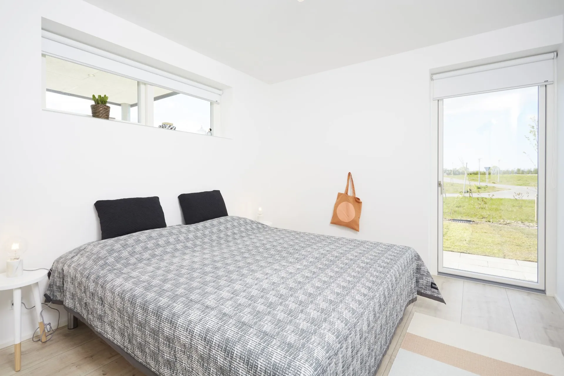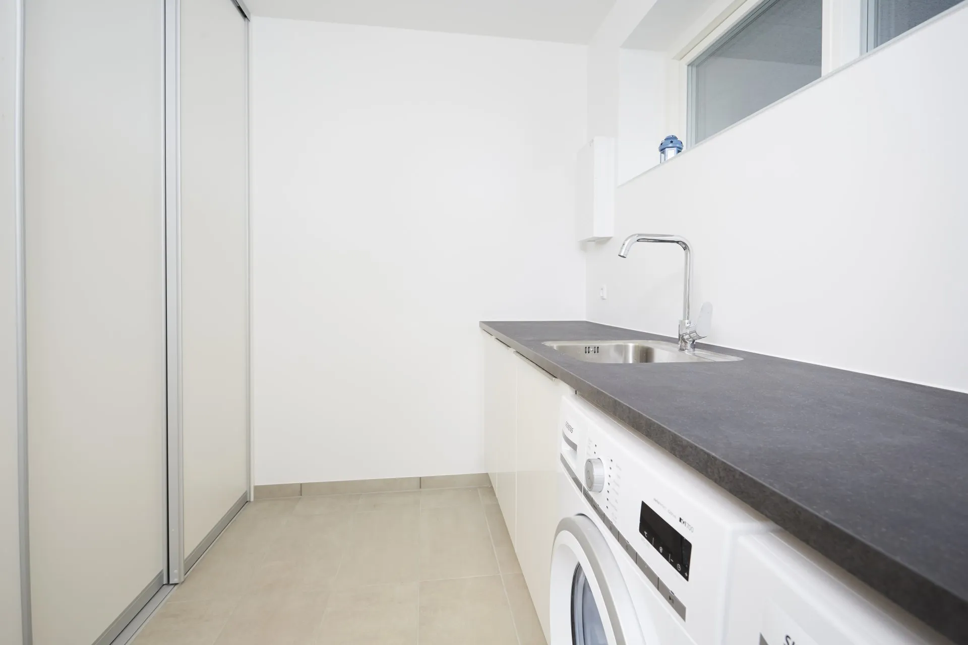 Overdækket terrasse, indbyggede skabe, påklædningsgang og flad carport.