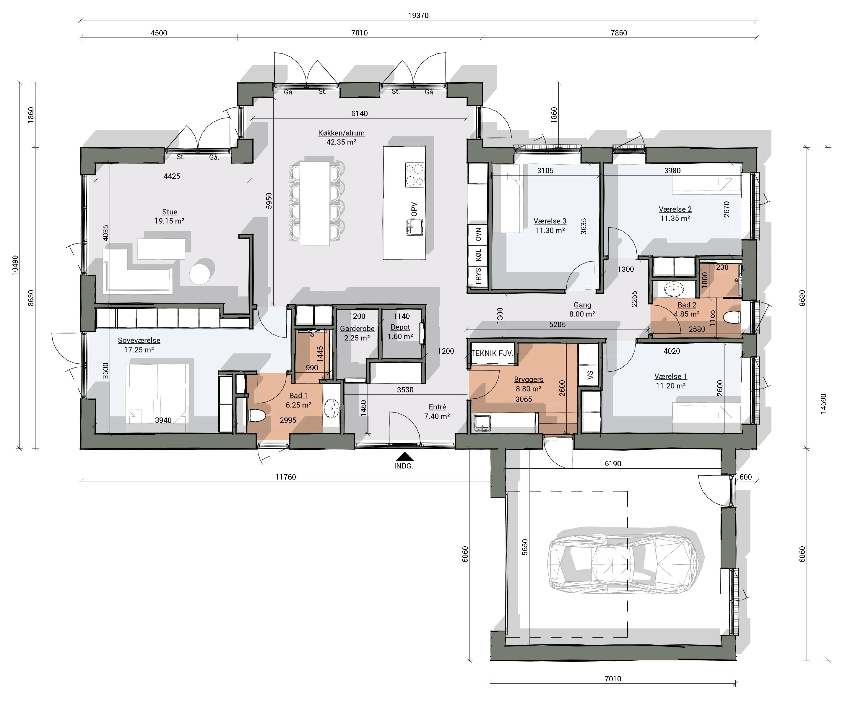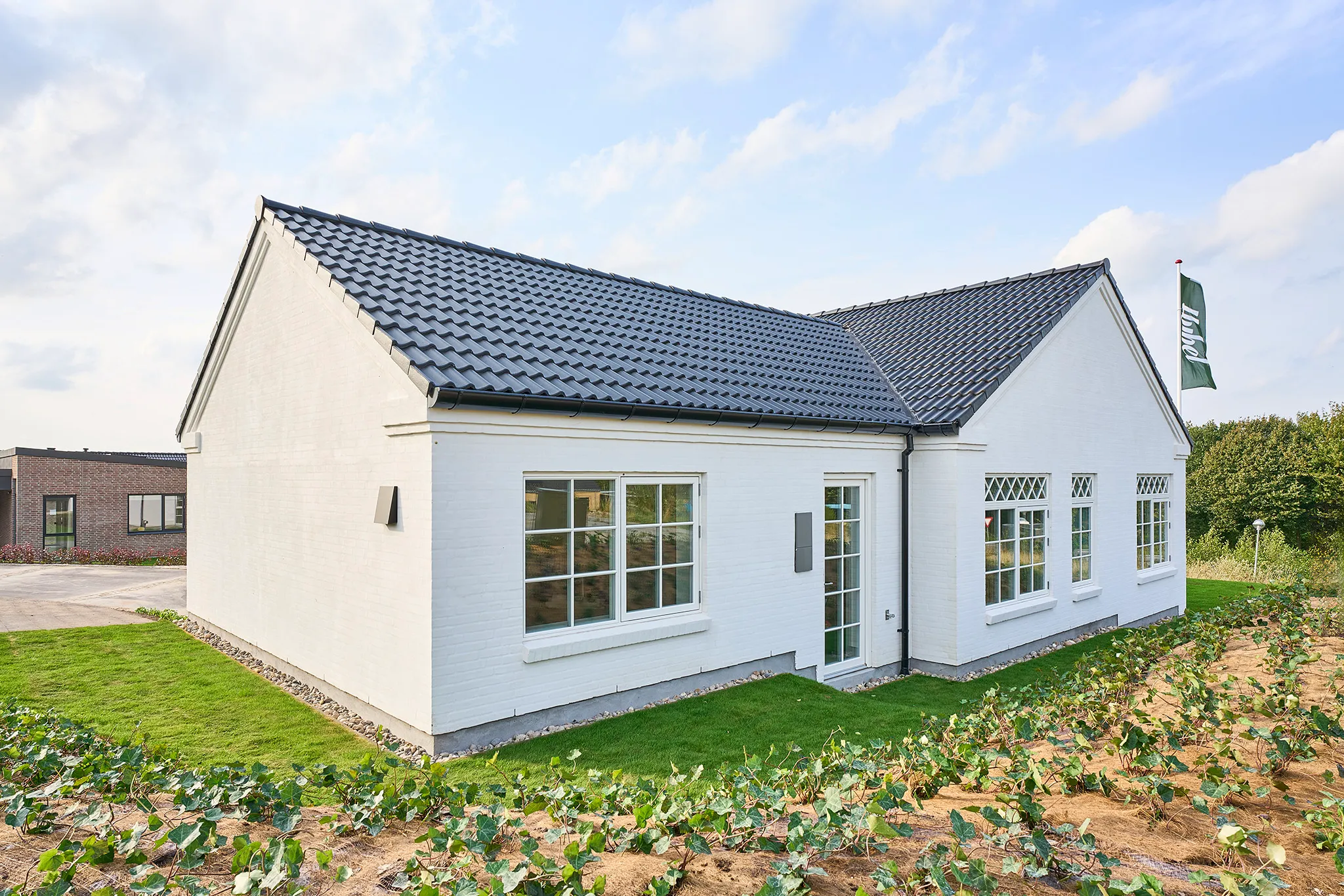 Ensidig tagkonstruktion med mere bolig og mindre gang, indbygget reol i stuen, teknikrum med tørreplads, new Yorker-væg til kontor & store vinduespartier