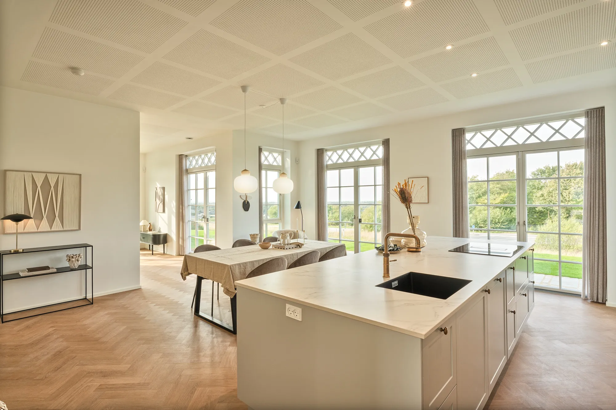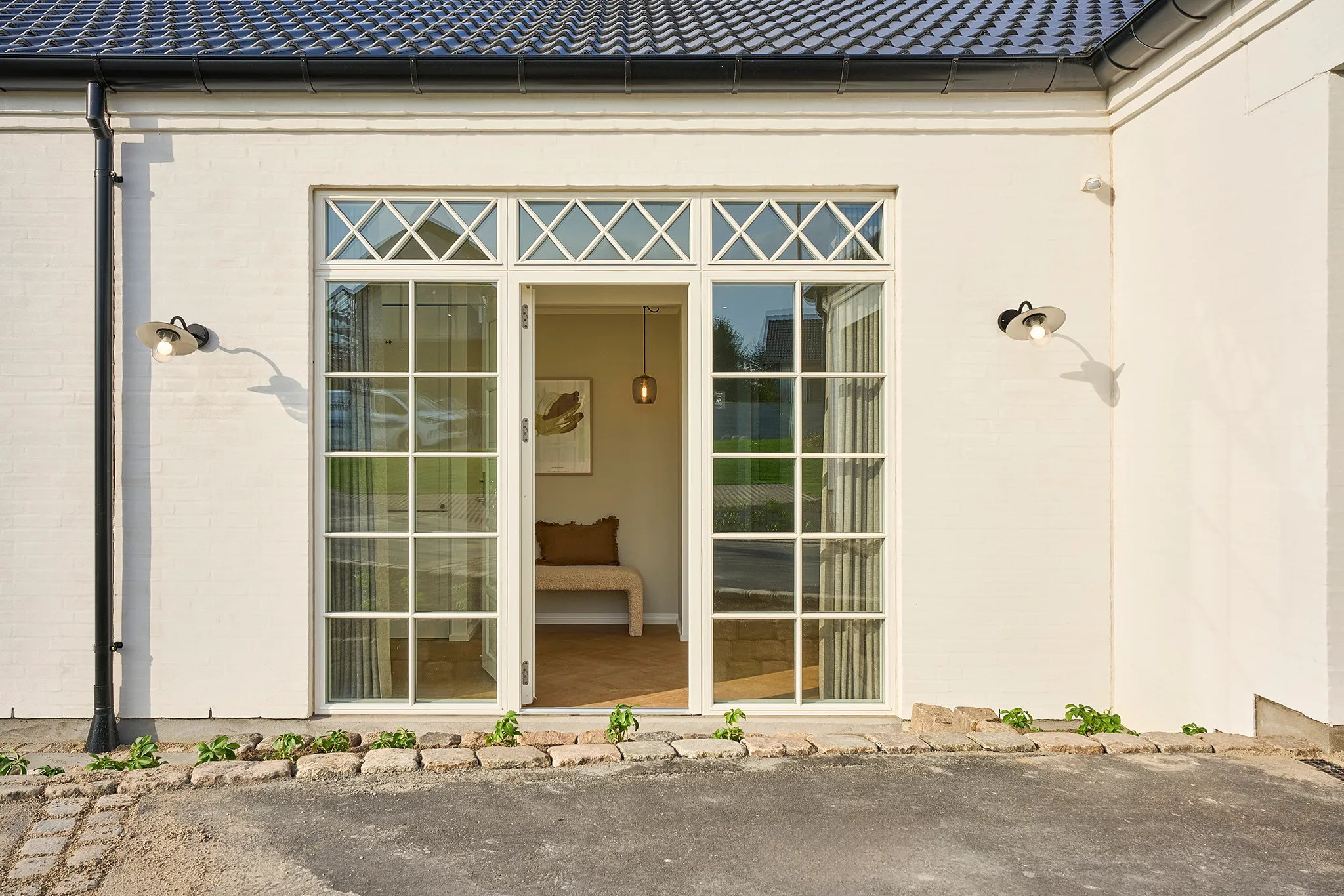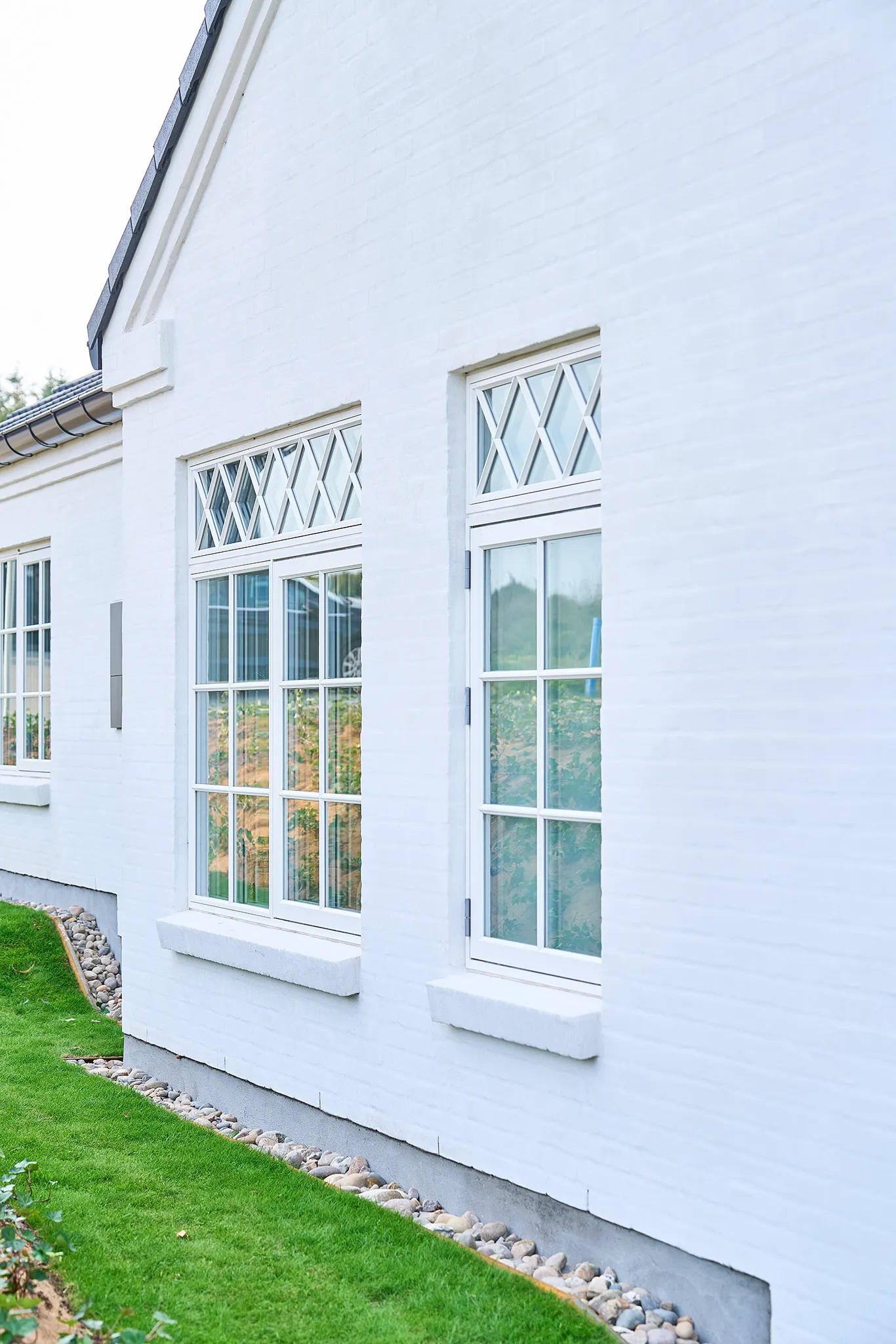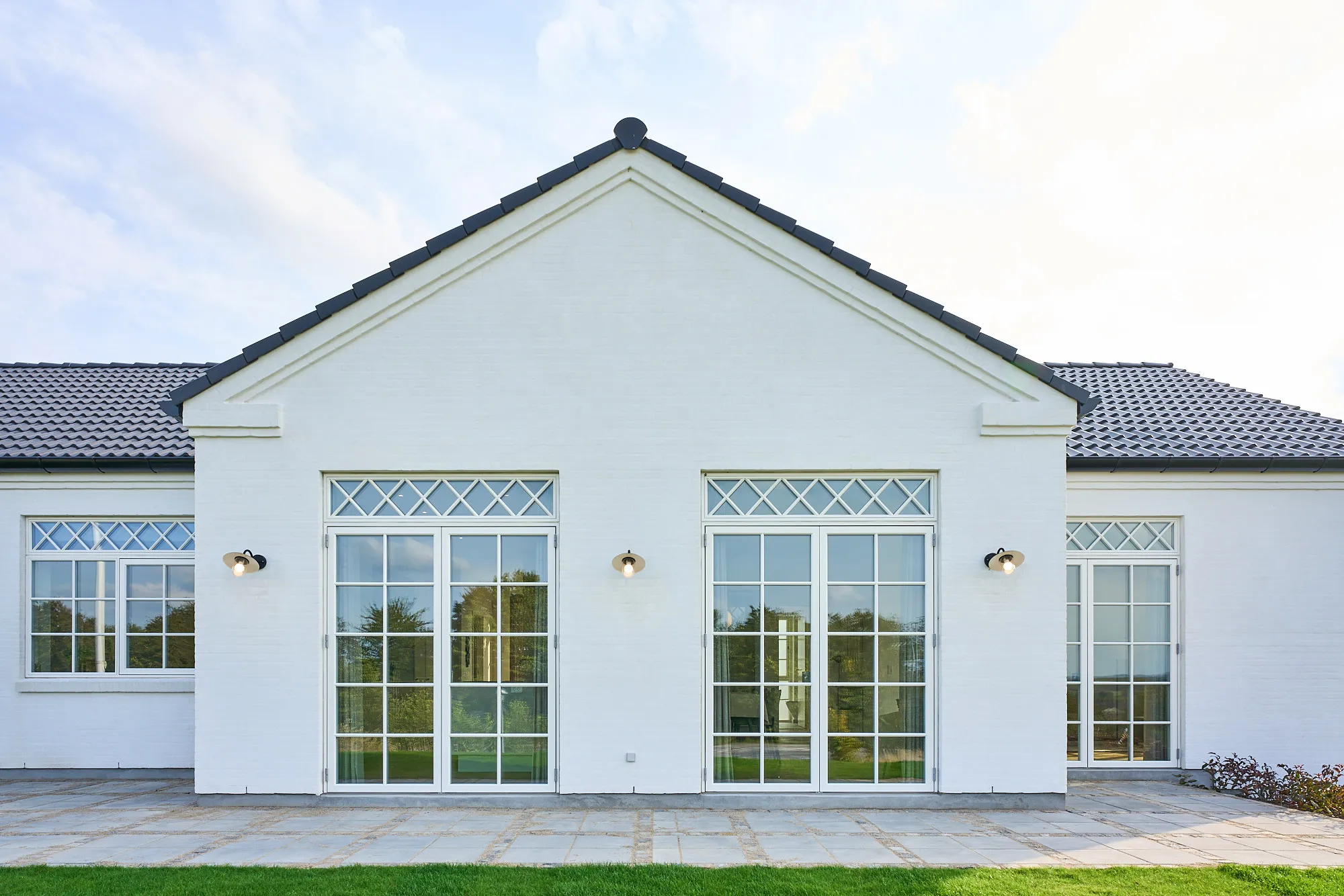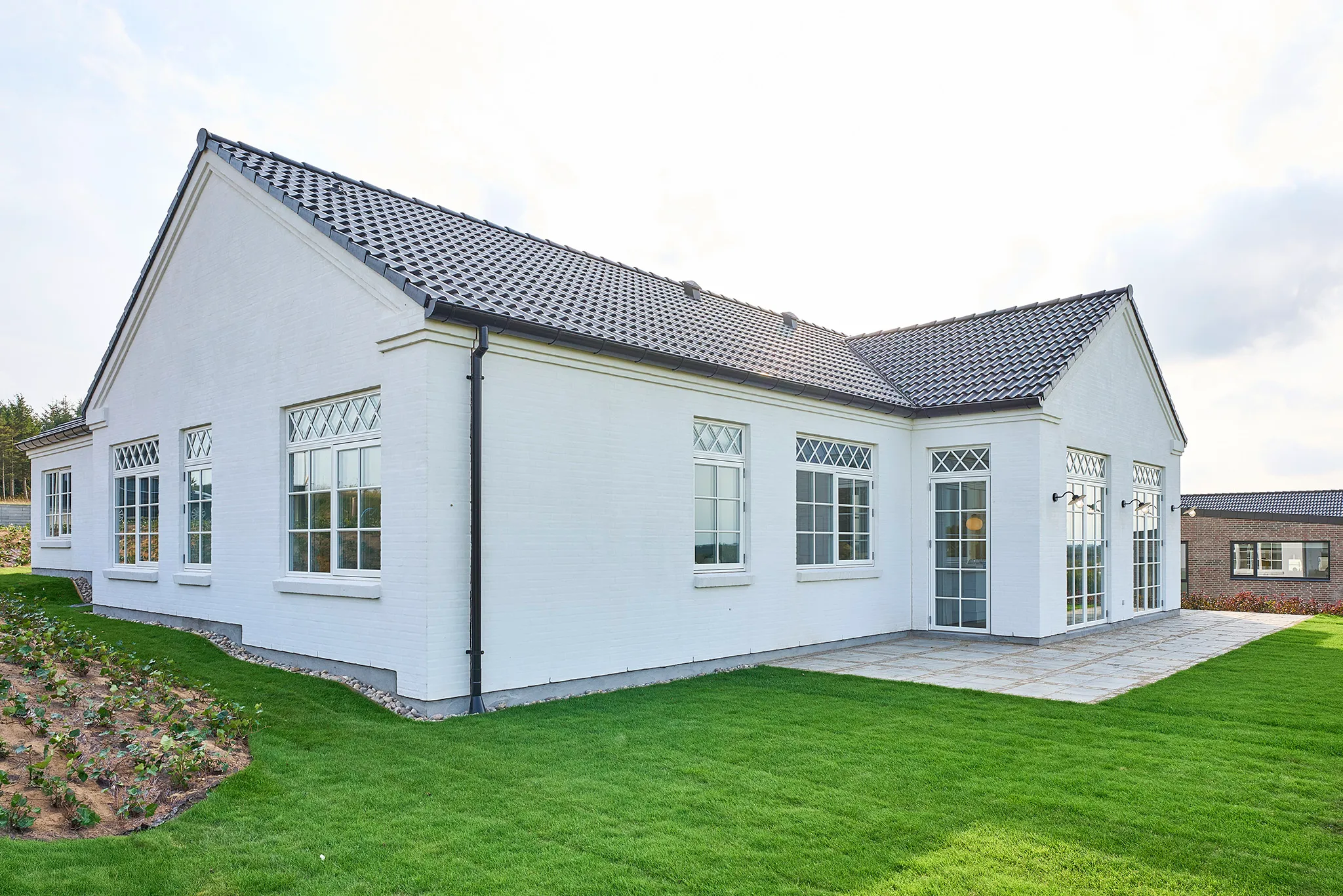 Klassisk palævilla, nyfortolket med moderne løsninger, gesims og vandskuret facade, bruneret messing i køkkenet, sprossevinduer og krydssprosser, øget loftshøjde på 2,82 meter, sildebensgulve, indbygget hjørnereol med fyldninger, skjult depot og skjult garderobe