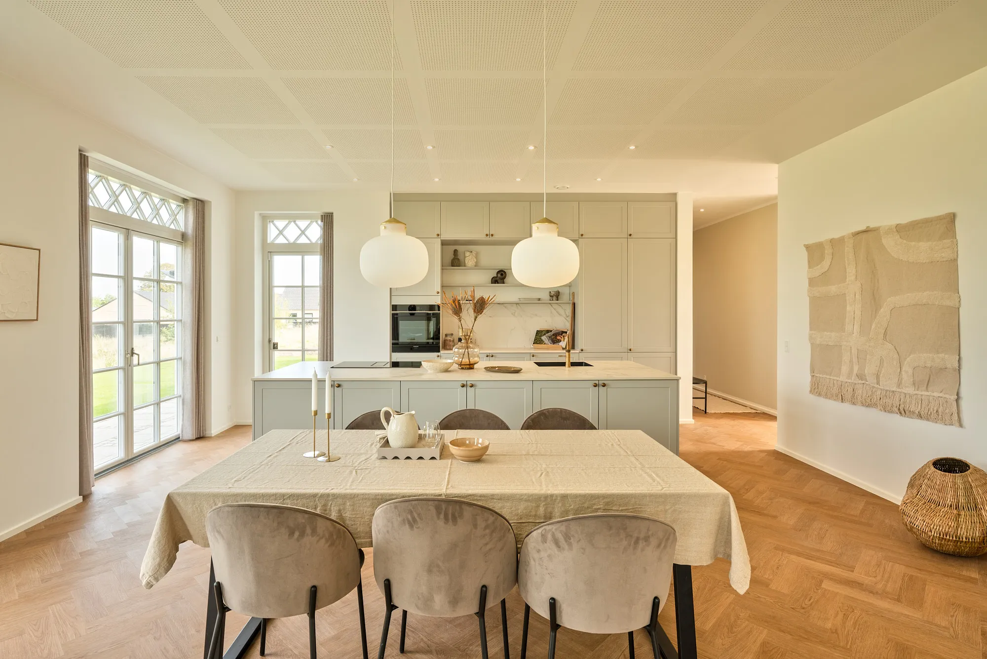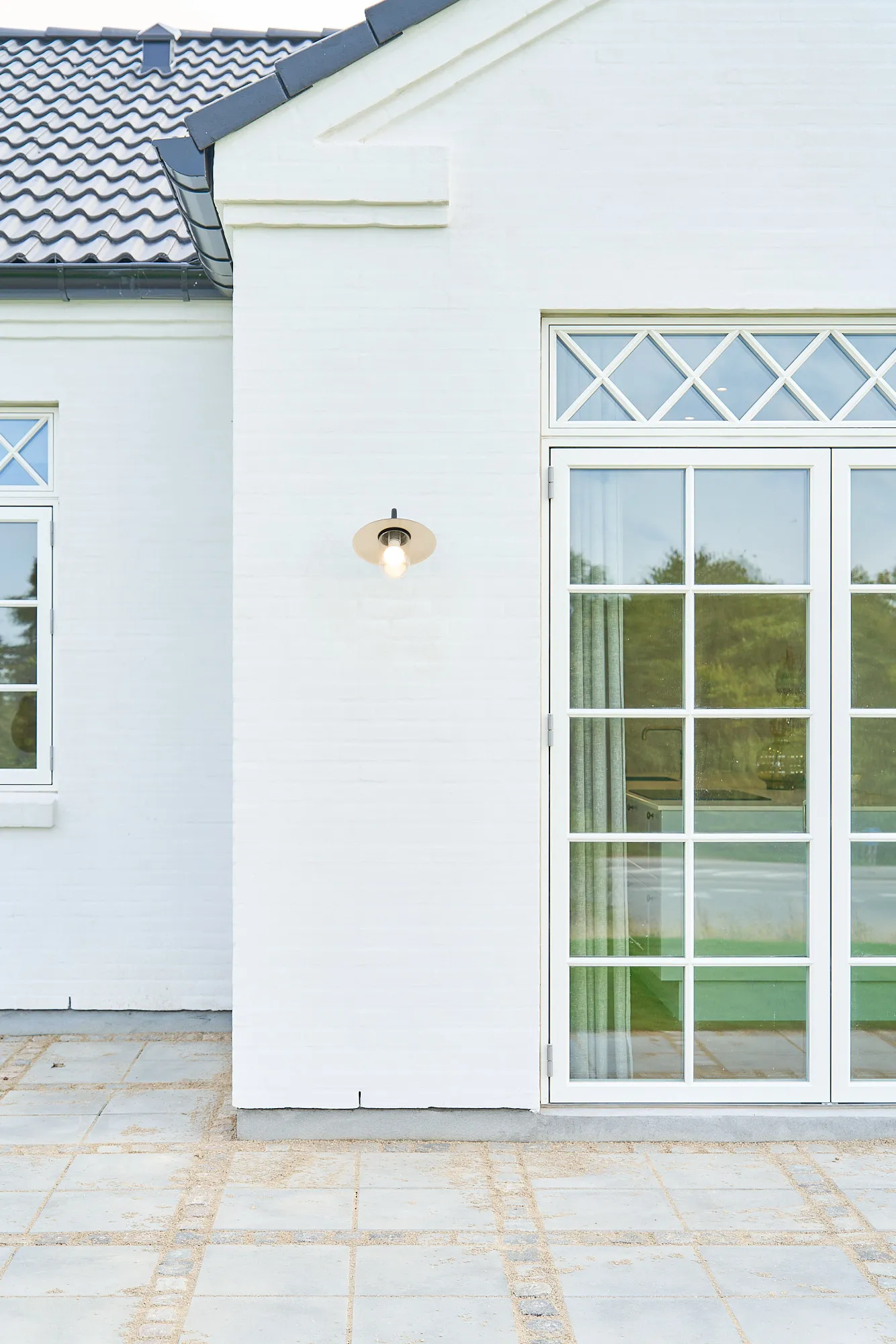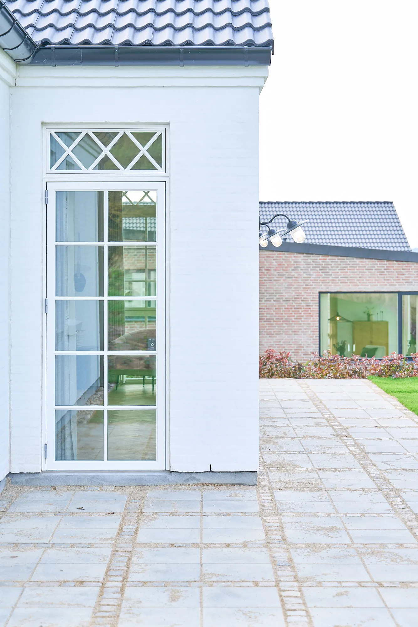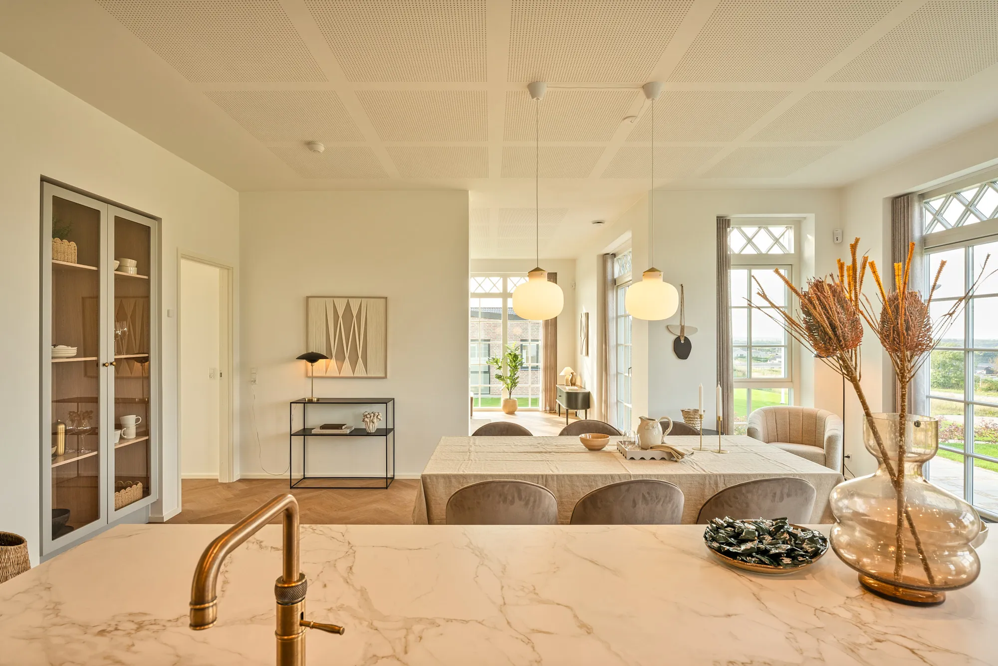 Klassisk palævilla, nyfortolket med moderne løsninger, gesims og vandskuret facade, bruneret messing i køkkenet, sprossevinduer og krydssprosser, øget loftshøjde på 2,82 meter, sildebensgulve, indbygget hjørnereol med fyldninger, skjult depot og skjult garderobe